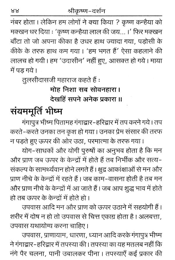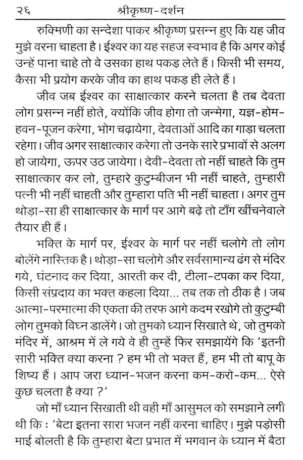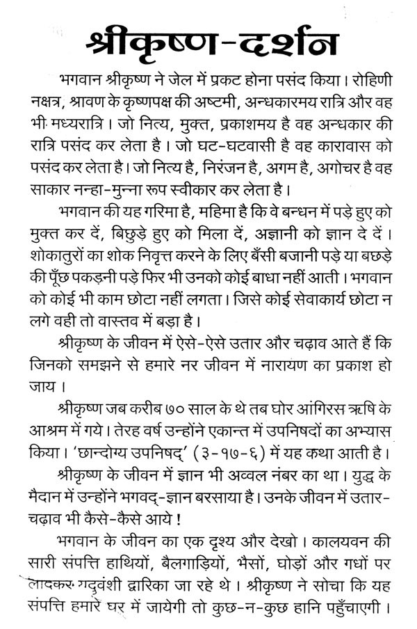 आज हम सब भी रजो-तमोगुणी वातावरण में पनपे हैं और घसीटे जा रहे हैं। भीतर विकारों-आकांक्षाओं का युद्ध मचा है। इस समय श्रीकृष्ण की लीला, चरित्र, ज्ञानोपदेश, प्राणोपासना, जीवनयोग और विभिन्न प्रसंगों पर अनुभव-प्रकाश डालते हुए प्रातः स्मरणीय पूज्यपाद संत श्री आसारामजी बापू ने आज के मानव की आवश्यकता अनुसार पथ-प्रदर्शन किया है।