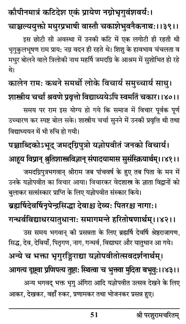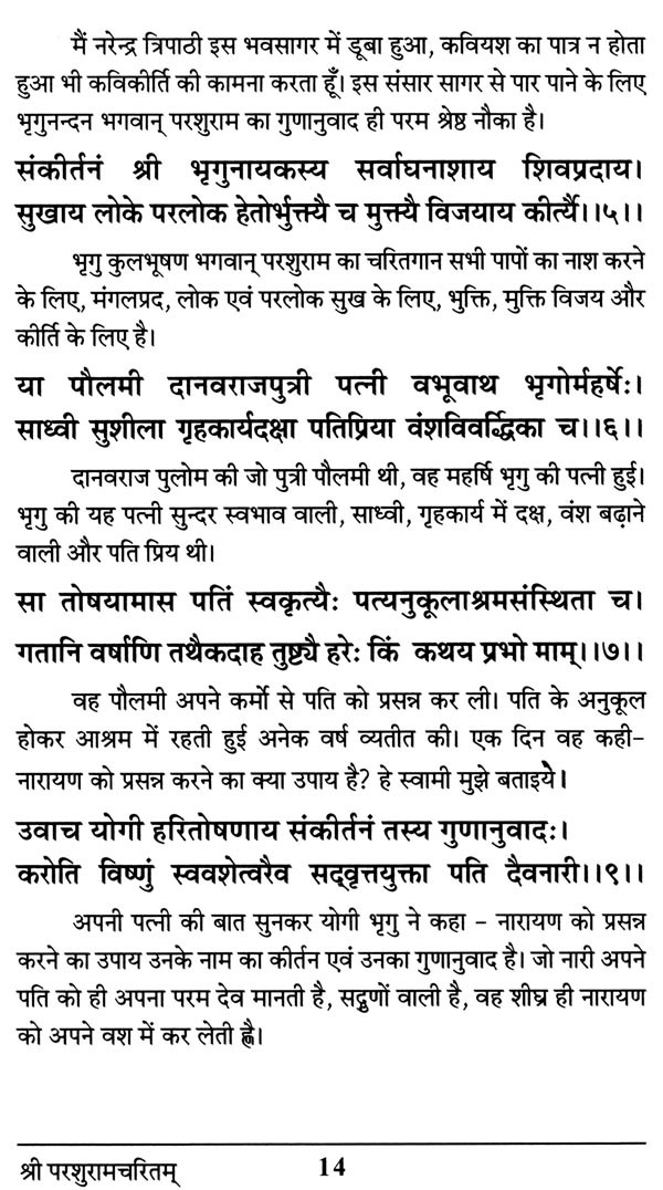 अपारकाव्यसंसार में अपनी अलौकिक कारयित्री प्रतिभा रूपी नौका पर समारुढ कवि की सतर्क दृष्टि में सबका स्थान सुरक्षित है। गहन गह्वर के अन्धकार को भी सद्यः प्रकाशित करने वाली सूर्यश्मियों की ही तरह अब तक नूतन कल्पनाविष्ट भगवान् परशुराम का लोकातिशायी चरित्रवर्णन प्रायः अस्पृष्ट ही रहा है। इसकी पूर्ति आदरणीय डॉ. नरेन त्रिपाठी की लेखनी के द्वारा की गयी है। एक महाकवि ने धनिकों भूपतियों को भी सावधान करते हुए कहा है कि लंकापति महापंडित रावण जी का लोकनिन्द्य चरित्र तथा अयोध्यापति दशरथनन्दन श्रीराम का उज्जवलयश दोनों के प्रथमाविष्कर्ता आदिकवि वाल्मीकि ही हैं। अब तक दशावतार में भगवान् परशुराम क्षत्रियधर्मी, शास्त्रास्त्र मर्मज्ञ, तीक्ष्ण क्रोधानल से सततप्रदीप्त रूप में ही जाने गये हैं। इस ग्रन्थ में डॉ. त्रिपाठी जी ने उन्हें महान् योगी पितृआज्ञा परिपालक, आदर्श पुत्र रूप में दिखाये हैं। श्रीमद्भागवत के अनुसार उत्तमपुत्र वही है जो माता पिता की आन्तरिक इच्छा को बिना कहे ही परखकर उसे पूर्ण कर दे। पितृ भक्ति का ऐसा विलक्षण उदाहरण अप्राप्त है। वर्ण नीय चरित्र को सर्वात्मना प्रशस्त बनाकर लोकशिक्षण हेतु आदर्शरूप देने की कला का, यह काव्य, उत्तम उदाहरण है।