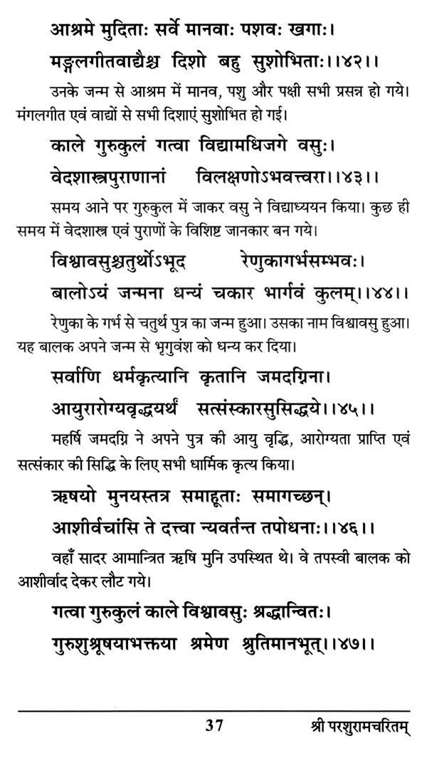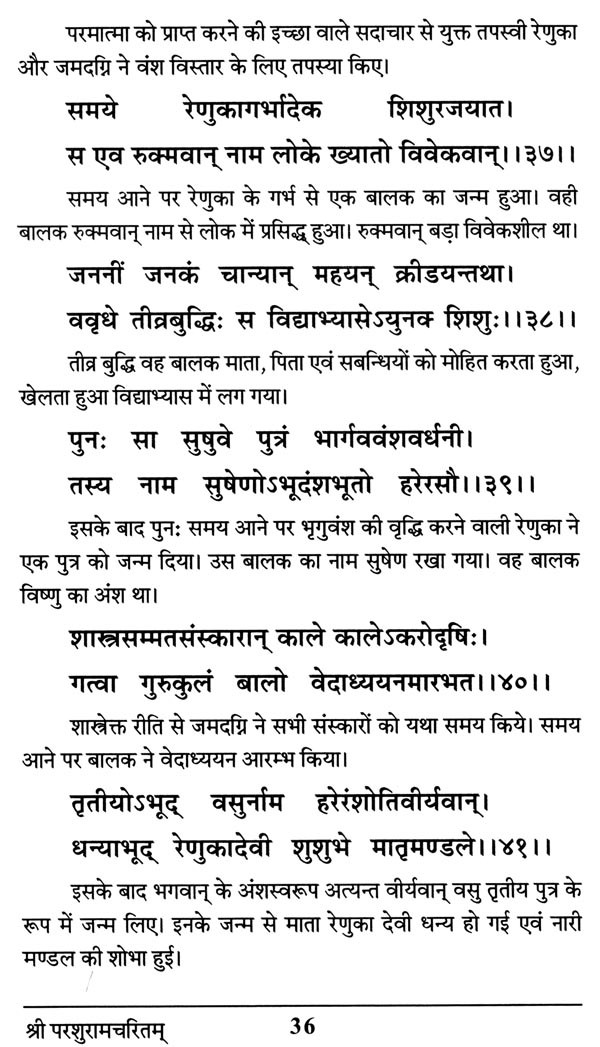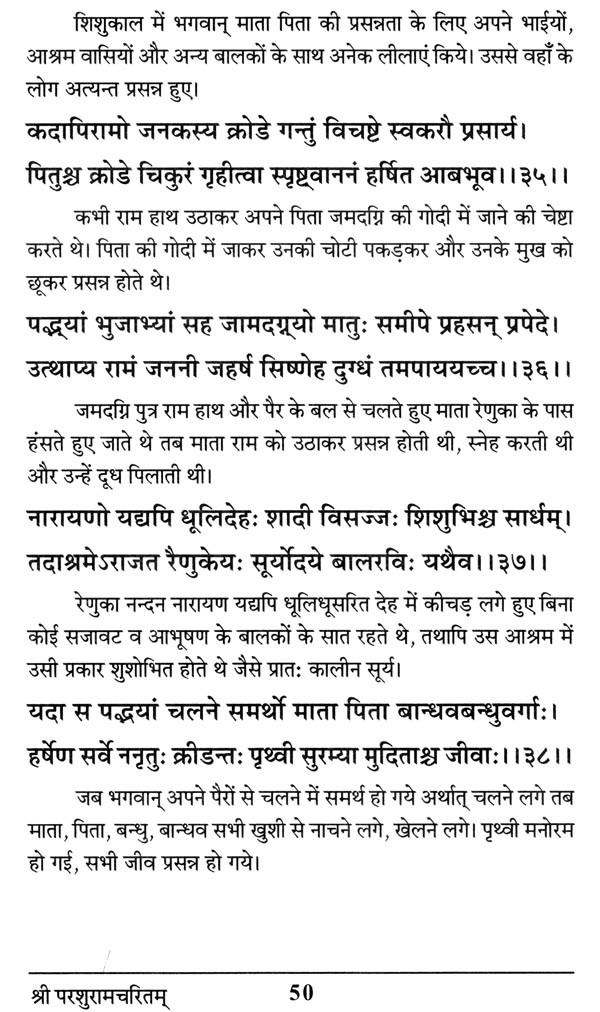 महान चरित्रों का सब कुछ विलक्षण होता है। उनका जन्म, कर्म तप उपकार सेवा, सामर्थ्य आदि लोकोत्तर ही रहता है। आचार्य त्रिपाठी जी ने प्रथम सर्ग से ही उनके इस लोकातिशायी स्वरूप को प्रस्तुत किया है। महर्षि ऋचीक ने चन्द्रवंशी राजा गाधि से उनकी कन्या सत्यवती को विवाहार्थ प्रस्ताव रखा। पहले तो उन्होंने असहमति दिखायी, पुनः ऋषि को स्वानुकूल पाकर उन्होंने अपनी कन्या प्रदान की। भृगुपुत्र ऋचीक ने अपने पिता से तेजस्वी सन्तति की कामना प्रकट की। महात्मा भृगु नें उन्हें उदुम्बर वृक्ष के आलिंगन की बात बतायी। विष्णु पूजन के बाद सिद्ध पायस तैयार किया गया। उसके दो भाग करके एक में क्षात्रतेज एवं दूसरे में ब्राह्म तेज का आधान किया पायस खाने के समय गधिपत्नी ने पायस का विनिमय कर दिया तथा अपना क्षात्रधर्मी पायस पुत्री सत्यवती को दे दिया ऋचीक को यह ज्ञात हो गया। उन्होंने श्री विष्णु को प्रसन्न करके उभय पक्ष के मंगल की कामना प्रकट की। प्रसन्न नारायण ने वैसा ही वर दिया तथा स्वयम् अवतरित हुए। पायस के प्रभाव से सत्यवती को जमदग्नि की प्राप्ति हुई। इन्हीं जमदाग्नि से भगवान् क्षात्रधर्मसम्पन्न महायोगी परशुरामके रूप में अवतरित हुए। द्वितीय वर्ष में ऋषि रेणु की पुत्री रेणुका के साथ भगवान् जमदग्नि का विवाह वर्णित है। यहां कवि हृदय आचार्य त्रिपाठी की स्वदेश प्रेम का कुछ पक्षपात भी दिखायी देता है कि भृगुवंश के यश को प्रचरित करने वाली मासपर्यन्त मेला तथा धर्म संसद् की परम्परा भी वर्णित है। यहीं गुजरात आदि में भी भृगुवंशी परम्परा का पालन दिखाया गया है।