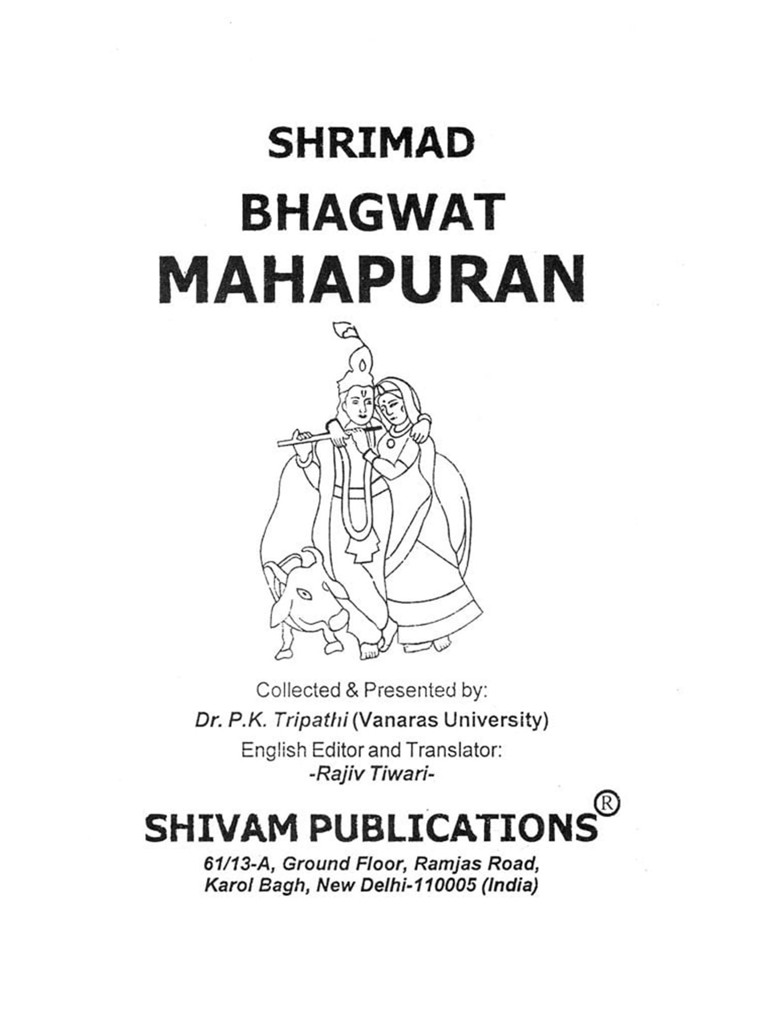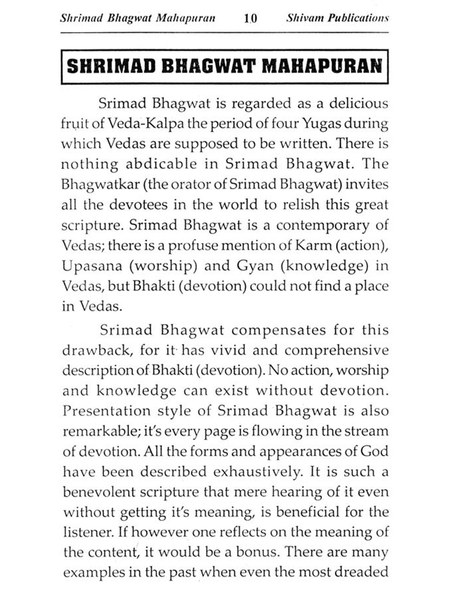 This book Shrimad Bhagwat Mahapuran. Srimad Bhagwat Mahapuran is regarded as sa delicious fruit of Veda- Kalpa the period of four Yugas Y during which Vedas are supposed to be written. There is nothing abdicable in Srimad Bhagwat. The Bhagwatkar (the orator of Srimad Bhagwat) invites all the devotees in the world to relish this great scripture. Srimad Bhagwat is a contemporary of Vedas; there is a profuse mention of Karm (action), Upasana (worship) and Gyan (knowledge) in Vedas, but Bhakti (devotion) could not find a place in Vedas.