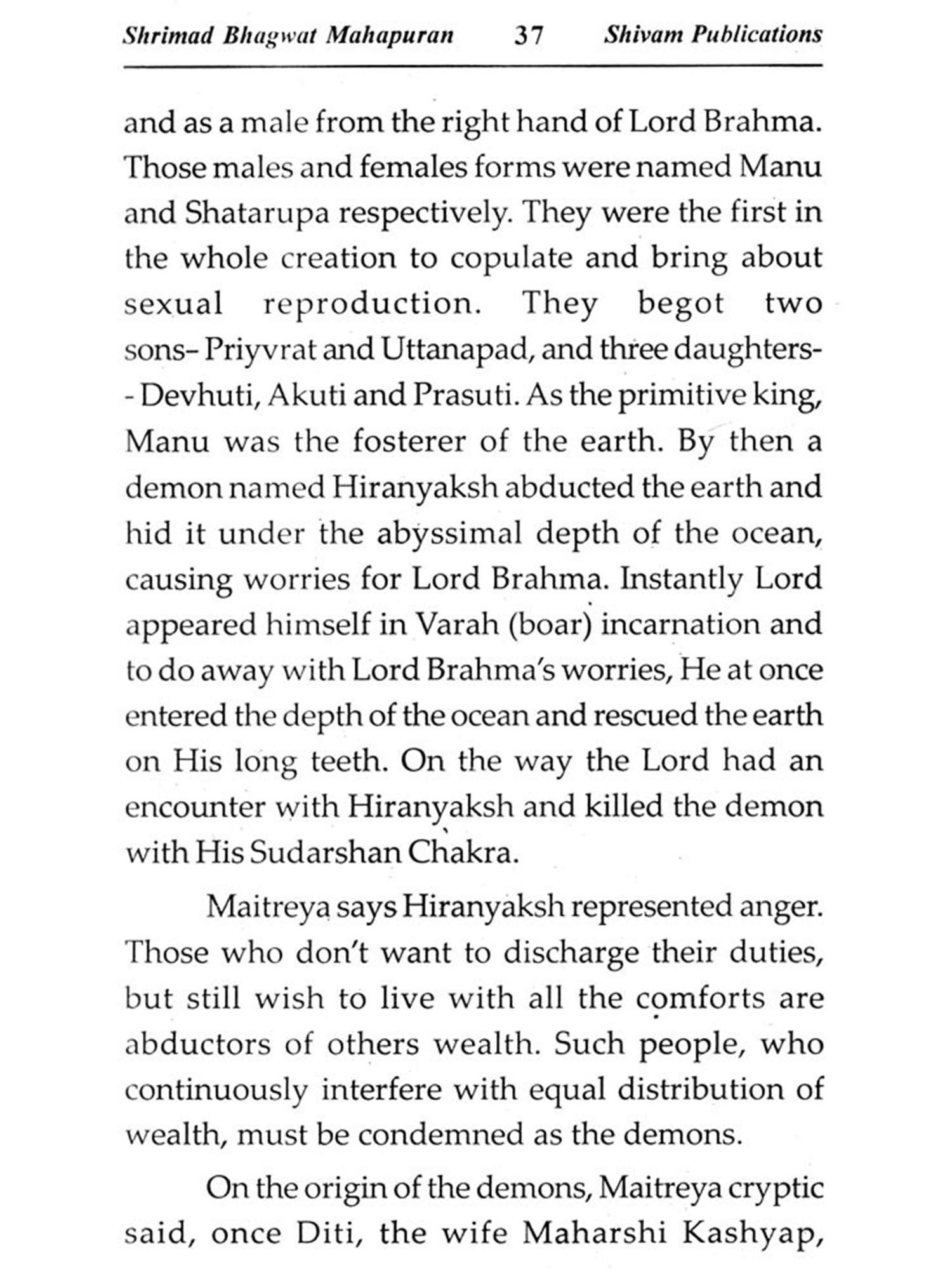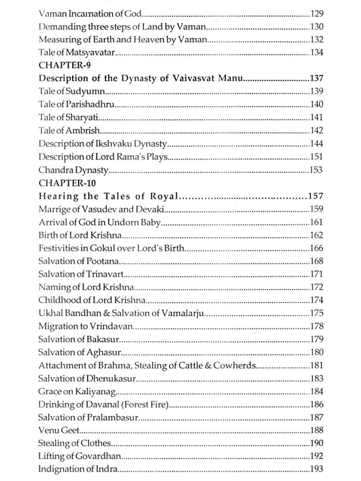 The greatest feature of Bhagwat is that it illustrates the mutual but eternal relationship of the Jivatma (microcosm) and Parmatma (the supreme sprit.) It also illustrates the selfless dedication of the devotees and unconditional love of God for His devotees. Thus it introduces one with oneself and hence leads him to salvation. The author has beautifully woven the plays of God into enticing tales with the help of the yarns of knowledge, devotion and action: