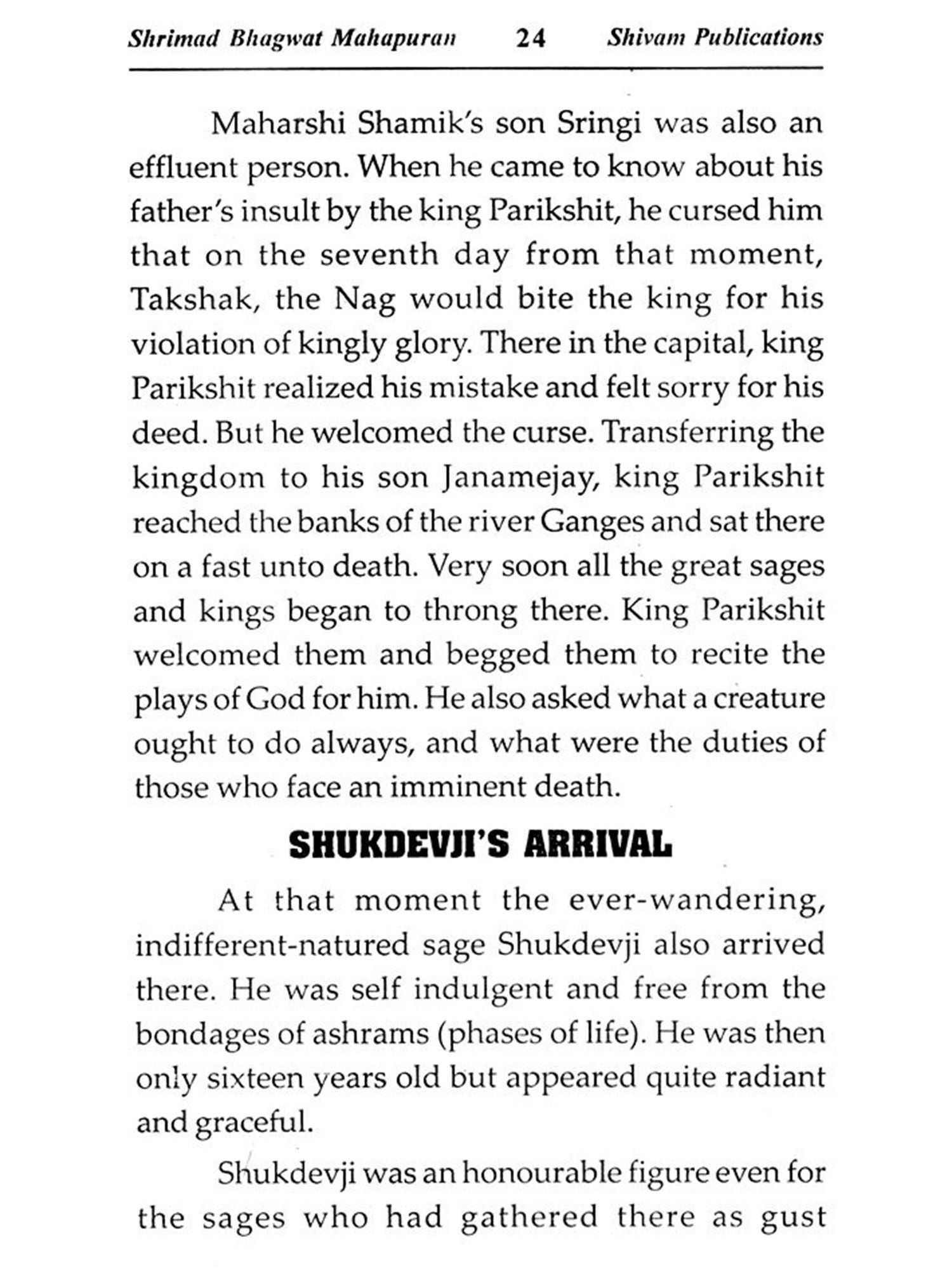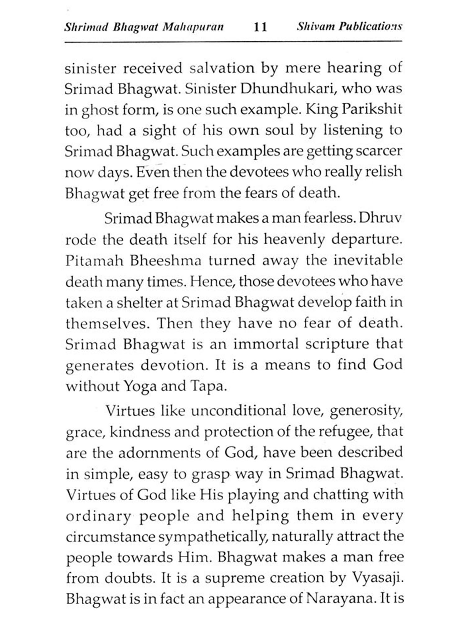 Srimad Bhagwat compensates for this drawback, for it has vivid and comprehensive description of Bhakti (devotion). No action, worship and knowledge can exist without devotion. Presentation style of Srimad Bhagwat is also remarkable; it's every page is flowing in the stream of devotion. All the forms and appearances of God have been described exhaustively. It is such a benevolent scripture that mere hearing of it even without getting it's meaning, is beneficial for the listener. If however one reflects on the meaning of the content, it would be a bonus. There are many examples in the past when even the most dreaded sinister received salvation by mere hearing of Srimad Bhagwat. Sinister Dhundhukari, who was in ghost form, is one such example. King Parikshit too, had a sight of his own soul by listening to Srimad Bhagwat. Such examples are getting scarcer now days. Even then the devotees who really relish Bhagwat get free from the fears of death.