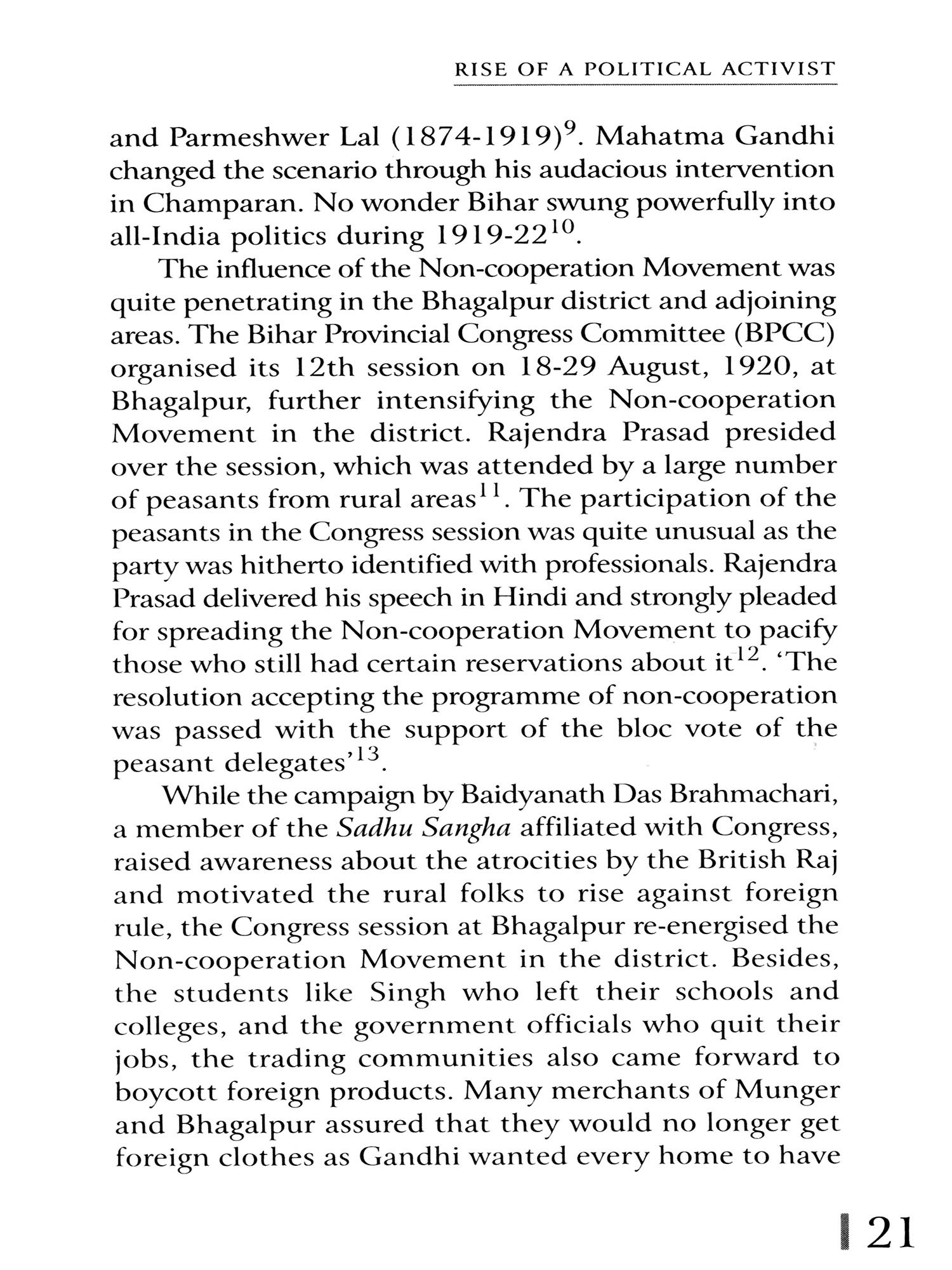 People of Bhagalpur supported the Swadeshi Movement in a big way by boycotting foreign clothes despite the repressive measures unleashed by the district administration. A new phase of nationalist movement began in India after 1918. Bhagalpur was caught right up in it. The youth of the district actively marched for the freedom of the nation. The first reported instance of resistance in Bhagalpur was in December 1918. Several arrests were made in Bhagalpur by the British India police on the charges of Bolpur conspiracy to destabilise the British Raj. A young man, Anath Bandhu Chaudhary, hailing from Bengal, was arrested in Bhagalpur under Section 12 A of the Defense of India Act. He accepted being an agent of the Bolpur conspiracy and that he was in the district to distribute leaflets related to the Swadhin Bharat movement 12. Nobel laureate Rabindranath Tagore protested against the arrest of Anath Bandhu Chaudhary, after which his case shifted to Bengal 13.
