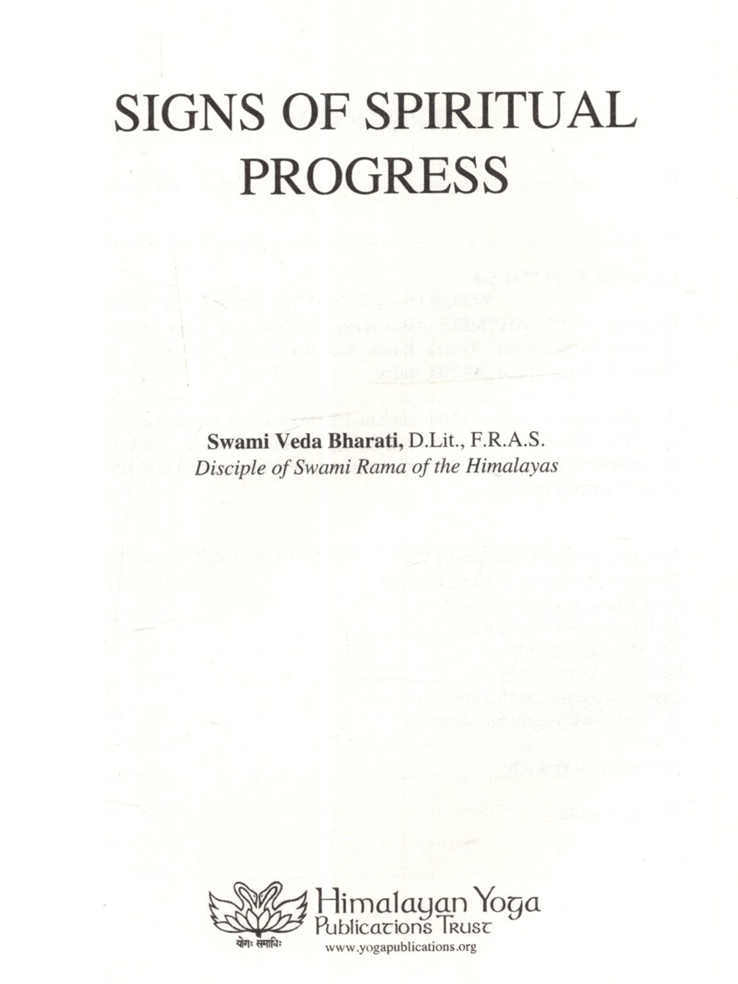 Signs of Spiritual Progress "There is no journey more interesting than your spiritual journey. For your worldly journeys you need to pay for a sea cruise, you need to buy airline tickets, you need to service your car, but this journey is free of charge. Everything is free of charge. The whole cosmos: free of charge. And I don't know why people don't take the offer." Speaking from the depths of personal experience, Swami Veda guides aspirants through an insightful journey of inner realms. Mastering the fundamentals, recognising the stations of spiritual attainments, avoiding pitfalls, are only some of the teachings in this book. The simple and straight-forward instruction enables you to separate the chaff from authentic experiences. This unique offering is a must-read for a true aspirant on the spiritual path.