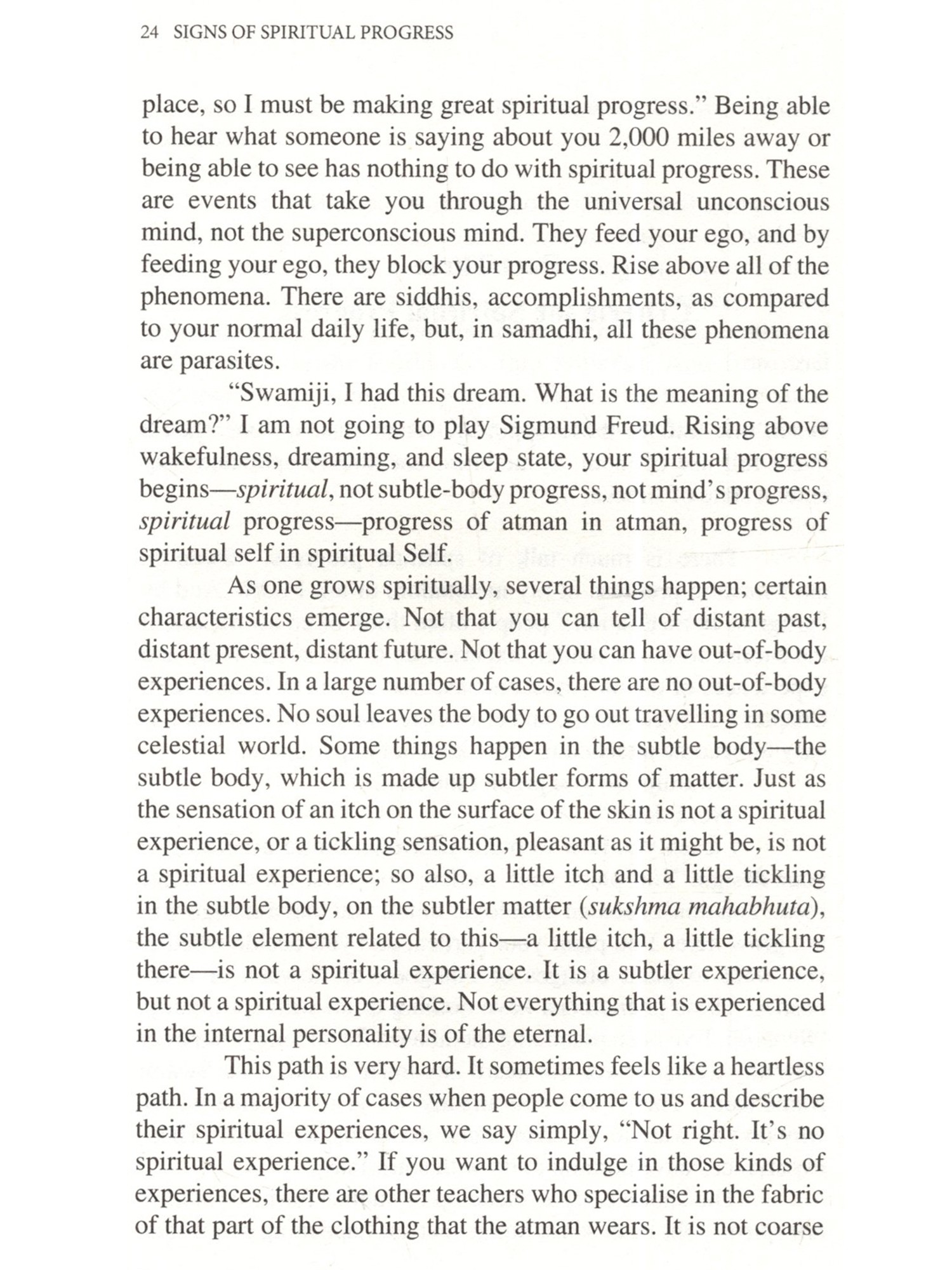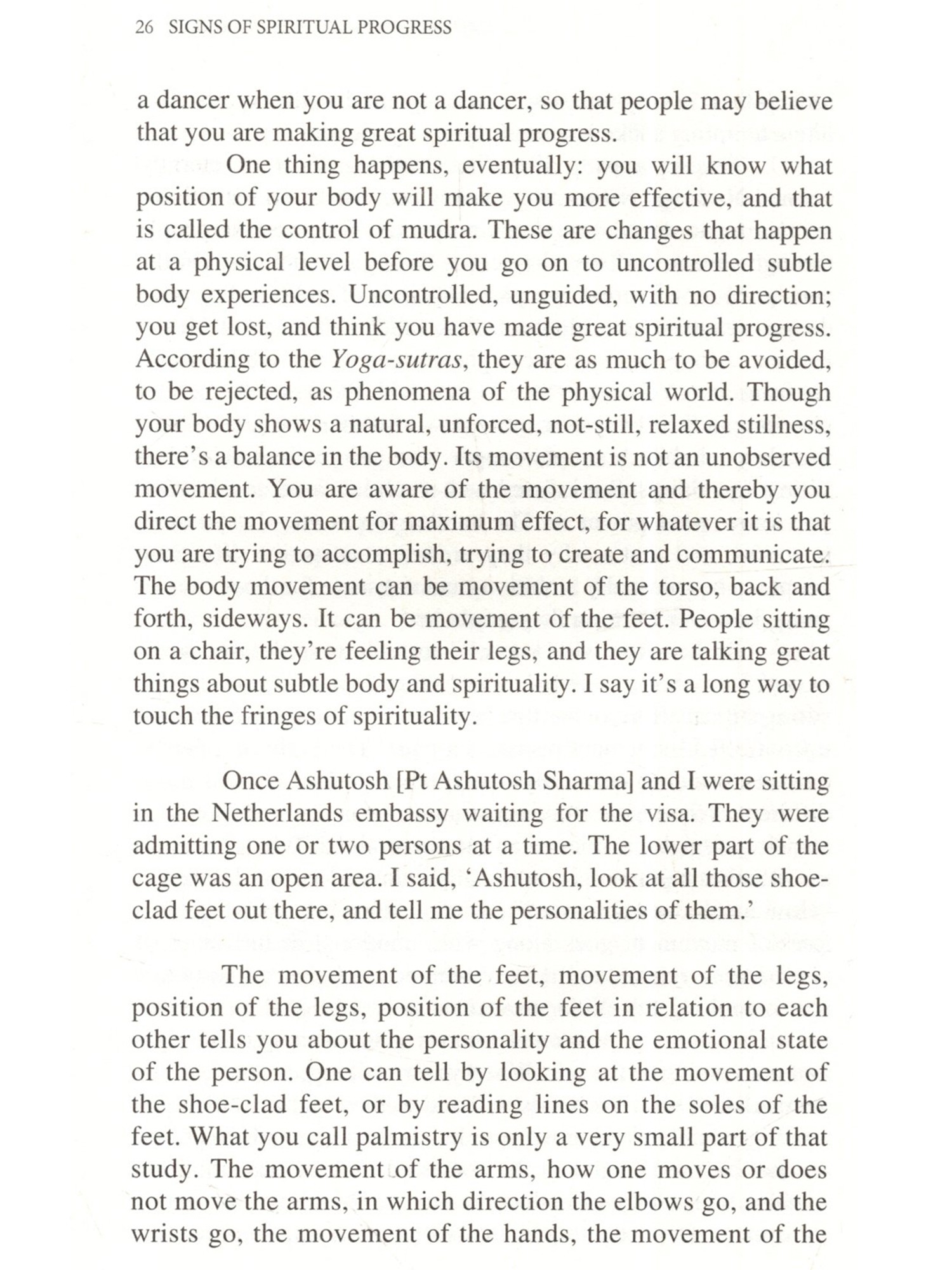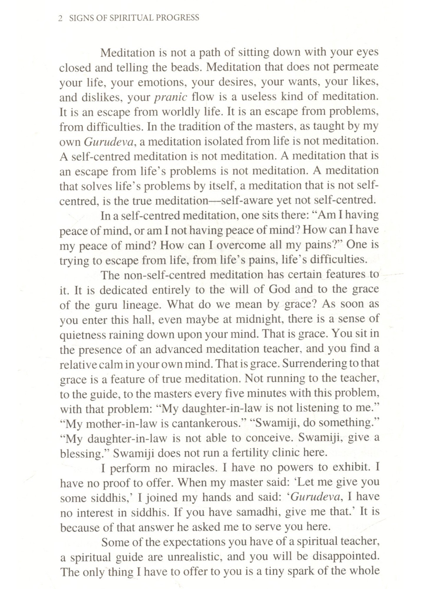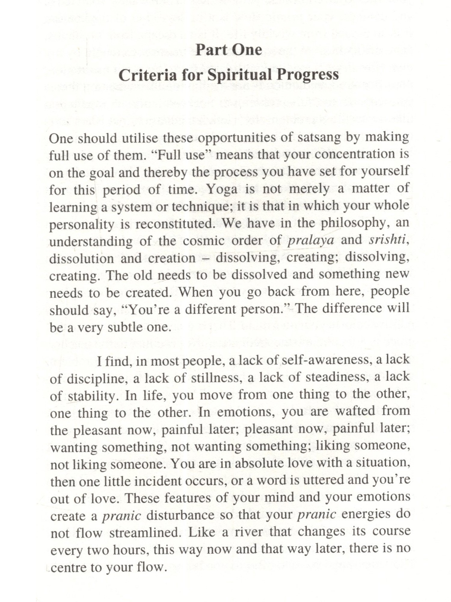 The series of talks on "Marks of Spiritual Progress" is meant to be a compass to check whether you are making progress. This is one step. Then read Sadhana in Applied Spirituality, in which I have given some practical suggestions on your thought patterns, which result in a change in your communication patterns, which result in a change in your relational patterns, not only in the family but also in the workplace. You may also refer to many talks over the years on Kundalini and the Chakras. You can study this subject through the book, Kundalini: Stilled or Stirred? Ultimately, this will prepare the groundwork to benefit from reading Swami Rama's book: The Art of Joyful Living. You should read it over and over and see if you are truly applying the principles that Swami Rama so generously, so lovingly, so beautifully and so effectively presented to us. And I would like these to be your study, your contemplation, your discussion and especially your application over the next years of your life. In order for the Initiates to remain true to their sadhana. it is essential that they keep a journal of spiritual progress. I would like to advise that everyone undertake this as a project for a year. The project is to thoroughly read Signs of Spiritual Progress. Take personal notes of all "signs" and write them down. Check and see if your own personal thoughts, words, acts, communications, relationships, in personal life and relationships in professional life and in social life, and in your spiritual community reflect your spiritual success. To what degree do your actions conform and what remains to be accomplished? When this is done collectively by all initiates, it will insure the Community of Initiates continues long after (Swami Veda Bharati) is called away to the Worlds of Light.