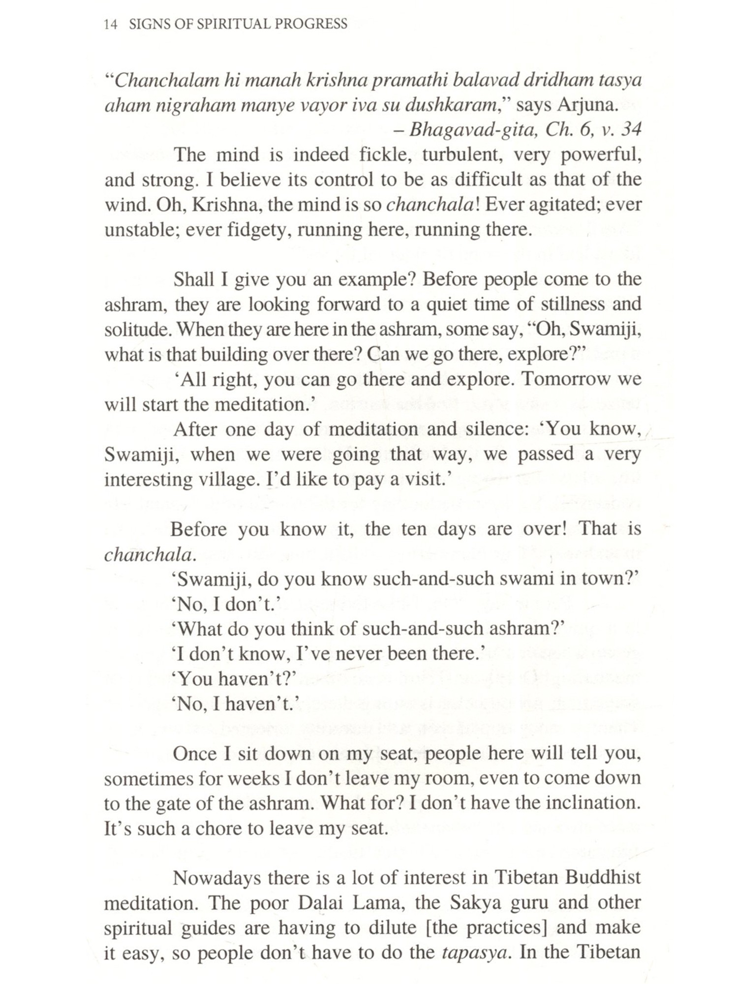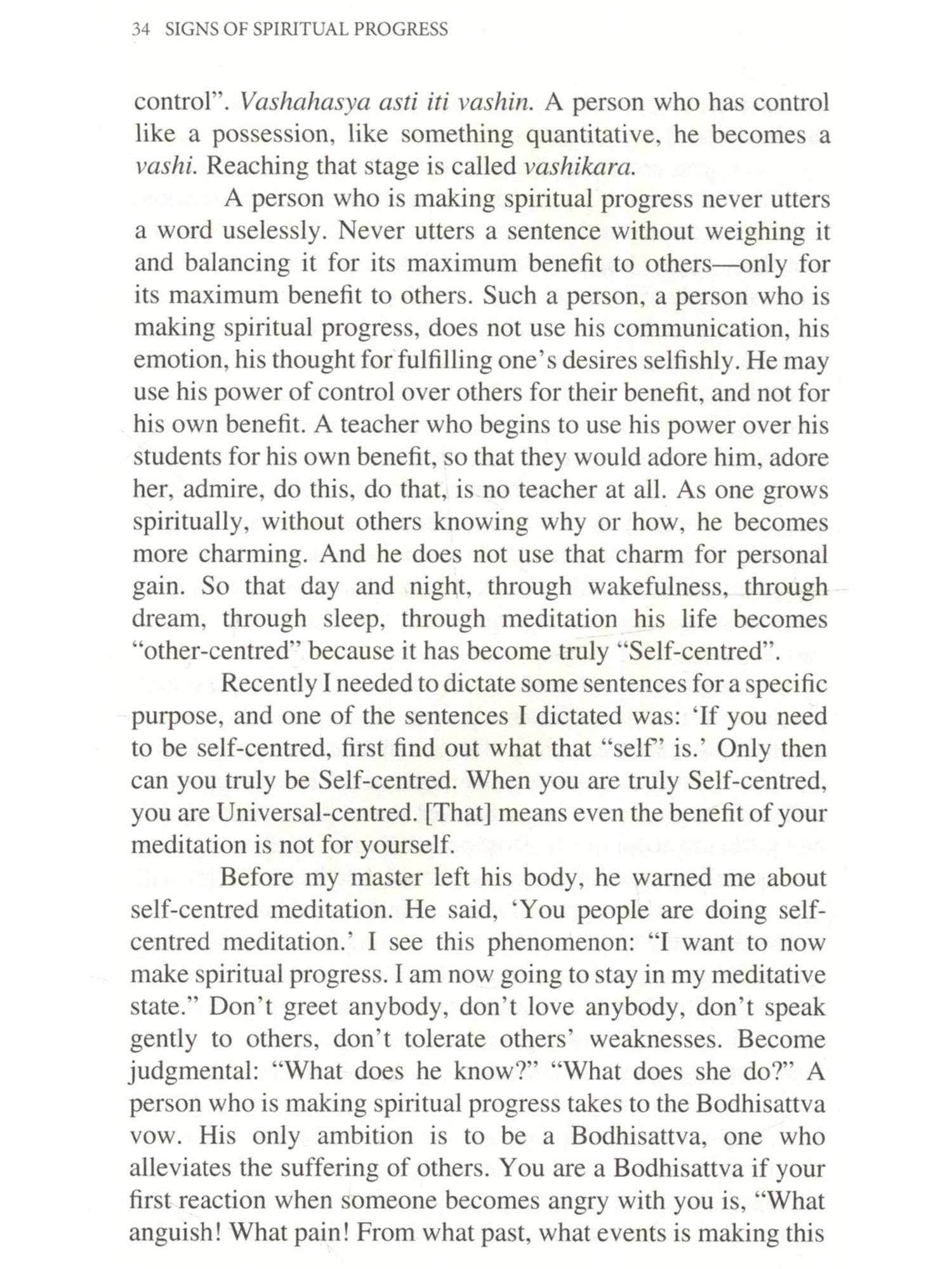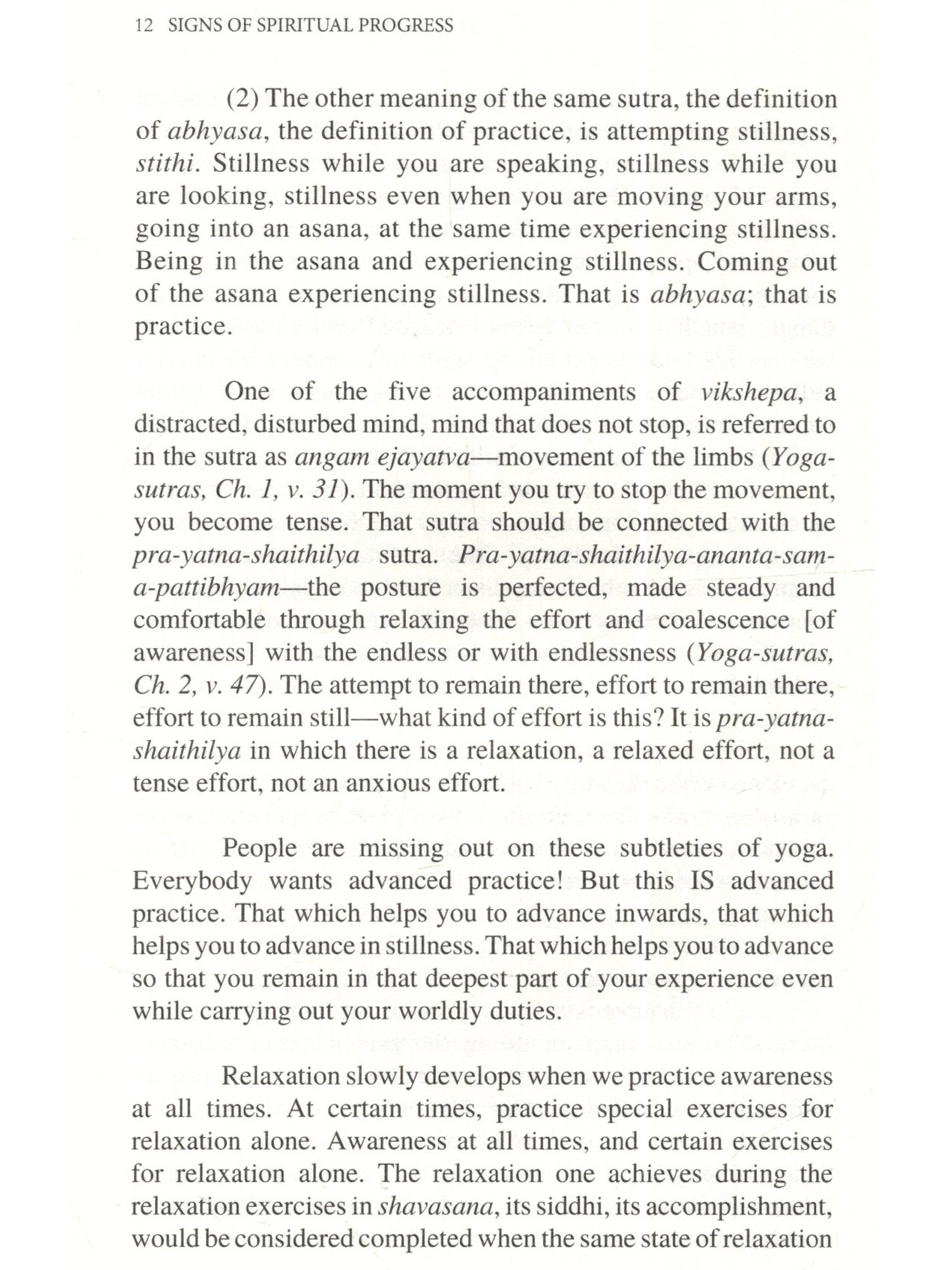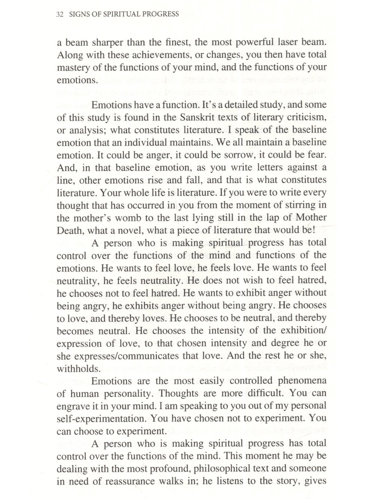 The series of talks on "Marks of Spiritual Progress" is meant to be a compass to check whether you are making progress. This is one step. Then read Sadhana in Applied Spirituality, in which I have given some practical suggestions on your thought patterns, which result in a change in your communication patterns, which result in a change in your relational patterns, not only in the family but also in the workplace. You may also refer to many talks over the years on Kundalini and the Chakras. You can study this subject through the book, Kundalini: Stilled or Stirred? Ultimately, this will prepare the groundwork to benefit from reading Swami Rama's book: The Art of Joyful Living. You should read it over and over and see if you are truly applying the principles that Swami Rama so generously, so lovingly, so beautifully and so effectively presented to us. And I would like these to be your study, your contemplation, your discussion and especially your application over the next years of your life. In order for the Initiates to remain true to their sadhana. it is essential that they keep a journal of spiritual progress. I would like to advise that everyone undertake this as a project for a year. The project is to thoroughly read Signs of Spiritual Progress. Take personal notes of all "signs" and write them down. Check and see if your own personal thoughts, words, acts, communications, relationships, in personal life and relationships in professional life and in social life, and in your spiritual community reflect your spiritual success. To what degree do your actions conform and what remains to be accomplished? When this is done collectively by all initiates, it will insure the Community of Initiates continues long after (Swami Veda Bharati) is called away to the Worlds of Light.