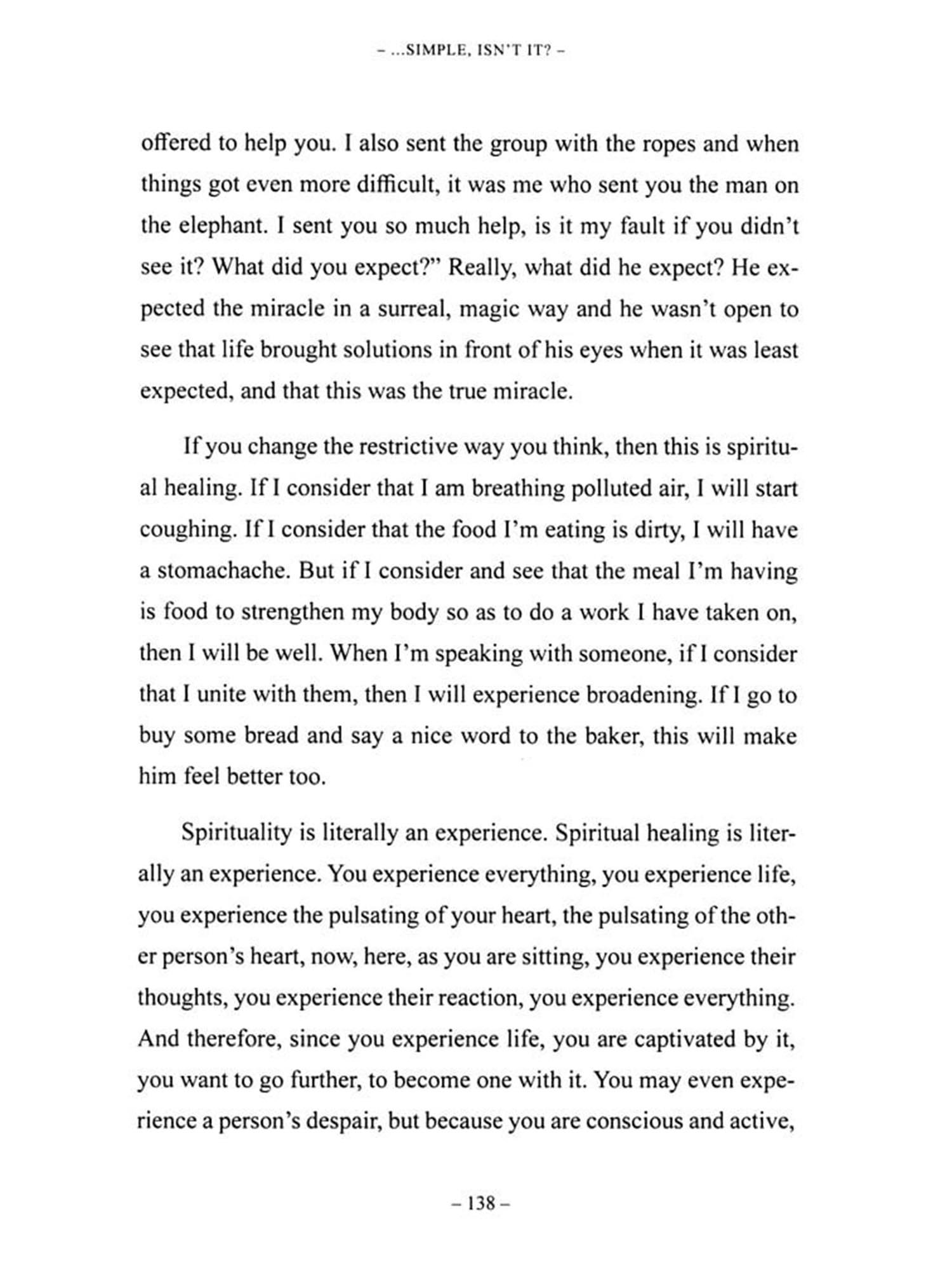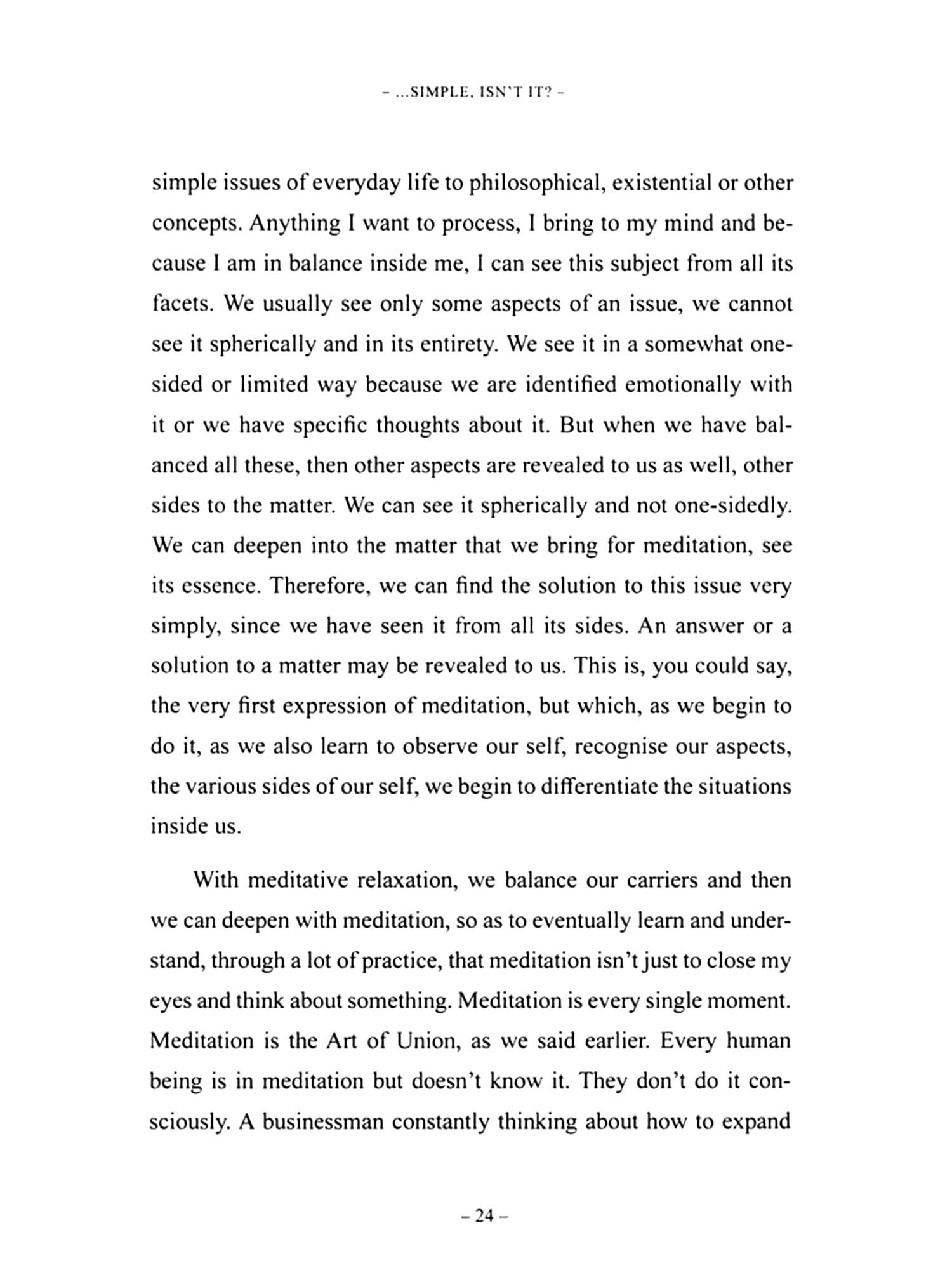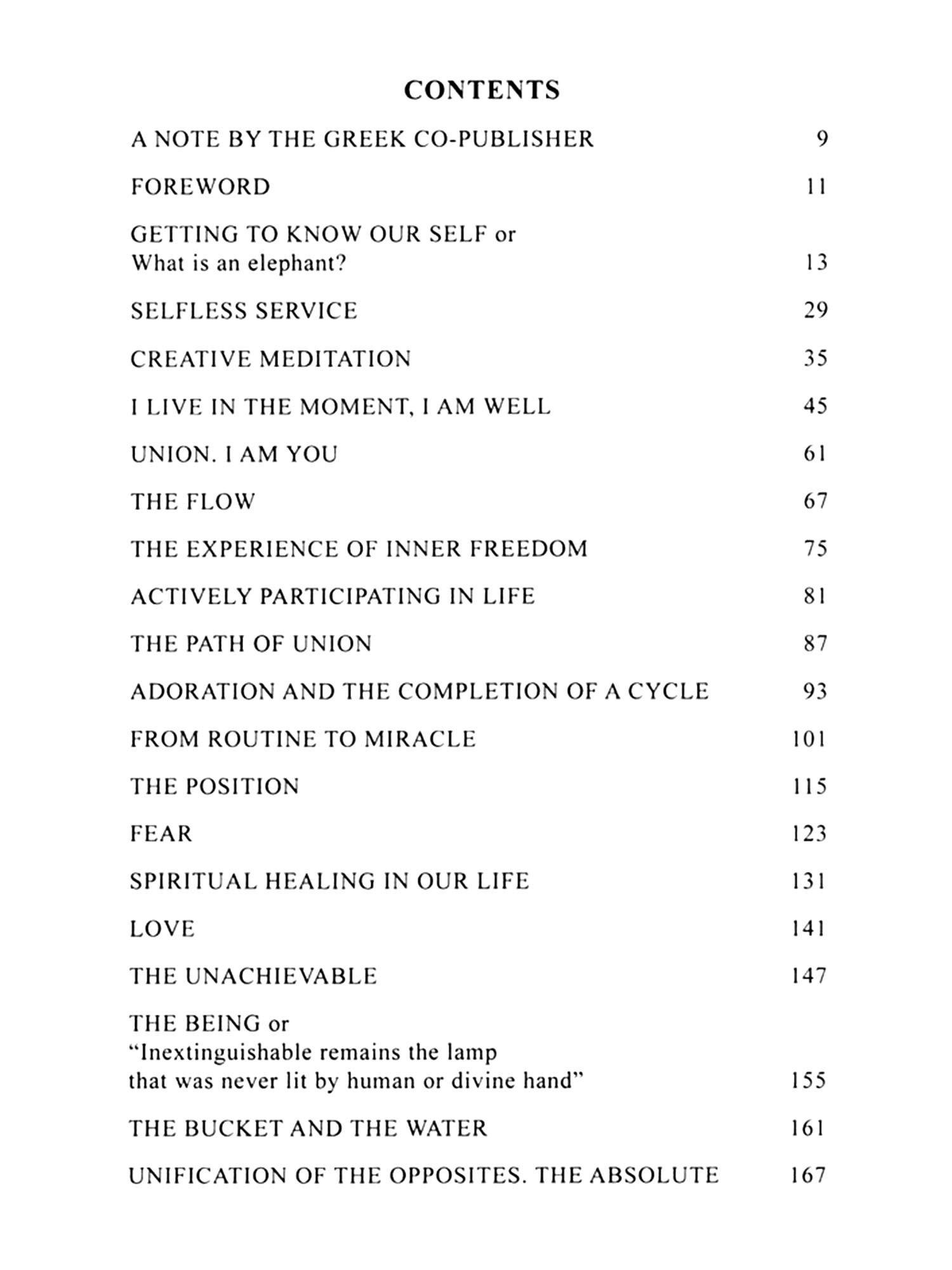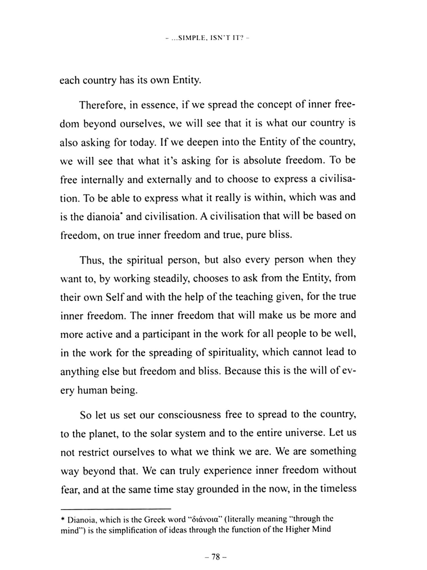 In the various chapters of this book, incentives for thought, for broadening and deepening are given, but mainly each chapter, and the book in its entirety, challenges us to believe in ourselves and to express the potential that exists within us directly, simply and practically in every area of our life. As the reader goes through this book, they will encounter concepts such as ""knowledge and discipleship of the Self"", ""spiritual person"", ""the Master"", ""the Entity"", ""union"", ""spiritual healing"", ""grounding"". Even if some-one is seeing them for the first time, all of them are explained and clarified in the flow of the word and through the vivid examples that are given.