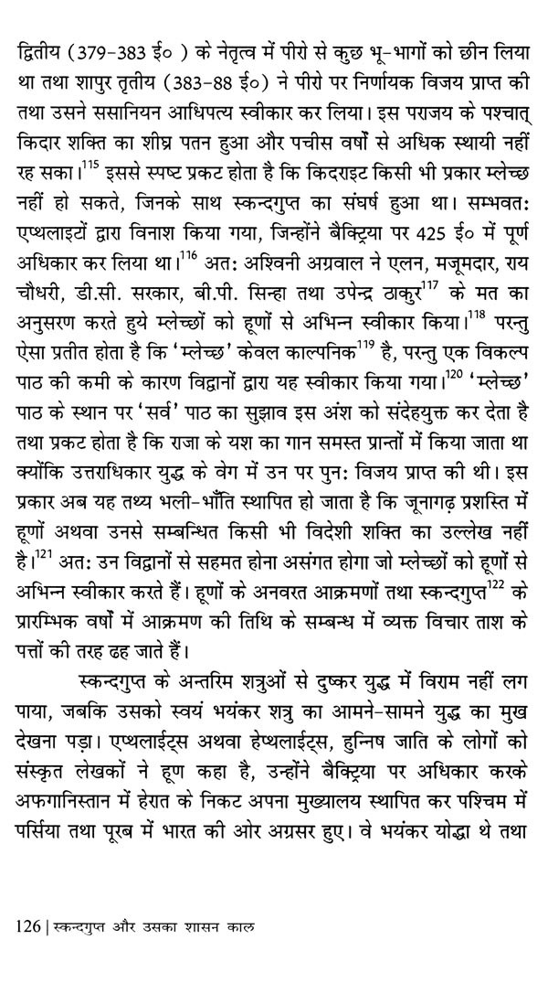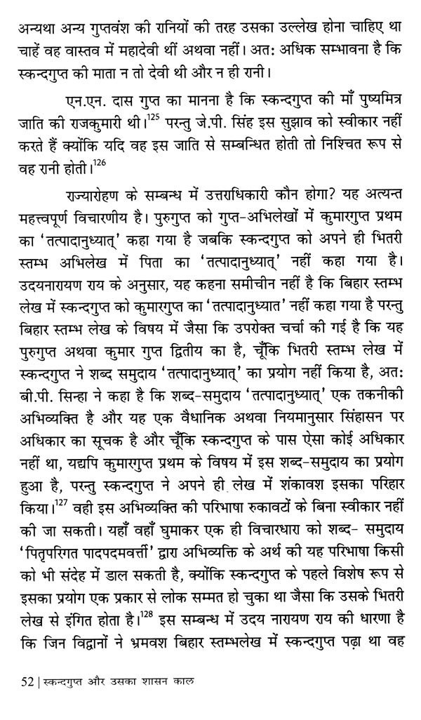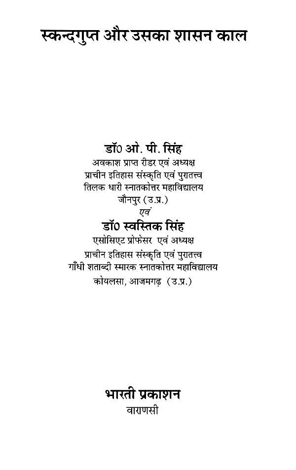 स्कन्दगुप्त कालीन राज्य व्यवस्था, आर्थिक, धार्मिक तथा कलात्मक पहलुओं पर अभी भी सूक्ष्म एवं गहन अध्ययन की आवश्यकता है। अतः प्रस्तुत ग्रंथ में इनकी सूक्ष्म विवेचना की गई है। भारतीय इतिहास के प्राचीन युग में कुछ नरेश सौभाग्यशाली थे जिन्होंने कौटिल्य, मेगस्थनीज, बाण तथा हेनसांग की सेवाएँ प्राप्त की। उन्होंने अपने समकालीन नरेशों की छवि की एक रुपरेखा को एक रंग प्रदान किया। परन्तु अनेक राजाओं की भांति स्कन्दगुप्त ऐसा सौभाग्यशाली नहीं था। वास्तव में यह दुर्भाग्य है कि उसके शासन काल सभी अभिलेख दरबारी संरक्षण में नहीं तैयार किये गए थे। फिर भी इन अभिलेखों के आधार पर स्कन्दगुप्त को राजन्य आदर्श, राज्य व्यवस्था, सामाजिक, आर्थिक पहलू, धार्मिक सहिष्णुता एवं कला के कतिपय पक्षों की विवेचना की गई है। प्रस्तुत ग्रंथ में उत्तराधिकार प्राप्त करने की कठिनाइयों, पुष्पमित्रों और हूणों के साथ संघर्ष तथा अन्य विजयों के अतिरिक्त, सांस्कृतिक पक्षों की समीक्षा की गई है। इतिहासकारों के इस मत की आलोचनात्मक समीक्षा की गई है कि क्या स्कन्दगुप्त के शासन काल के उत्तरार्द्ध में आर्थिक ह्रास हुआ