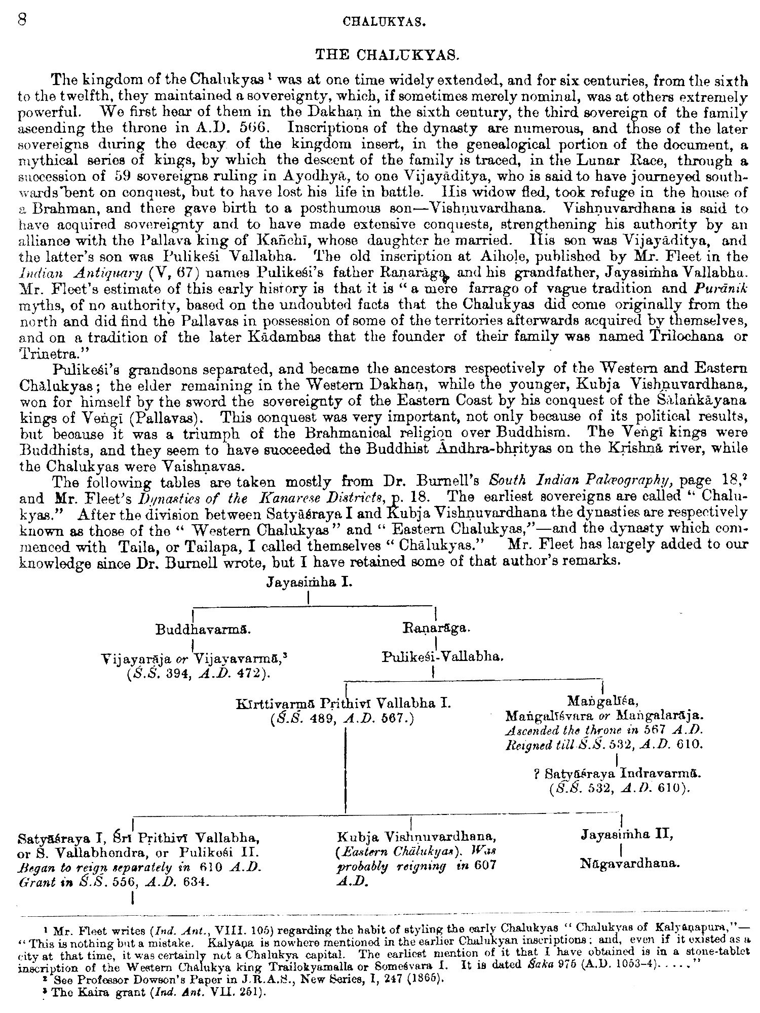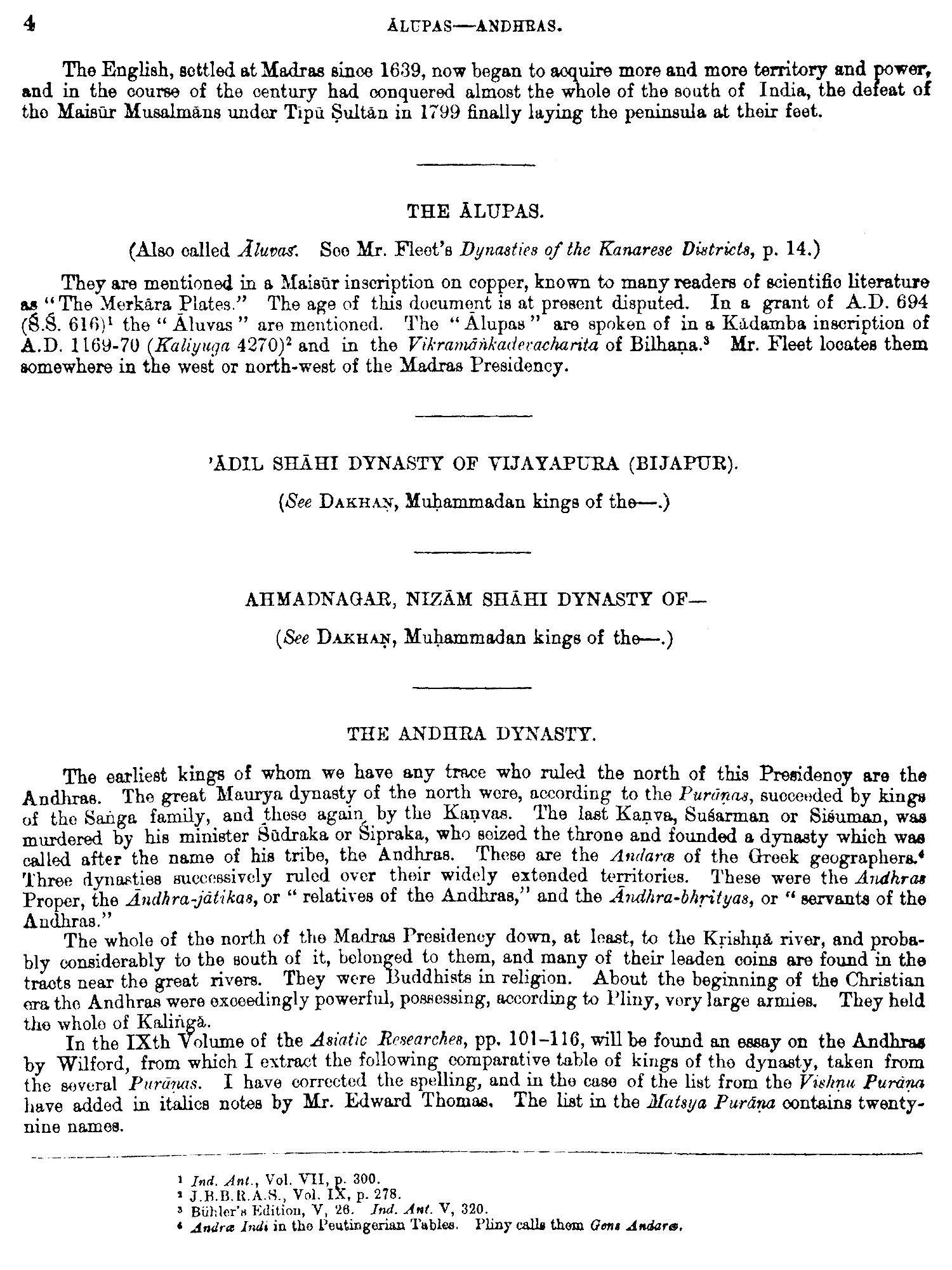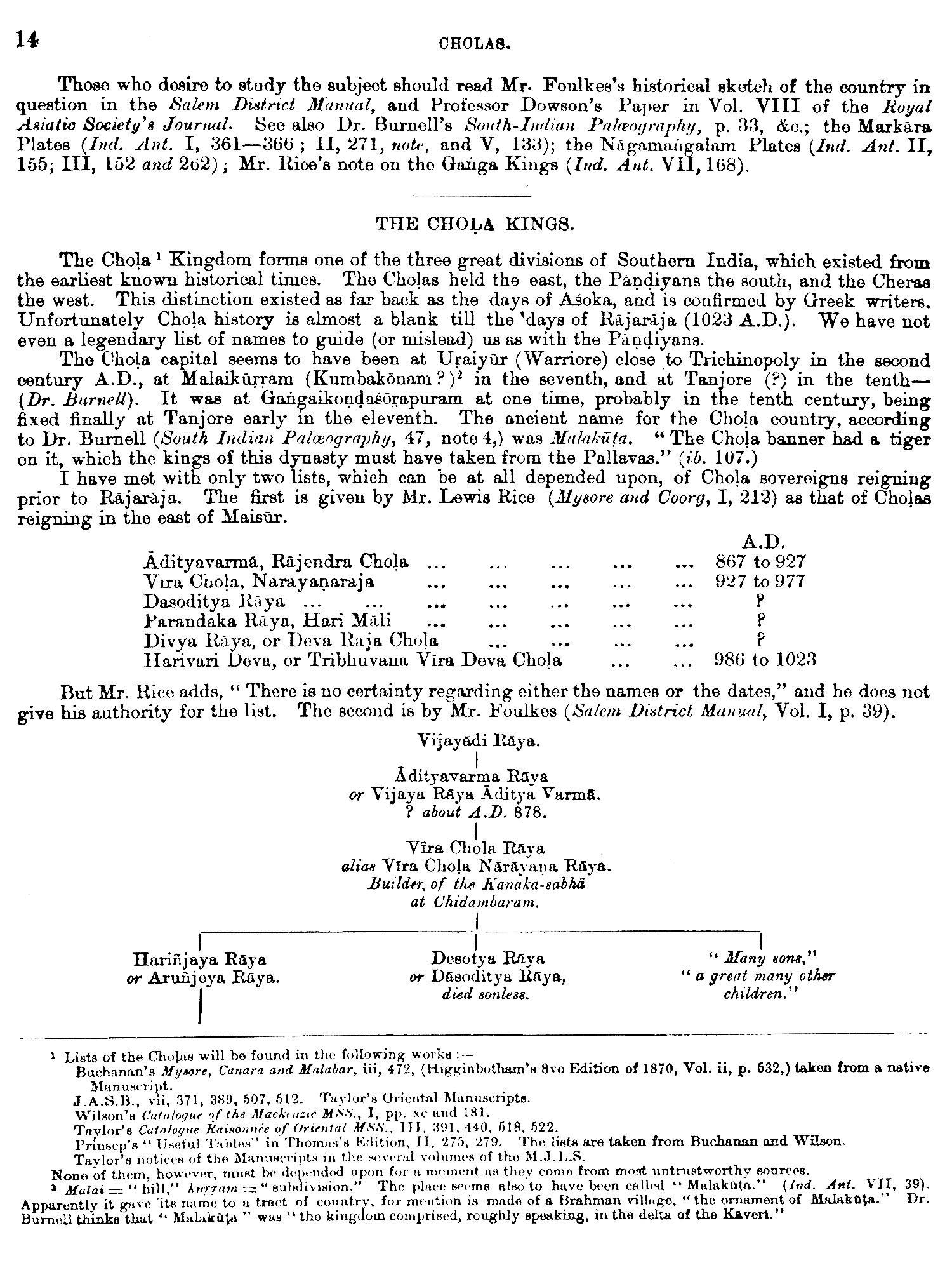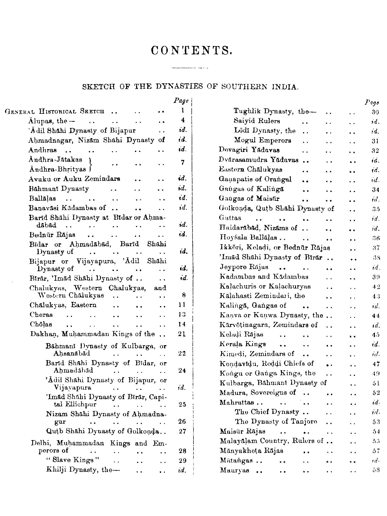 The contents of this volume are extracted from a larger work, Vol. II, of the Archaeological figure serios of Southern India. It is thought that the separate publication of this slight historical sketch may be of use to many students of history who would not care to burden themselves with a larger work, much of which is taken up with lists of Inscriptions and Chronological Tables intended for the use of those practically engaged in making the bricks out of which the complete historical structure will hereafter be built. This sketch of the Dynasties is, of course, not intended as a complete history. The subject of Both Indian History is as yet in its infancy, and it is only because it is felt we must be made in some shape or another that this volume makes its appearance. Armed with this, madders will, it is hoped, feel themselves on fairly sure ground when they seek for information regarding some kingdom or sovereign of the peninsula, and little by little we shall advance in our knowledge. very strongly that a beginning Some of the principal families, not royal, who can boast of antiquity have been included in this list, since all information of that kind helps forward our knowledge of the march of events. The arrangement is alphabetical, to assist reference.