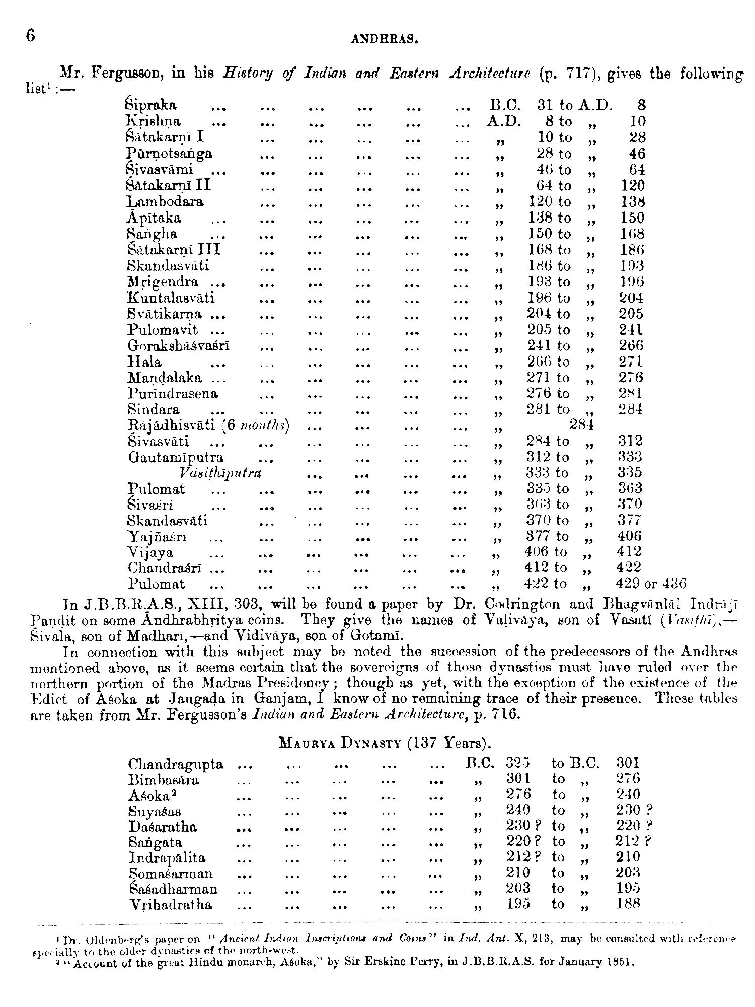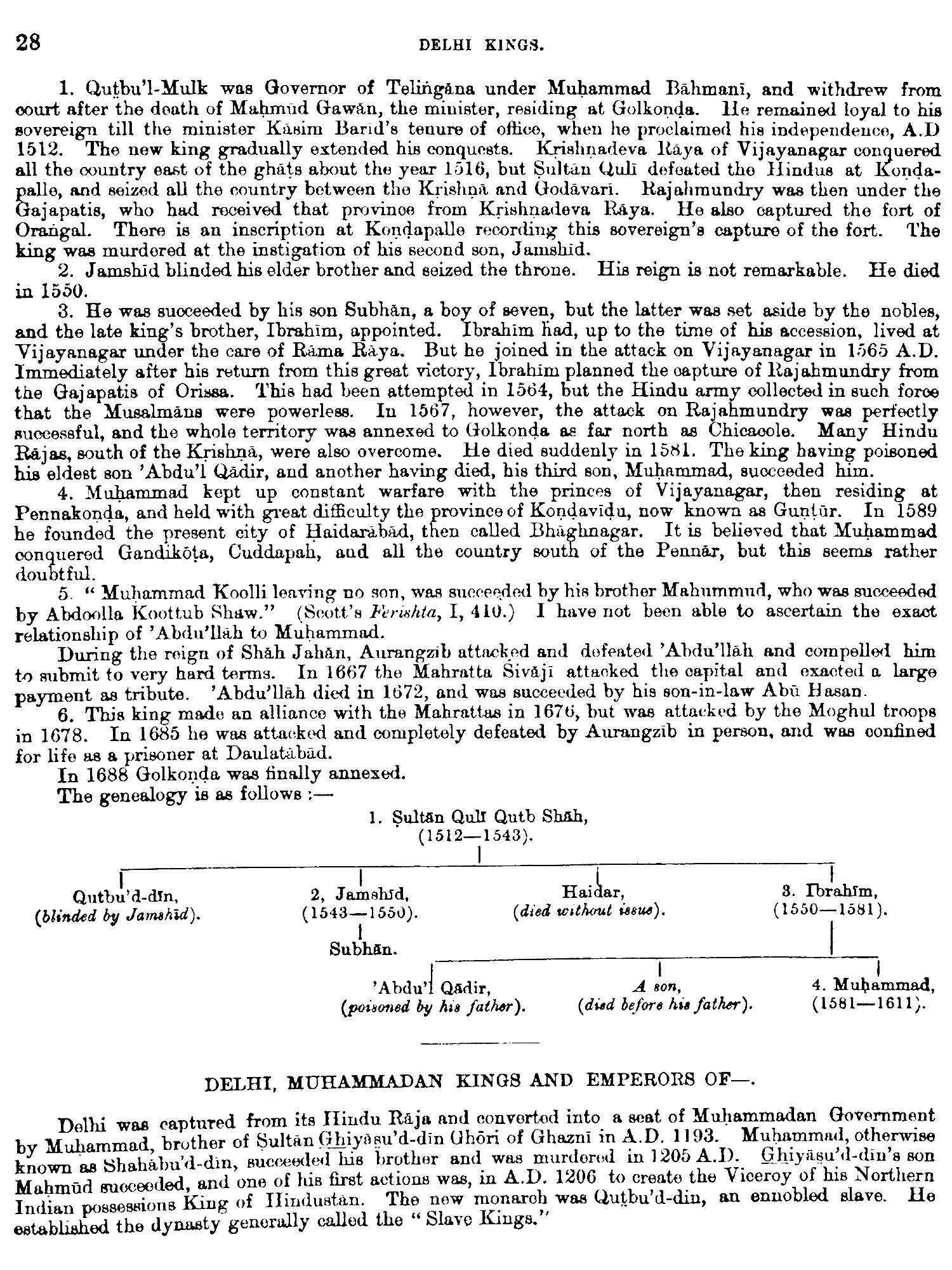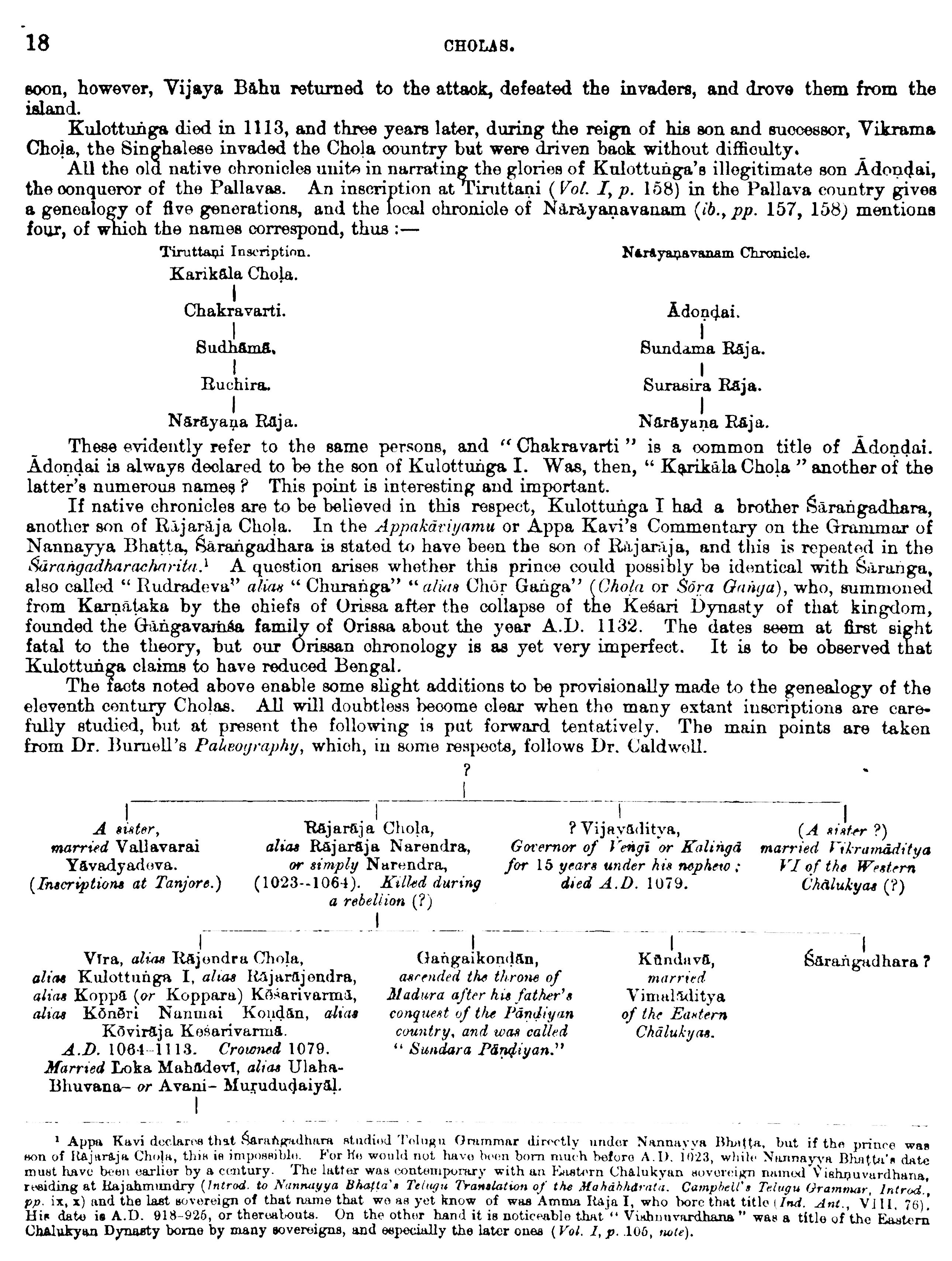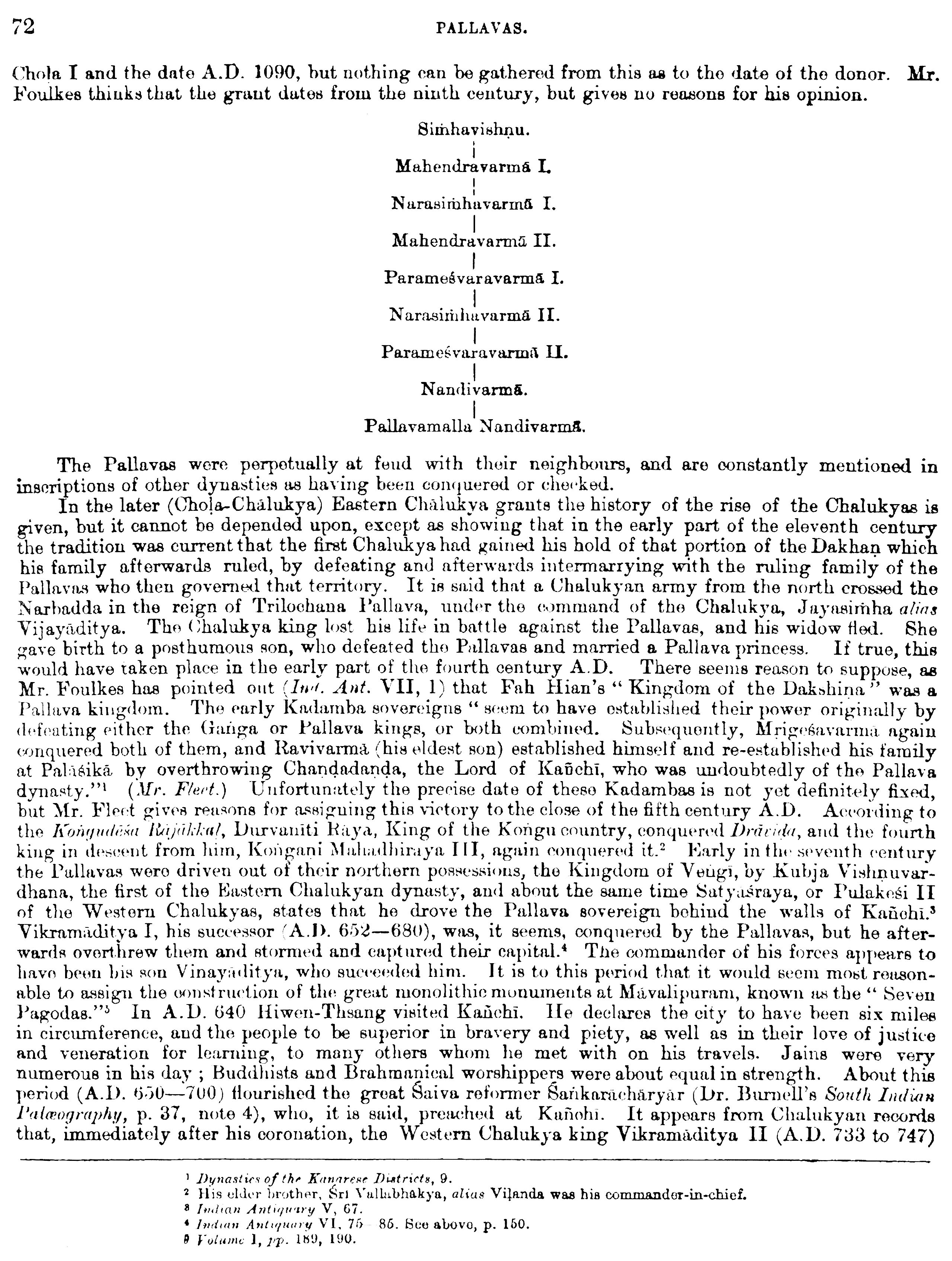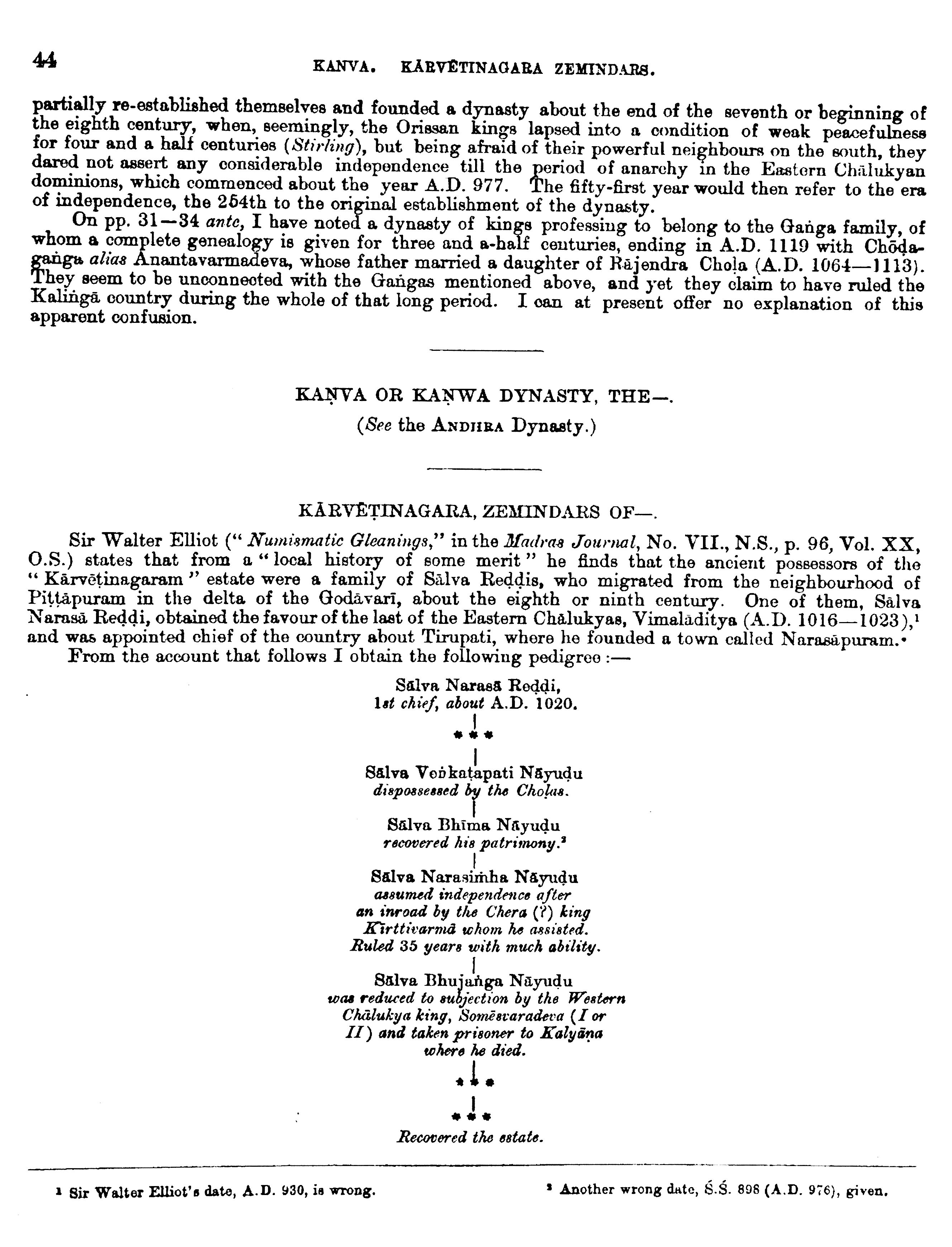 The contents of this volume are extracted from a larger work, Vol. II, of the Archaeological figure serios of Southern India. It is thought that the separate publication of this slight historical sketch may be of use to many students of history who would not care to burden themselves with a larger work, much of which is taken up with lists of Inscriptions and Chronological Tables intended for the use of those practically engaged in making the bricks out of which the complete historical structure will hereafter be built. This sketch of the Dynasties is, of course, not intended as a complete history. The subject of Both Indian History is as yet in its infancy, and it is only because it is felt we must be made in some shape or another that this volume makes its appearance. Armed with this, madders will, it is hoped, feel themselves on fairly sure ground when they seek for information regarding some kingdom or sovereign of the peninsula, and little by little we shall advance in our knowledge. very strongly that a beginning Some of the principal families, not royal, who can boast of antiquity have been included in this list, since all information of that kind helps forward our knowledge of the march of events. The arrangement is alphabetical, to assist reference.