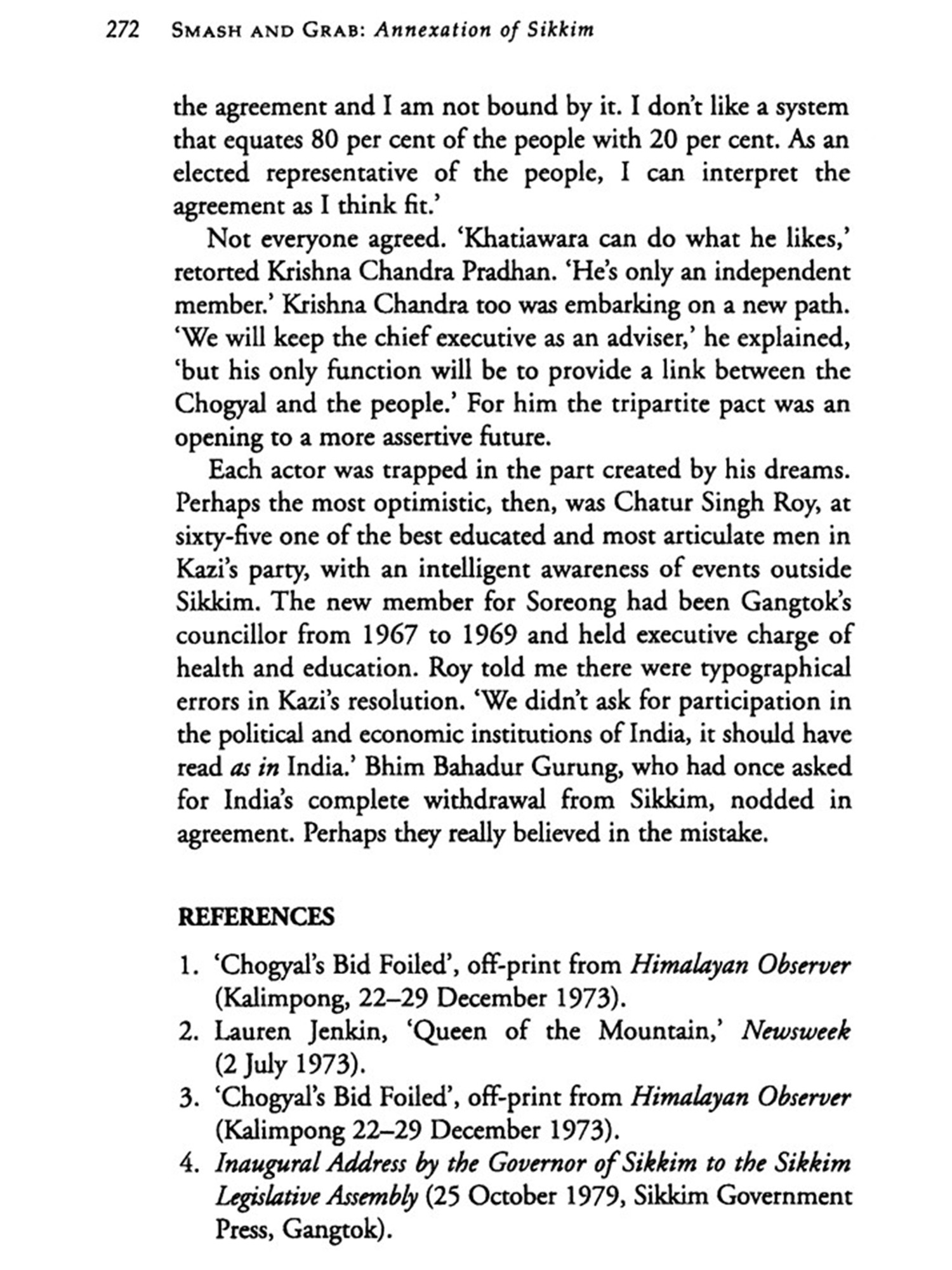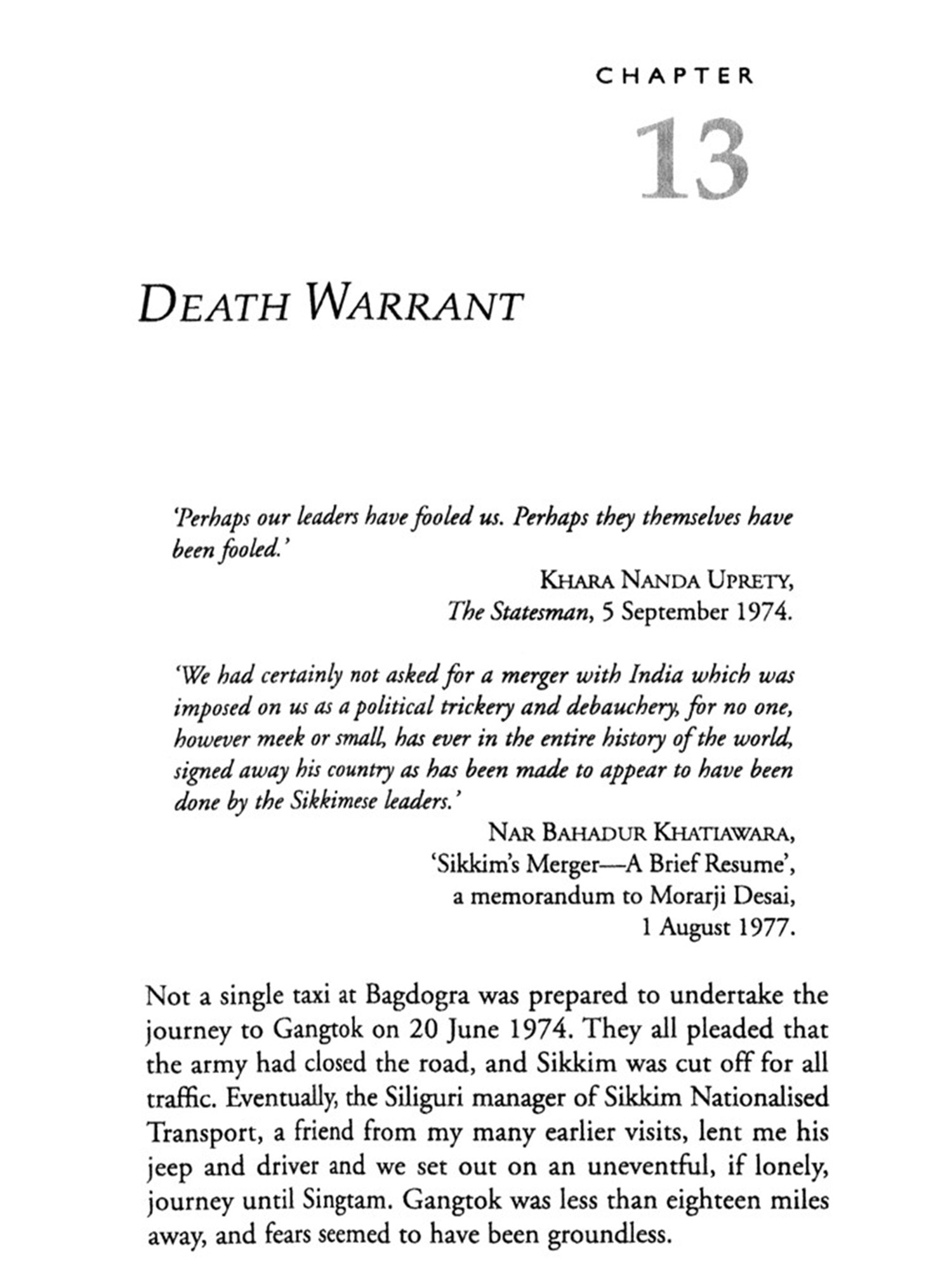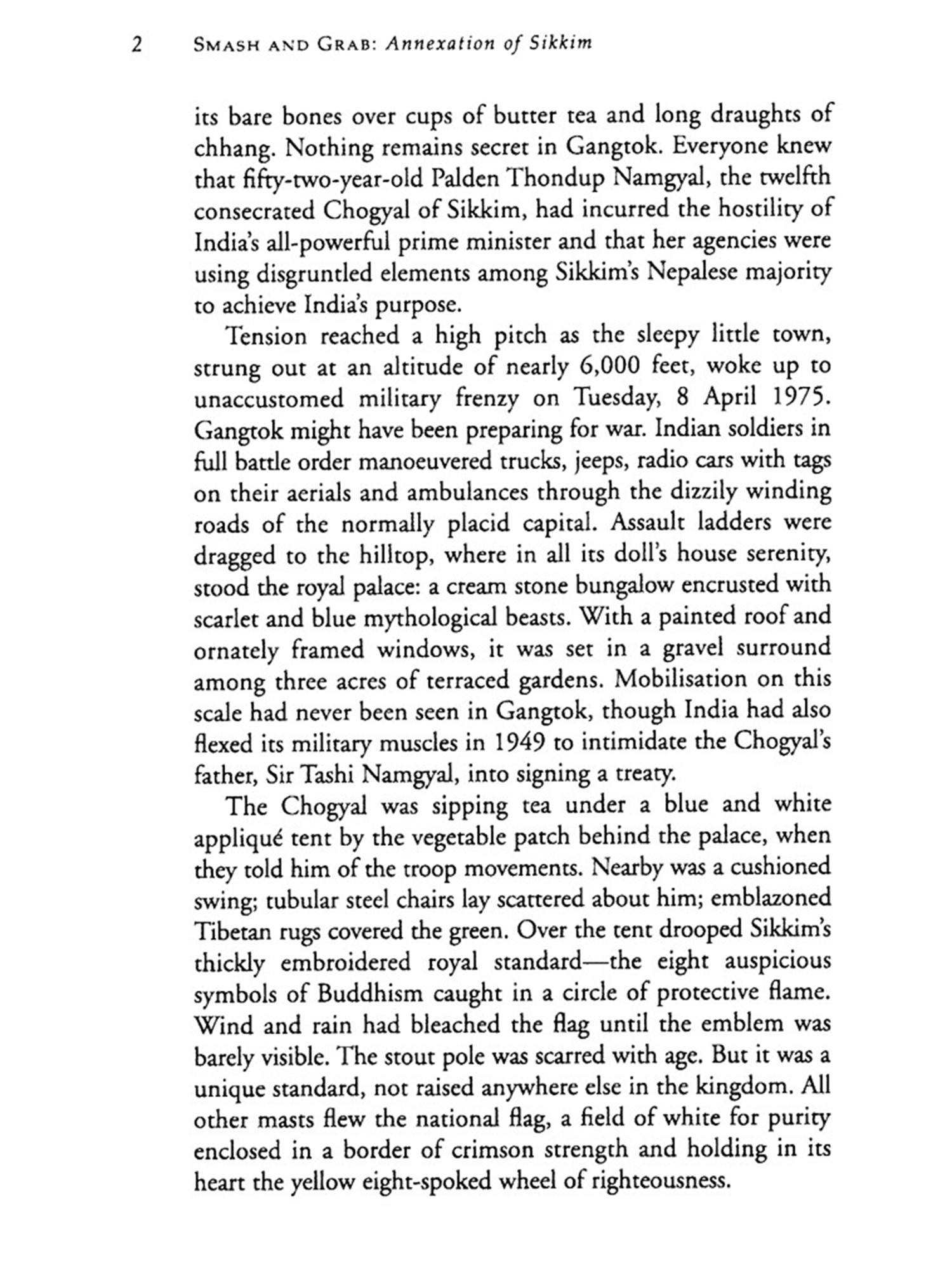 This is not the story of the Chogyal's life. Only he could have written that. Nor does it pretend to be a comprehensive account of Sikkim's Buddhist polity. It is an observer's chronicle of a recent passage in the subcontinent's history. Describing what happened, and how, will not change the present or future. But it may serve some purpose if, in truly recounting how law, usage and promises were ruthlessly set aside to destroy one of the last surviving fragments of a cultural empire that once straddled the heart of Central Asia, it also reveals the dangerous ease with which public opinion can be whipped up into chauvinistic acquisitiveness.