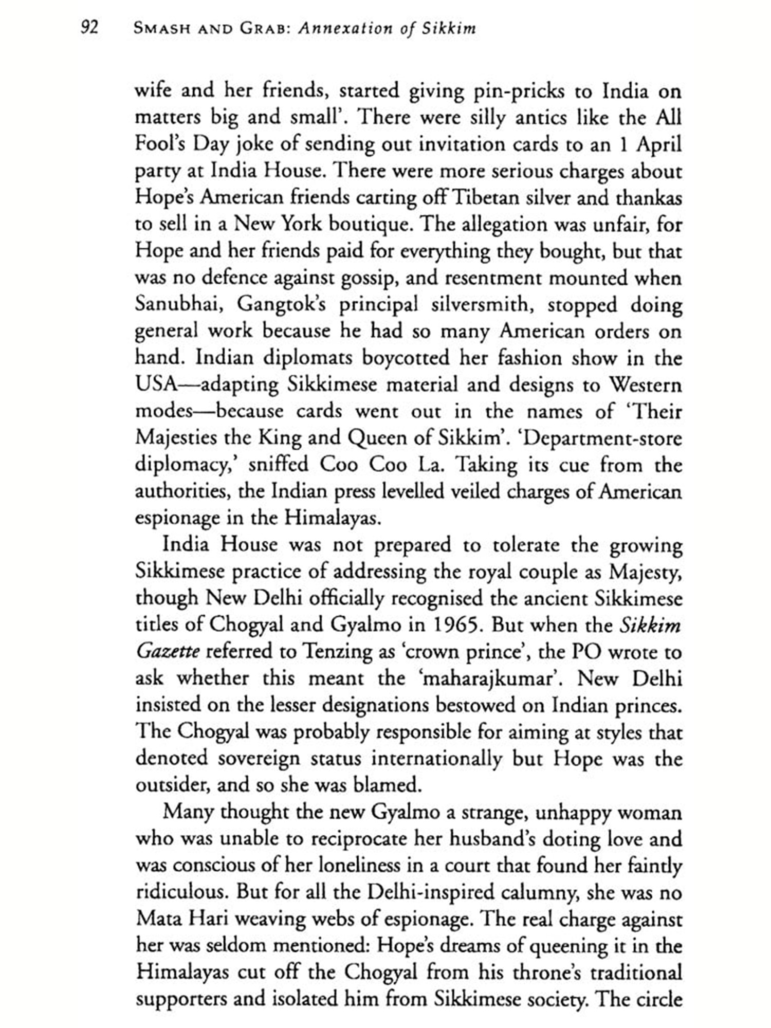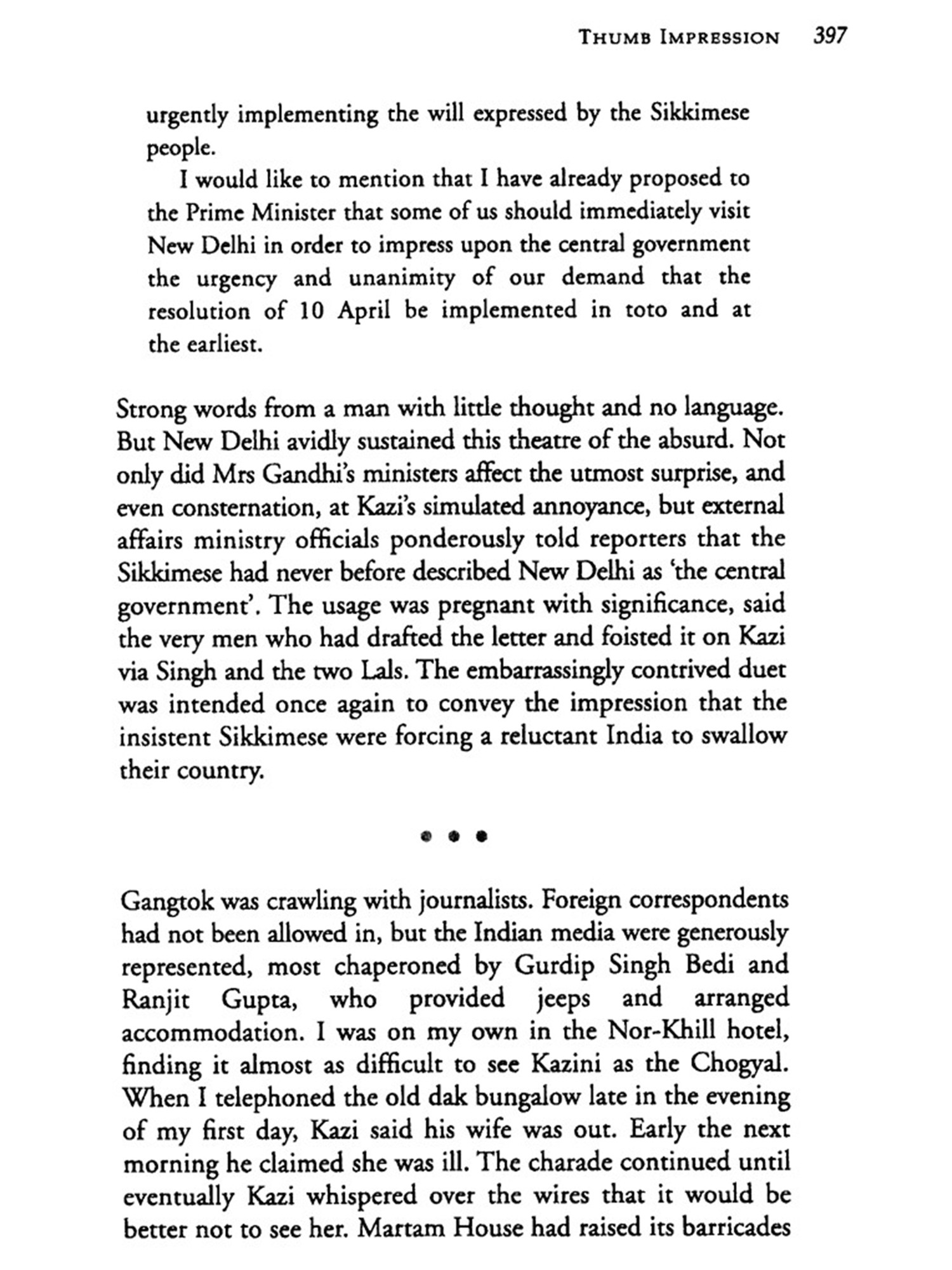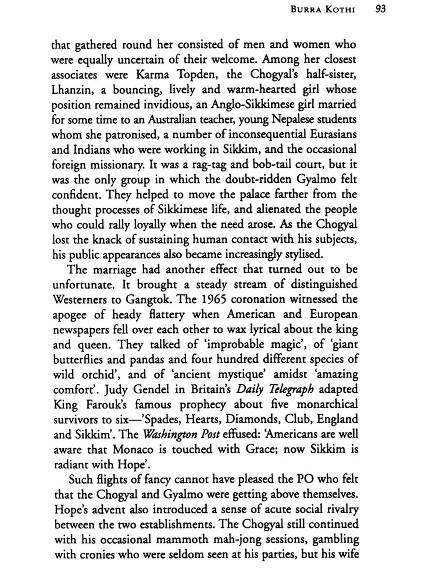 This is not the story of the Chogyal's life. Only he could have written that. Nor does it pretend to be a comprehensive account of Sikkim's Buddhist polity. It is an observer's chronicle of a recent passage in the subcontinent's history. Describing what happened, and how, will not change the present or future. But it may serve some purpose if, in truly recounting how law, usage and promises were ruthlessly set aside to destroy one of the last surviving fragments of a cultural empire that once straddled the heart of Central Asia, it also reveals the dangerous ease with which public opinion can be whipped up into chauvinistic acquisitiveness.