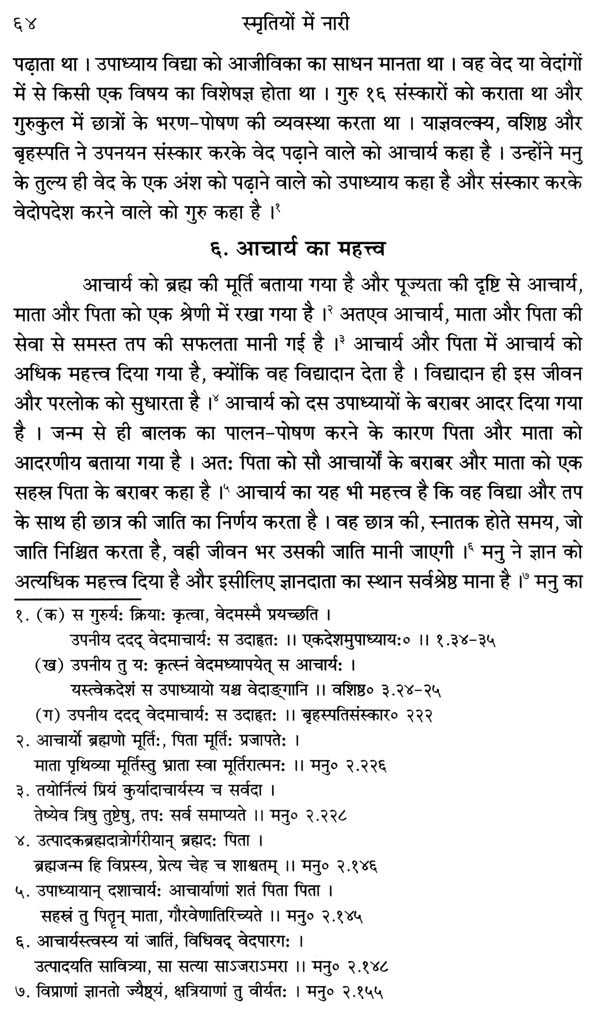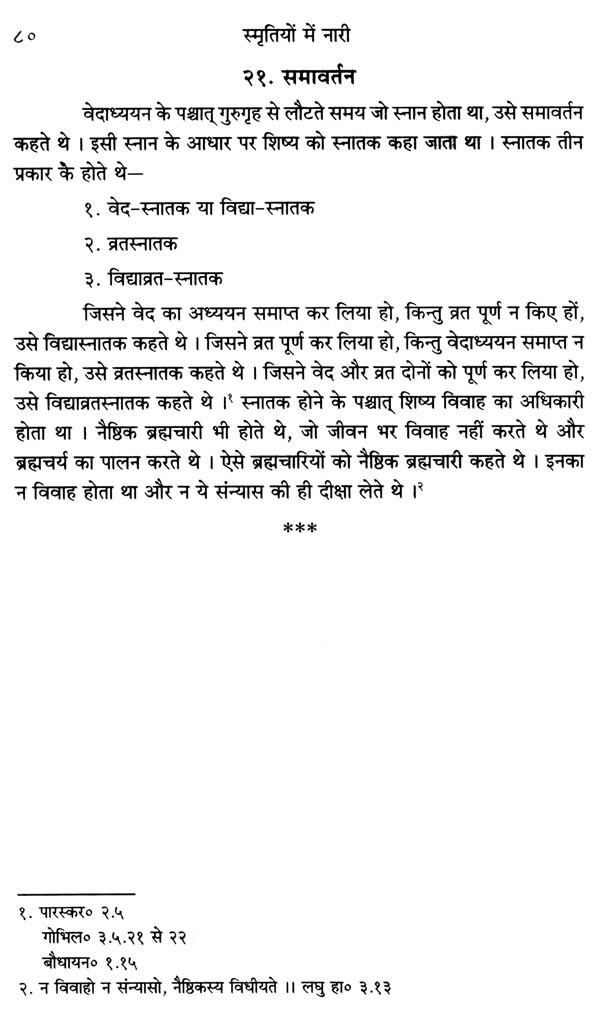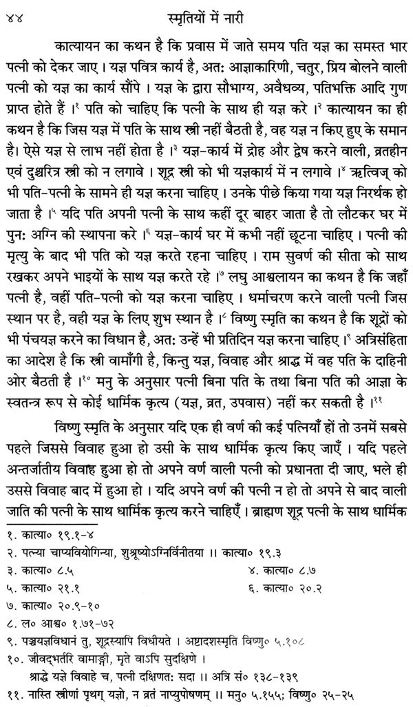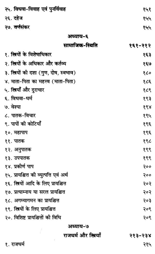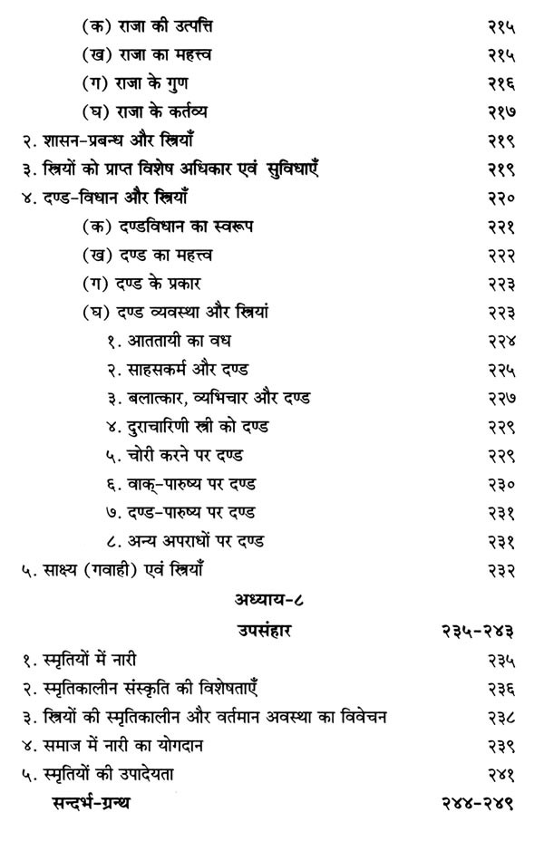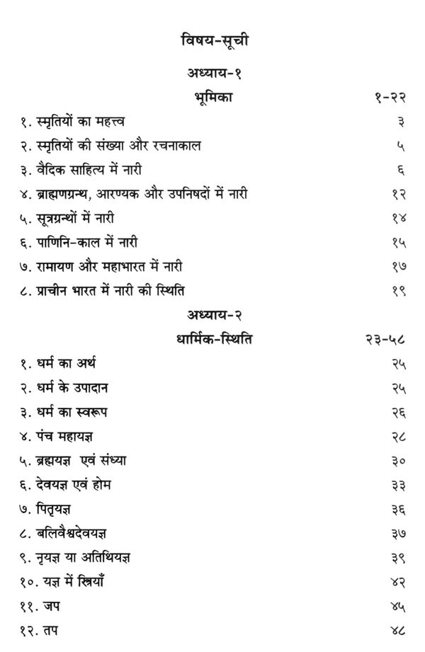 मैंने पूर्ण प्रयत्न किया है कि स्मृतियों में समाजशास्त्रीय दृष्टि से नारी के विषय में जो भी सामग्री मिल सकती है, उसका पूर्ण संकलन किया जाए। कुछ विषय ऐसे हैं, जो प्रायः सभी स्मृतियों में आए हैं और विचारों की समानता है। उन स्थलों पर पाद-टिप्पणी में सबका सन्दर्भ दे दिया गया है। प्रयत्न किया गया है कि विषय से सम्बद्ध कोई तथ्य न छूटने पाए। संस्कार, पाप, प्रायश्चित, वर्णसंकर आदि विषयों पर सामग्री बहुत अधिक थी। सबका विस्तृत विवरण देना इस शोध-प्रबन्ध का विषय नहीं था, अतः इन शीर्षकों में केवल स्त्रियों से सम्बद्ध तथ्य ही दिए गए हैं।