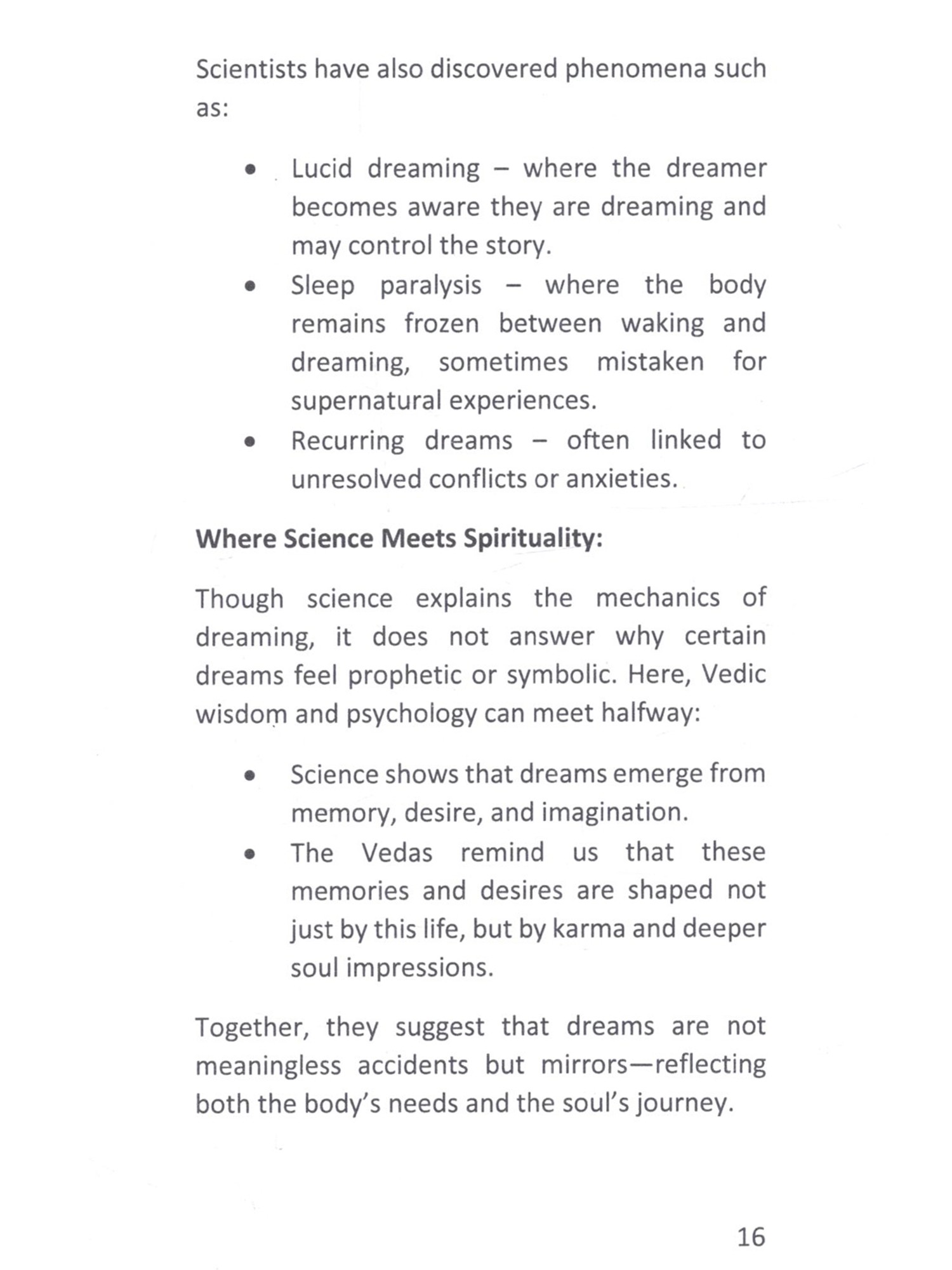 To the Lotus Feet of Shri Vishnu, the eternal preserver of the universe, I offer this humble work. May His grace guide the words within these pages and bless every reader who turns to them for wisdom. one Dreams are among the most mysterious gifts given to mankind. In the silence of the night, when the body rests and the world grow quiet, the mind awakens into another realm filled with symbols, visions, and messages. Some dreams inspire joy, others bring fear; some foretell events, others open doors to spiritual awakening. From ancient times, humanity has looked to dreams for guidance, comfort, and prophecy. The sages of the Vedas did not dismiss dreams as illusions. They recorded them, studied them, and classified them according to time, origin, and meaning. They told us that dreams could reveal karmic seeds, warn of illness, promise prosperity, or bring the blessings of gods and ancestors. Across cultures too in Egypt, Greece, China, and beyond dreams were considered sacred messages from the unseen. Modern science, though approaching dreams differently, has also revealed their importance. Psychologists like Freud and Jung saw them as pathways into the subconscious, while neuroscientists discovered the rhythms of REM sleep where dreams arise. In their own way, they confirm what the ancients always knew: that dreams are not empty shadows, but mirrors of the inner life.