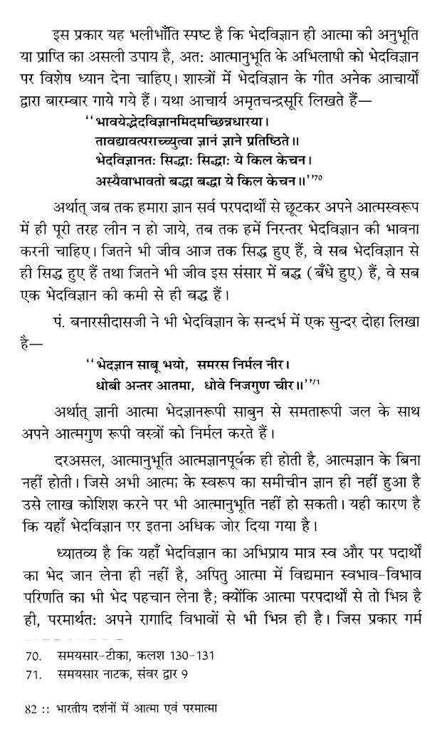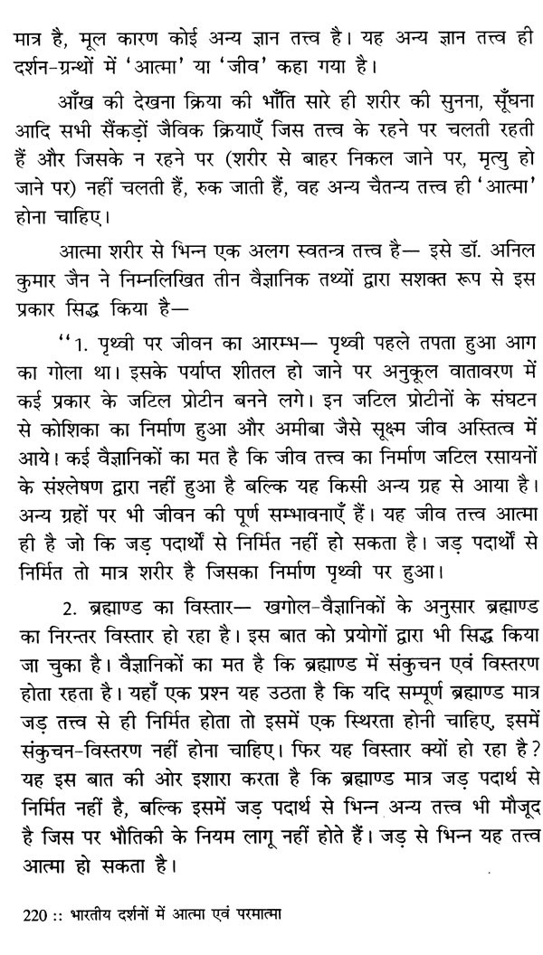 आत्मा एवं परमात्मा के अस्तित्व, स्वरूप तथा कर्तृत्व-अकर्तृत्व जैसे जटिल विषय को लेकर भारतीय दर्शनों व दार्शनिकों में काफी कुछ समानता के बावजूद मतभेद रहे हैं। जैनाचार्य आत्मा और परमात्मा में घनिष्ठ सम्बन्ध मानते हैं। उनके अनुसार, आत्मज्ञान की प्राप्ति ही परमात्मस्वरूप को पा जाना है। और फिर, सर्वदुःखों से मुक्ति और स्वाधीन सुख की प्राप्ति ही तो मोक्ष है, जिसका मूल कारण आत्मतत्त्व को जान लेना ही है! अन्य दर्शनों में भी इस विषय पर अपना अपना गम्भीर चिन्तन हुआ है। प्रस्तुत कृति के विद्वान लेखक ने दर्शनशास्त्र के इस गूढ़ गम्भीर विषय को बहुत ही सरल सुबोध शैली में युक्तियुक्त ढंग से प्रस्तुत करने का प्रयास किया है। उन्होंने सात अध्यायों में भारतीय दर्शन में आत्मविद्या का बीजारोपण करते हुए आत्मा का अस्तित्व, पुनर्जन्म, आत्मा और मुक्तात्मा, सांख्य-योग-न्याय-वैशेषिक-मीमांसा-बौद्ध-चार्वाक आदि दर्शनों में उसका वैशिष्ट्य, जैन दृष्टि से उनकी तुलना, परमात्म तत्त्व या ईश्वर की अवधारणा, आधुनिक विज्ञान की दृष्टि से उनकी पुनर्व्याख्या आदि अनेक विषयों को समेट लिया है। साथ ही, अनेक विद्वानों के युक्तिसंगत अभिमतों को उद्धृत करते हुए जैन दर्शन को नास्तिक दर्शन कहने/मानने जैसी संकीर्ण भावना का परिहार किया है। भौतिक समृद्धि की चाह में आज का मानव कहीं अधिक बौद्धिक होता जा रहा है। उसे आत्मदर्शन जैसा विषय अनुपयोगी लगने लगा है। यही कारण है कि वह अपने जीवन में पहले की तुलना में अधिक समस्याओं से ग्रस्त हो गया है। अध्यात्म ही एक ऐसा साधन है जिसके माध्यम से उसे इसका समाधान मिल सकता है। आशा है, भारतीय धर्म, दर्शन और संस्कृति के इस महत्त्वपूर्ण विषय को समझने में यह पुस्तक उपयोगी सिद्ध होगी।