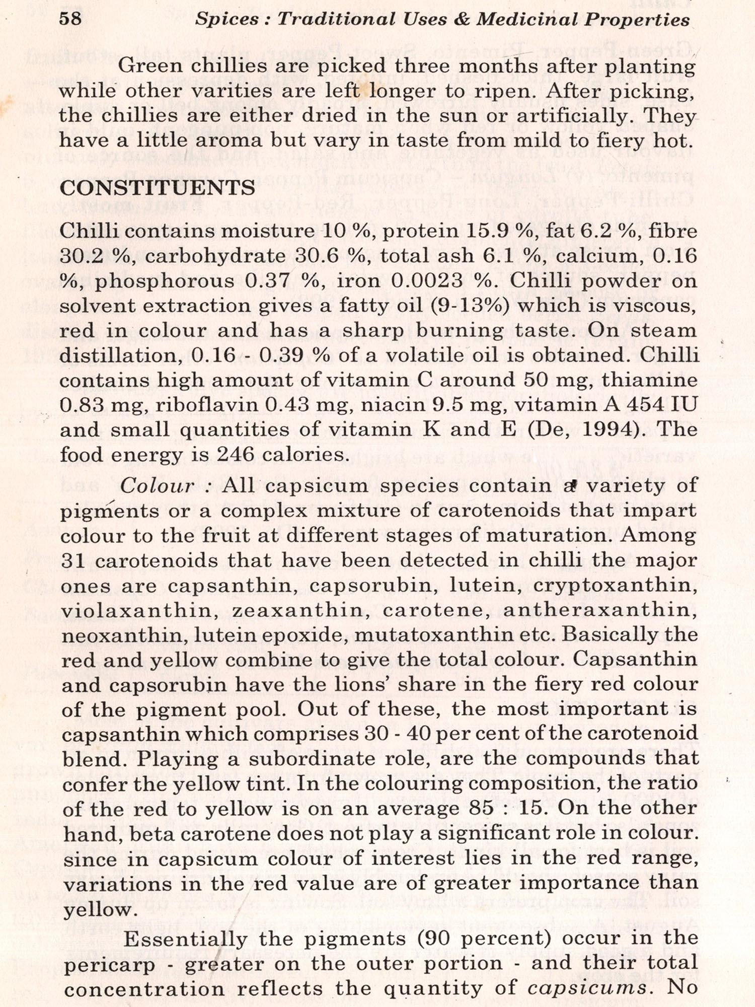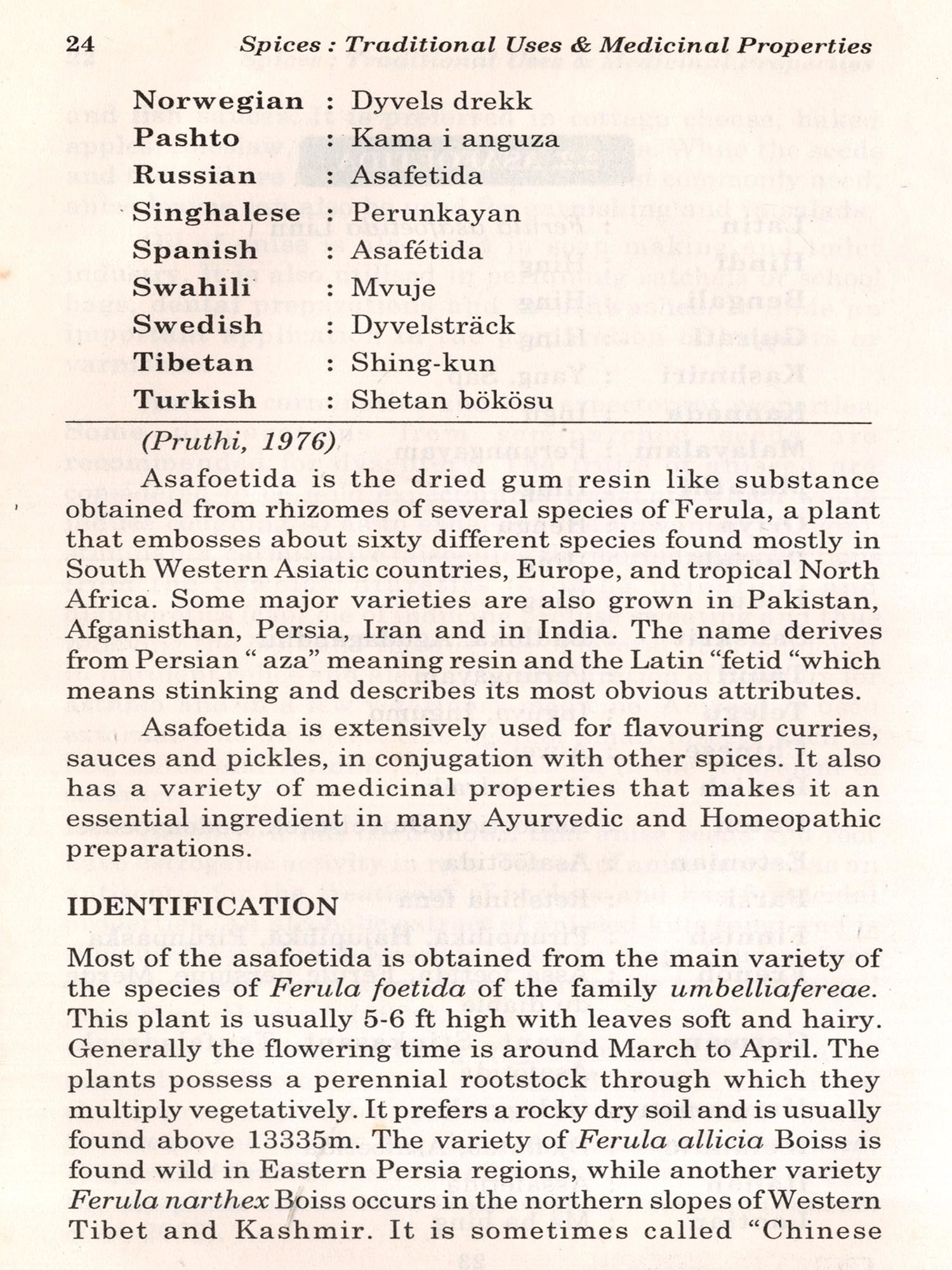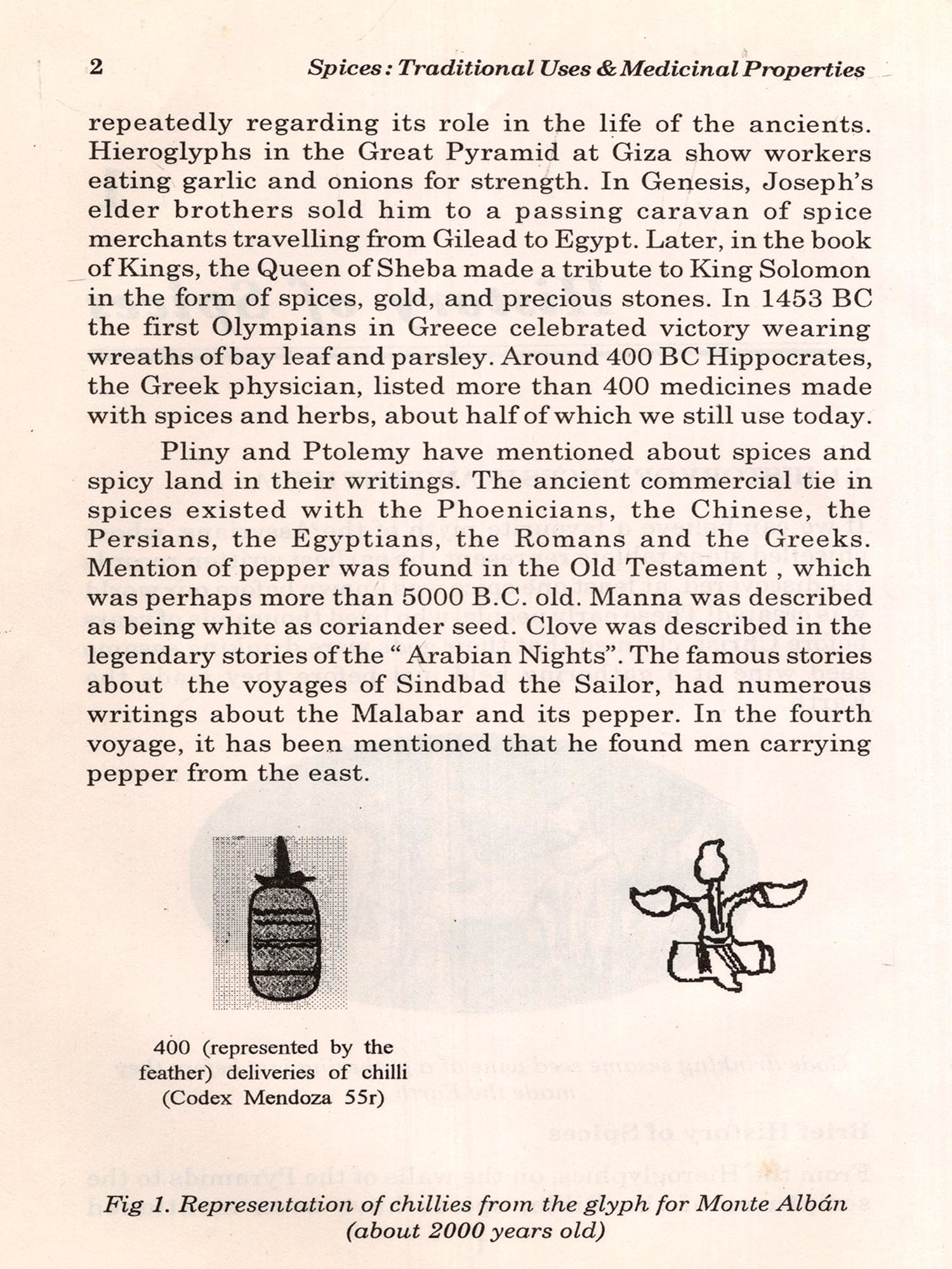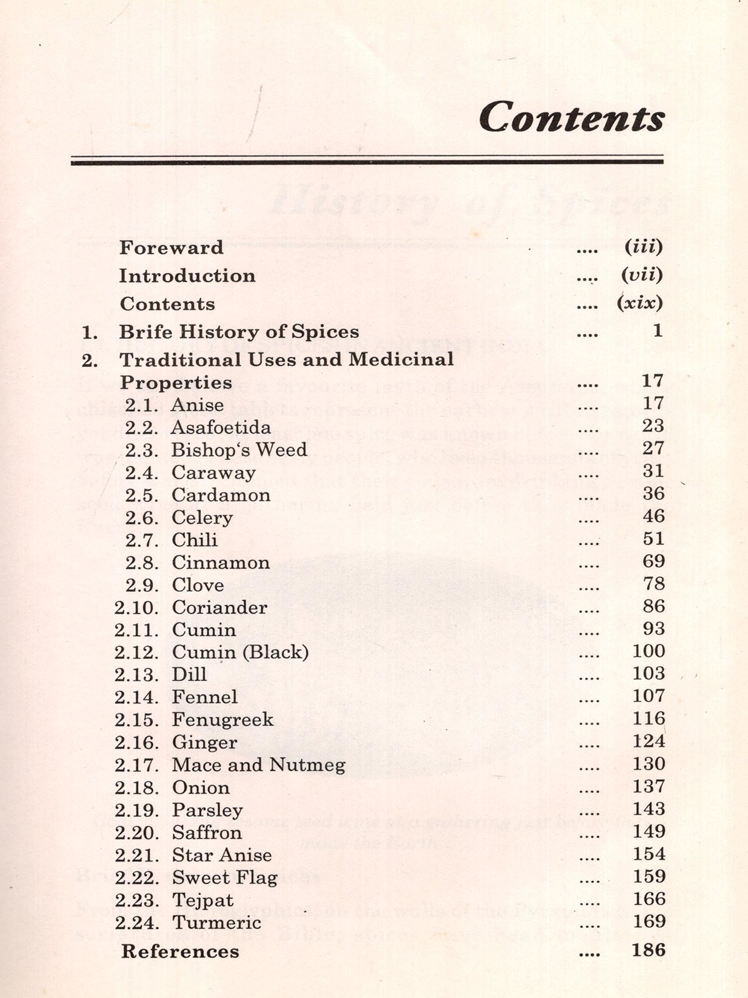 Spices have been used since ages in tribal and folk medicines and different traditional forms of ancient medicine like Ayurvedic, Unani and Sino-Tibetan systems. In Ayurveda specially, spices contributed a major amount for the treatment of major disorders of the body. Homoeopathic medicine has been using spices as one of the major ingredients in most of their preparations. In this respect, some major spices like chilli, pepper, ginger, garlic, bishop's weed, cumin, coriander, turmeric, mustard, asafoetida, fenugreek, onion, fennel, anise, cinnamon, tamarind etc plays a major role. Some of the traditional uses of spices in Asia and different parts of the world are summarised in Table 1.