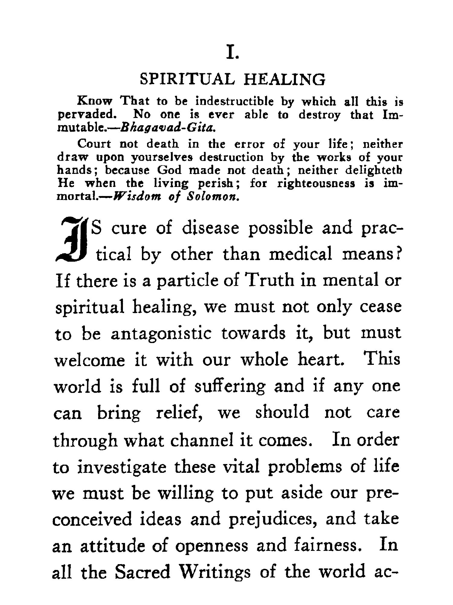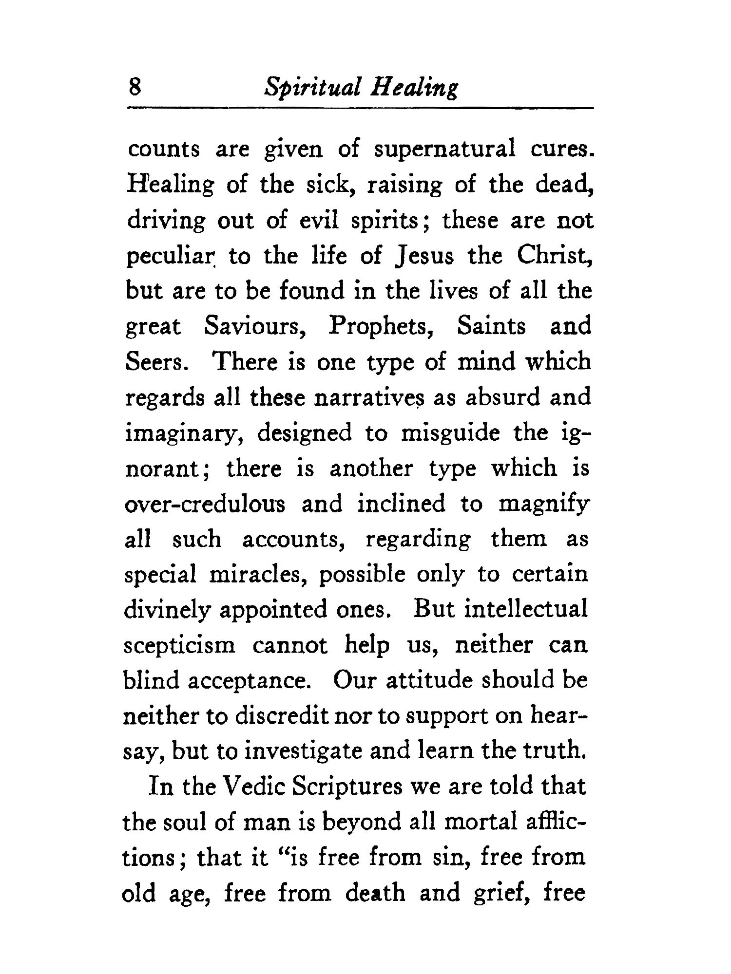 "Spiritual Healing" by Swami Paramananda explores the intersection of spirituality and well-being. The book outlines how inner harmony and self-realization can lead to physical and emotional healing. Swami Paramananda emphasizes that true healing comes from understanding and aligning with one's higher self and divine nature. He discusses techniques such as meditation, prayer, and positive thinking, which aid in overcoming personal challenges and fostering resilience. By integrating Vedantic principles with practical advice, Paramananda offers a holistic approach to health, advocating that spiritual growth and self-awareness are crucial for achieving lasting inner peace and overall well-being.