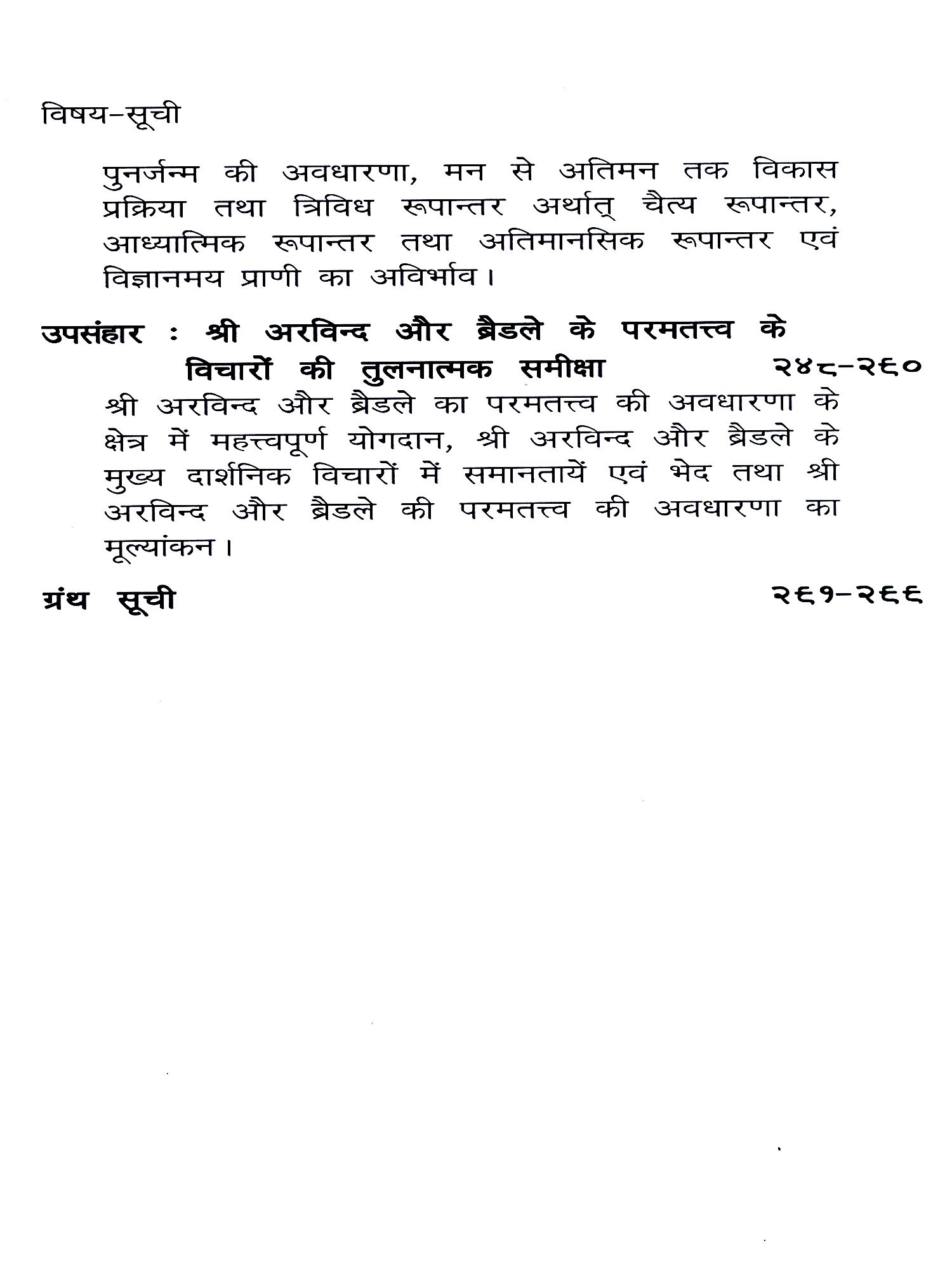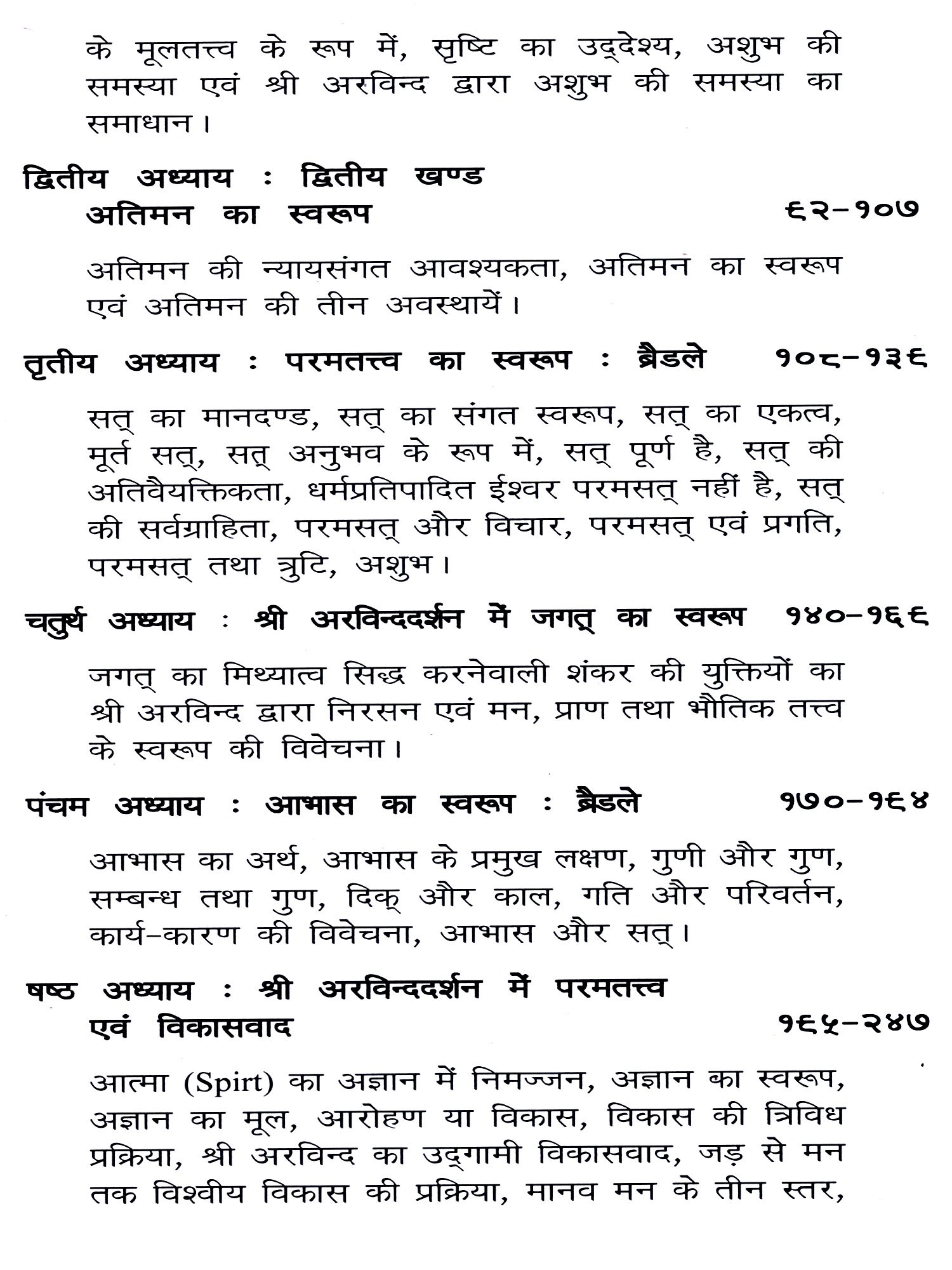 प्रस्तुत पुस्तक में विश्व के दो महान् दार्शनिकों की तत्त्वमीमांसा का तुलनात्मक अध्ययन किया गया है। श्री अरविन्द और ब्रेडले क्रमशः भारत और पाश्चात्य जगत् की महान् अध्यात्मवादी दार्शनिक परम्परा का प्रतिनिधित्व करते हैं। इन दोनों परम्पराओं में कुछ बातों में अत्यधिक साम्य तथा कुछ में मौलिक भेद है। श्री अरविन्द और ब्रैडले के दर्शन में ये स्पष्ट रूप से परिलक्षित होते हैं। लेखक ने इनके मुख्य सिद्धान्तों का विशद, गम्भीर तथा तर्कसंगत निरूपण एवं मूल्यांकन किया है। श्री अरविन्द के समग्र अद्वैतवाद, परमसत्, अतिमन, जगत्, जीव, विकासवाद आदि तथा ब्रैडले के परमसत्, बुद्धि, त्रुटि, आभास, तर्क प्रणाली आदि तत्त्वों और सिद्धान्तों की लेखक ने सरल, सुबोध एवं प्रामाणिक व्याख्या प्रस्तुत की है। इसके साथ ही इन दोनों दार्शनिकों के विशेष योगदान, उनकी समानताओं तथा भेद का भी स्पष्ट रूप से प्रतिपादन किया है। लेखक ने अपने अध्ययन में ब्रैडले की अपेक्षा श्री अरविन्द के मत का मुख्य रूप से समर्थन किया है। किन्तु इस विषय में उसने अतार्किक, हठवादी तथा संकुचित दृष्टिकोण नहीं अपनाया है। उसने ब्रैडले के प्रति भी यथाशक्ति न्याय करने का प्रयत्न किया है। इन सब दृष्टियों से यह ग्रंथ अत्यन्त महत्त्वपूर्ण तथा उपयोगी है।