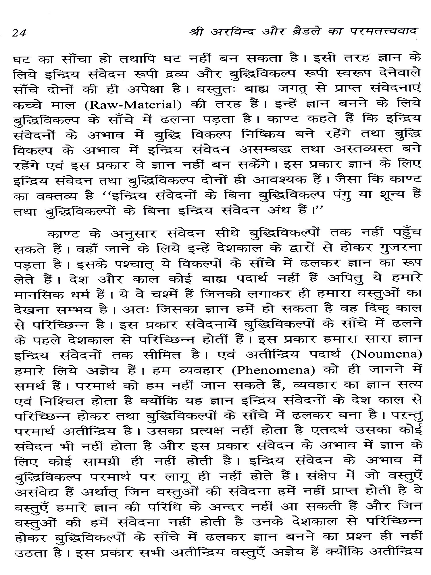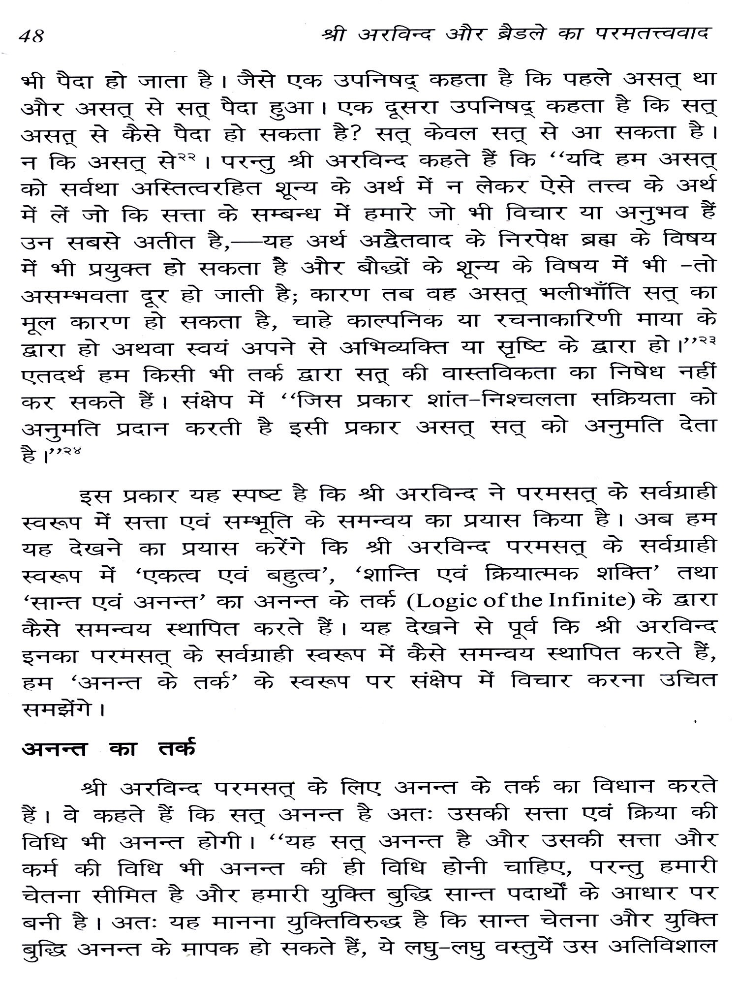 श्री अरविन्द और एफ० एच० ब्रैडले भारतीय और पाश्चात्य परम्परा के अत्यन्त विशिष्ट एवं प्रखर दार्शनिक हैं। प्रस्तुत ग्रन्थ में श्री अरविन्द और ब्रैडले की तत्त्वमीमांसीय अवधारणा की विवेचना तथा समीक्षा परमतत्त्व के विशेष सन्दर्भ में की गई है। तत्त्वमीमांसा के क्षेत्र में इन दोनों ही दार्शनिकों का विशिष्ट योगदान है और इस विशिष्ट योगदान के कारण ही श्री अरविन्द और ब्रैडले परमत्तत्व की अवधारणा के इतिहास में अत्यन्त ख्यातिलब्ध दार्शनिक हैं। इनकी चिन्तनधारा में क्रमशः प्राच्य और पाश्चात्य परमतत्त्ववादी परम्परायें अत्यन्त प्रौढ़ता को प्राप्त हुई हैं। समकालीन पाश्चात्य दर्शन इस महान् परमतत्त्ववादी परम्परा से दूर हो चुका है। परन्तु दर्शन के क्षेत्र में आज भी यह परमतत्त्ववादी परम्परा जीवन्त रूप में उपलब्ध है और भारत के आध्यात्मिक जीवन को अनुप्राणित कर रही है। परन्तु इस स्थल पर इस तथ्य को स्वीकार करना होगा कि भारत की परम्परागत ब्रह्मवादी चिन्तनधारा को आधुनिक सन्दर्भों में पुनर्व्याख्या एवं पुनर्दिशा-निर्धारण की अपेक्षा है। श्री अरविन्द के अतिरिक्त भारतीय परमतत्त्ववादी चिन्तनधारा की पुनर्व्याख्या का प्रयास के० सी० भट्टाचार्य, टैगोर, गाँधी तथा राधाकृष्णन् आदि ने भी किया है। परन्तु इन सभी प्रयासों में श्री अरविन्द का प्रयास उनके दर्शन की गम्भीरता, उदात्तता तथा समग्र दृष्टि के कारण उत्तरोत्तर समादृत हो रहा है।