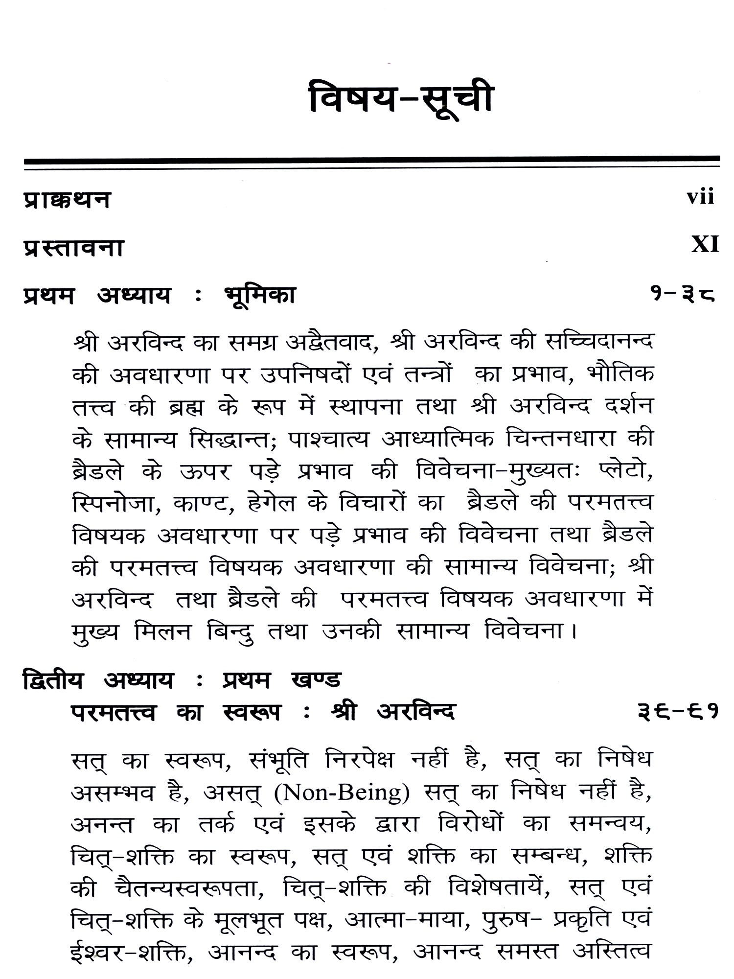 श्री अरविन्द और एफ० एच० ब्रैडले भारतीय और पाश्चात्य परम्परा के अत्यन्त विशिष्ट एवं प्रखर दार्शनिक हैं। प्रस्तुत ग्रन्थ में श्री अरविन्द और ब्रैडले की तत्त्वमीमांसीय अवधारणा की विवेचना तथा समीक्षा परमतत्त्व के विशेष सन्दर्भ में की गई है। तत्त्वमीमांसा के क्षेत्र में इन दोनों ही दार्शनिकों का विशिष्ट योगदान है और इस विशिष्ट योगदान के कारण ही श्री अरविन्द और ब्रैडले परमत्तत्व की अवधारणा के इतिहास में अत्यन्त ख्यातिलब्ध दार्शनिक हैं। इनकी चिन्तनधारा में क्रमशः प्राच्य और पाश्चात्य परमतत्त्ववादी परम्परायें अत्यन्त प्रौढ़ता को प्राप्त हुई हैं। समकालीन पाश्चात्य दर्शन इस महान् परमतत्त्ववादी परम्परा से दूर हो चुका है। परन्तु दर्शन के क्षेत्र में आज भी यह परमतत्त्ववादी परम्परा जीवन्त रूप में उपलब्ध है और भारत के आध्यात्मिक जीवन को अनुप्राणित कर रही है। परन्तु इस स्थल पर इस तथ्य को स्वीकार करना होगा कि भारत की परम्परागत ब्रह्मवादी चिन्तनधारा को आधुनिक सन्दर्भों में पुनर्व्याख्या एवं पुनर्दिशा-निर्धारण की अपेक्षा है। श्री अरविन्द के अतिरिक्त भारतीय परमतत्त्ववादी चिन्तनधारा की पुनर्व्याख्या का प्रयास के० सी० भट्टाचार्य, टैगोर, गाँधी तथा राधाकृष्णन् आदि ने भी किया है। परन्तु इन सभी प्रयासों में श्री अरविन्द का प्रयास उनके दर्शन की गम्भीरता, उदात्तता तथा समग्र दृष्टि के कारण उत्तरोत्तर समादृत हो रहा है।