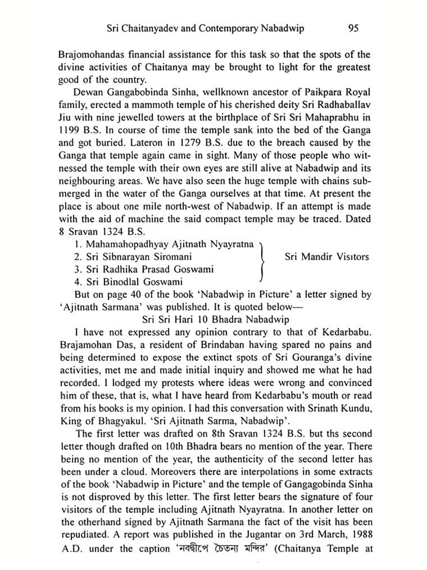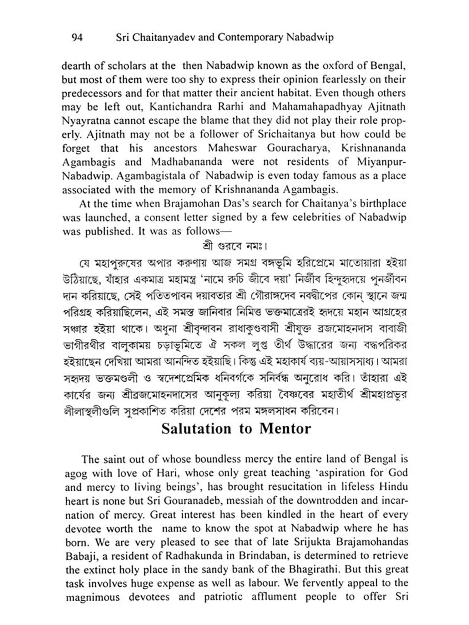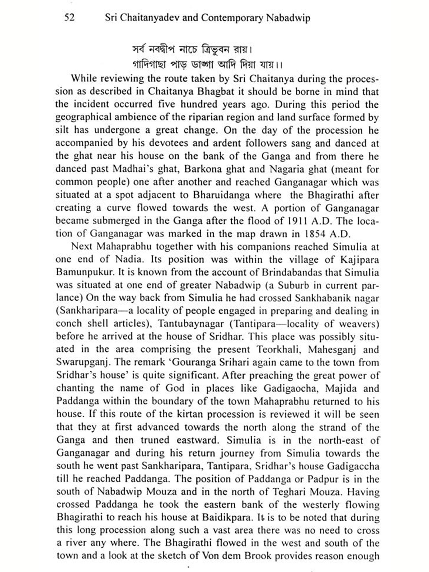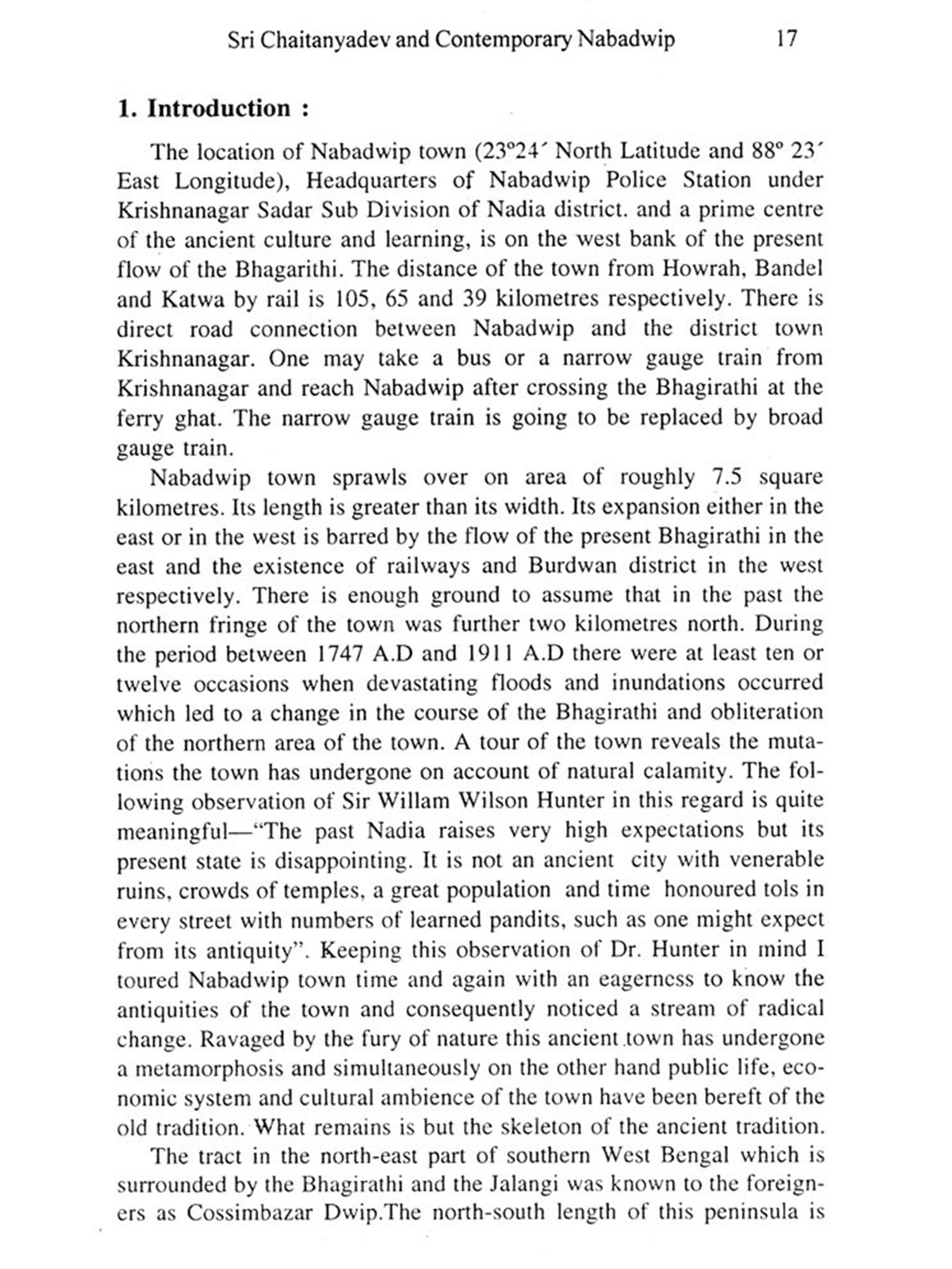 In the biographies of Sri Chaitanya like Murari Gupta's Sri Krishnachaitanya Chairtamrita, Kavi Karnapur's "Sri Chaitanya Charitamrita Mahakavyam and Sri Chaitanya Chandrodayam (drama), Brindabandas's Chaitanya Bhagbat, Jayananda's "Chaitanya Mangal', Lochan Das's "Chaitanya Mangal', Krishna das Kabiraj's Chaitanya Charitamrita ete. It is Nabadwip that has been mentioned as the place of birth of Sri Chaitanya. There was no controversy over the birthplace of Chaitanyadev prior to 1894 A.D. On 16th January 1894 Sri Kedarnath Datta the then Deputy Magistrate and Deputy Collector of Nadia District, on receiving a divine command and observing a miraculous light declared the char land of Mayapur to be the birthplace of Sri Chaitanya. Later on he bought land, erected temple and provided for the worship and upkeep of Mahaprabhu. Though Mayapur was propagated by Sri Kedarnath Datta as the birthplace of Sri Chaitanya neither history nor geography corroborates it. The book contains a detailed account of what still remains of the Nabadwip of Chaitanya's times after the devastations and formations of new territories caused by the relentless turbulence of the Ganga and the Jalangi.