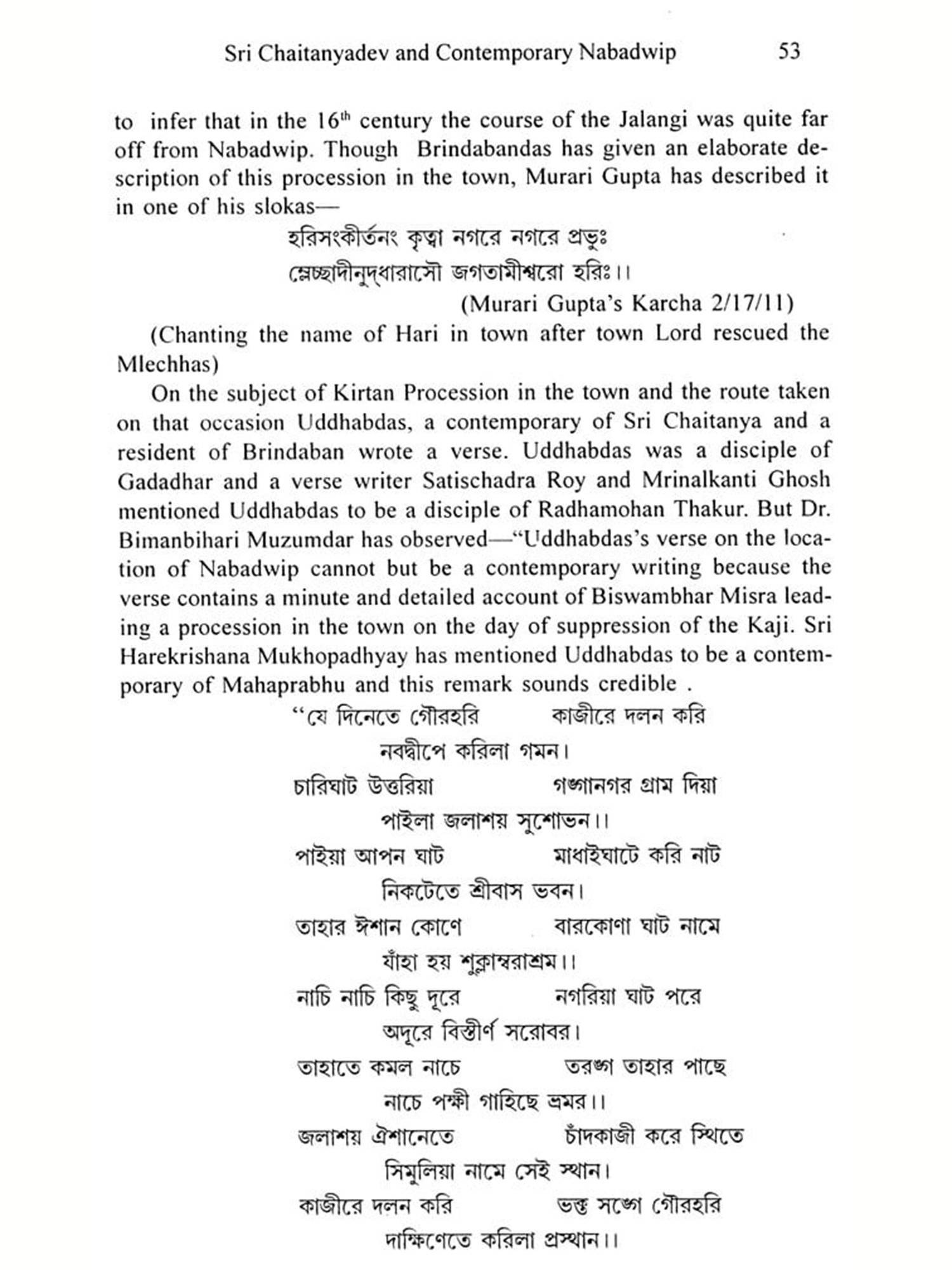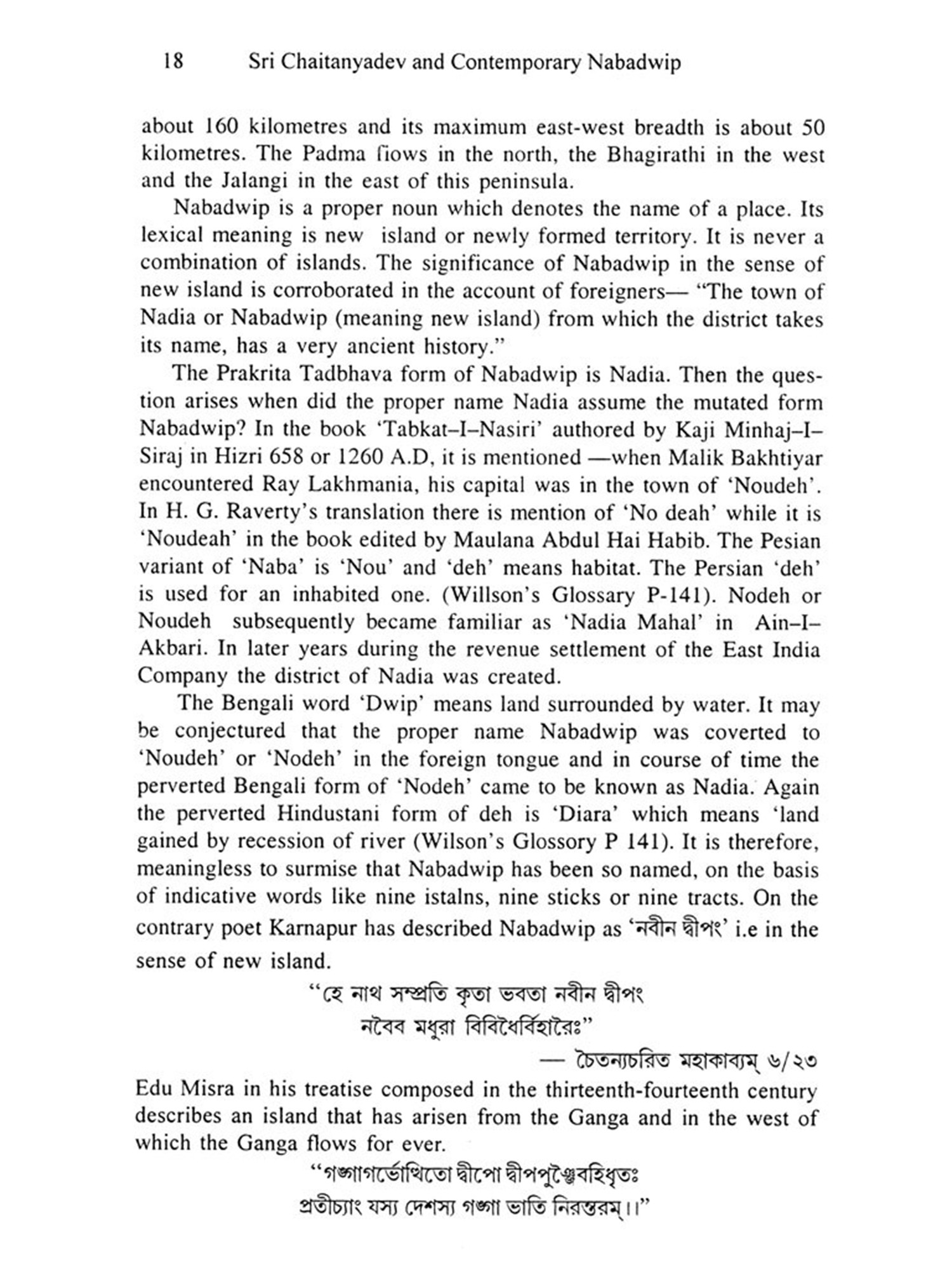 On Saturday the 23rd Falgun of the Saka era (27th February 1486A.D) during eclipse Sri Chaitanyadeb's advent took place at Nabadwip. This has been stated in the authentic and ancient books deal-ing with the divine activities of Chaitanya. That portion of ancient Nabadwip where Brahmin Palli was situated has been ravaged by the fury of repeated devastating floods in the eighteenth century. The Nabadwip described by Murari Gupta and Brindaban Das has now- a-days been transformed into hollow riverbed and sandy land. Even the geographical enviroment of Nabadwip of five hundred years ago has undergone a redical change. There is a divergence of opinion over the naming of Nabadwip. According to one view Nabadwip derives its name on account of con-glomeration of nine islands while according to another view the name of Nabadwip originated from the sight of nine burning lamps.