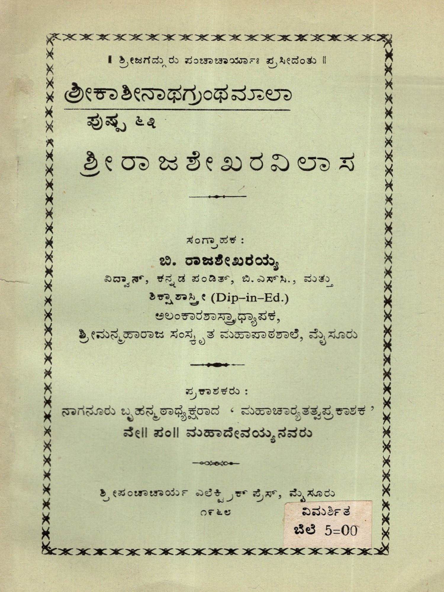 Sundarakanda Sangraha of Champuramayanam by Bhoja Kautilya's Arthashastra Vinayadhikarana (Vidyasamuddesha, Vruddhasamyoga and Indriyajaya) Kannada