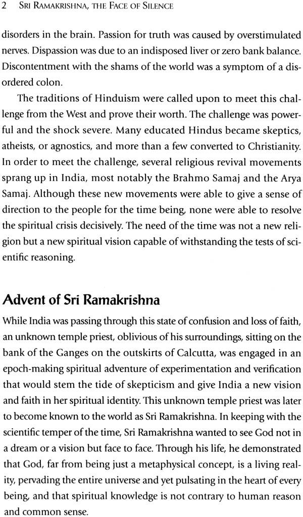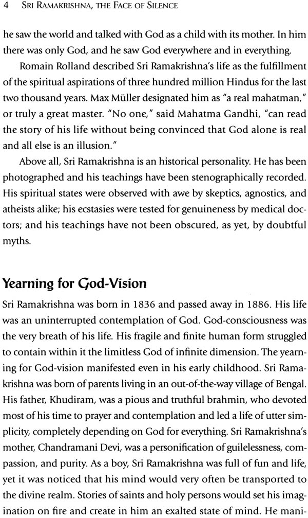 Writers and thinkers have used many epithets in an attempt to describe Sri Ramakrishna: Prophet for the New Age, Prophet of the Harmony of Religions, God man of Modem India, Spiritual Hero, Savior of the Eternal Religion, the Great Master, a Phenomenon. But perhaps no description is more profound or intriguing than that given by Dhan Gopal Mukerji: the Face of Silence. It was this 1926 biography that was destined to play a key role in introducing the life and teachings of Sri Ramakrishna to the world.