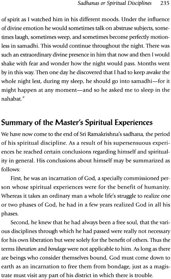 A second major feature of the present book is the biography of Sri Ramakrishna by Swami Nikhilananda, originally published in 1942 as an introduction to The Gospel of Sri Ramakrishna, the swami’s monumental English translation of the conversations of Sri Ramakrishna with his disciples, devotees, and visitors. In this biography, the reader will find a historically accurate portrayal of the life of the Master, descriptions of people who came in contact with him, and short explanations of several systems of Indian religious thought intimately connected with Sri Ramakrishna’s life The biography will enable the reader to better understand and appreciate the unusual life of Sri Ramakrishna.