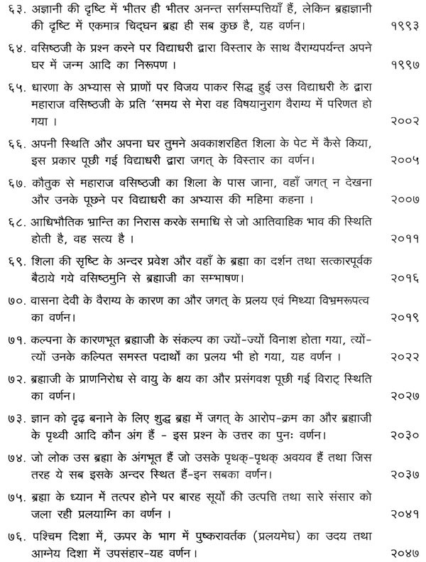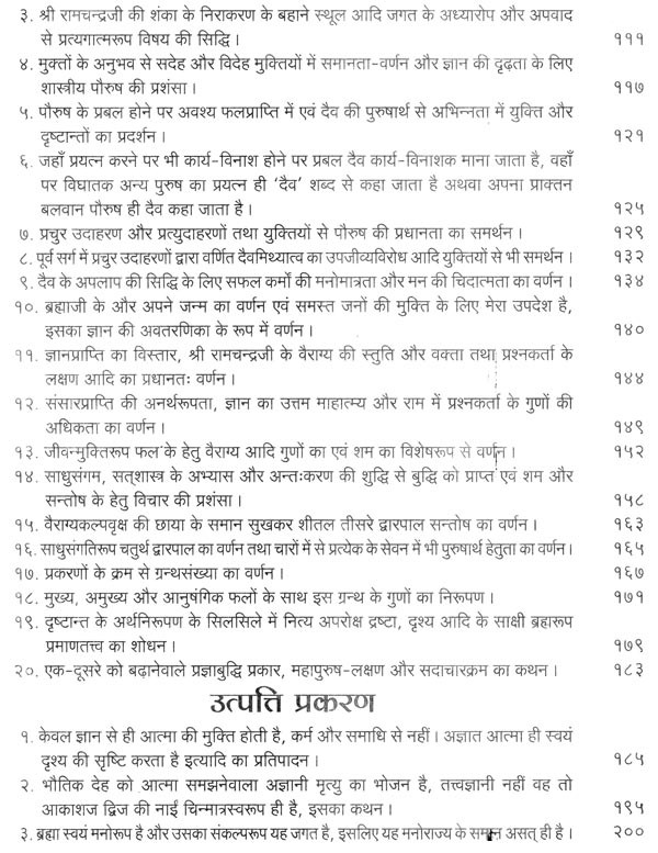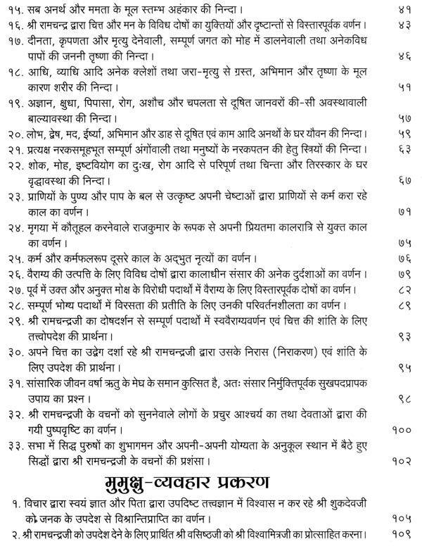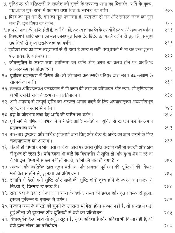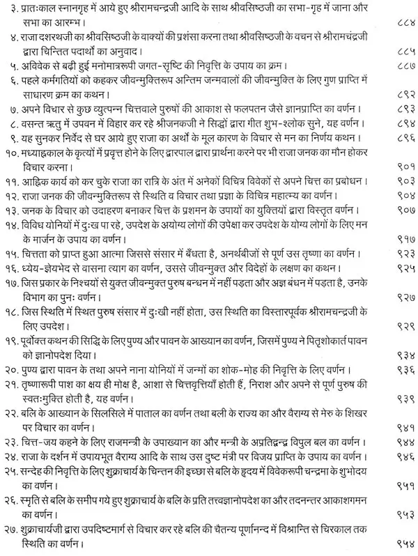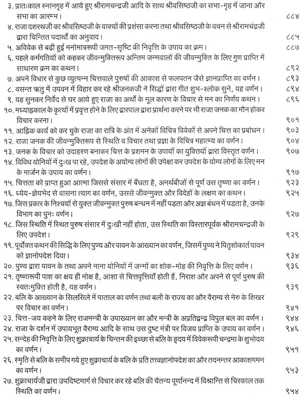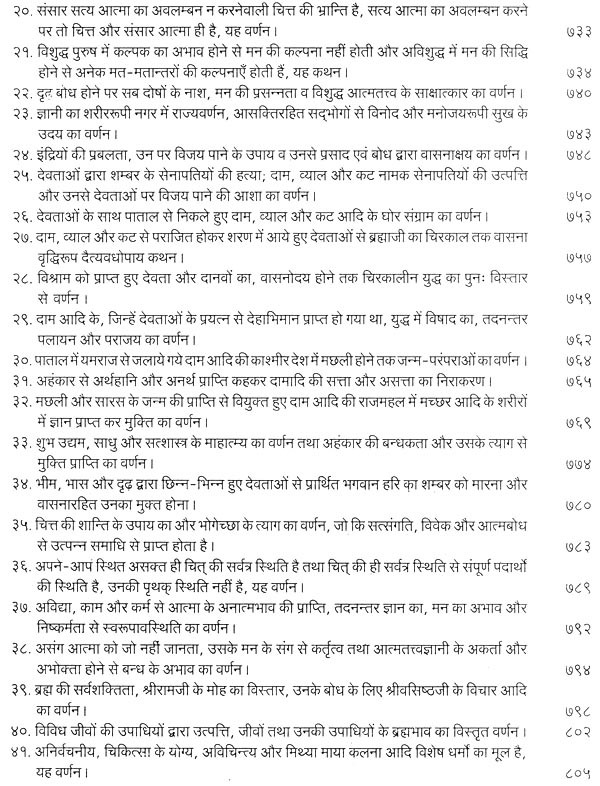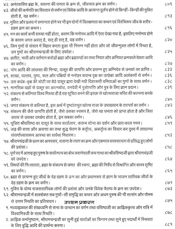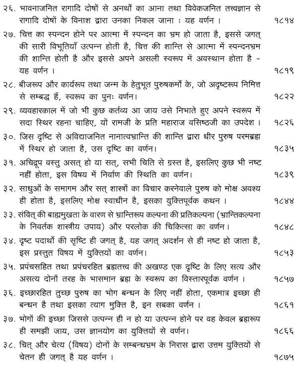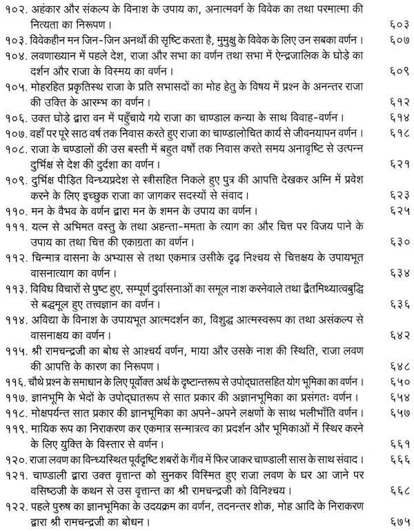 भगवान श्रीरामजी को आदर के साथ राजसभा में लाया गया और वहीं उन्होंने अपने हृदय के विचार प्रकट किये। इन्हीं विचारों का वर्णन 'श्री योगवासिष्ठ महारामायण' के पहले प्रकरण वैराग्य प्रकरण' में किया गया है। फिर वसिष्ठजी और विश्वामित्रजी ने श्रीरामजी के वैराग्य की सराहना की और जैसे बीज बोकर सिंचाई की जाती है, वैसे उनको उपदेश देकर उनमें संस्कार सींचे। इन उपदेशों का ॐ वर्णन दूसरे प्रकरण 'मुमुक्षु व्यवहार प्रकरण में किया गया है। फिर 'सृष्टि का मूल क्या है और जगल की उत्पत्ति कैसे हुई ?' इसका उपदेश दिया गया, जिसका वर्णन तीसरे प्रकरण 'उत्पत्ति प्रकरण में किया गया है। फिर अनात्मा से उपराम होकर आत्मा में स्थिति करने का उपदेश दिया गया, जिसका वर्णन चौथे प्रकरण 'स्थिति प्रकरण' में किया गया है। फिर उपदेश का सिलसिला बढ़ता गया और सुख दुःख में समता का अभ्यास करने और परमात्मा में विश्रांति पाने का उपदेश दिया गया, जिसका वर्णन पाँचवें प्रकरण 'उपशम प्रकरण' में किया गया है। जैसे तेल खत्म हो जाने पर दीया बुझ जाता है, निर्वाण हो जाता है, वैसे ही मन को हमारी सत्ता न मिलने से उसकी दौड़, मटकान खत्म हो जाती है अर्थात् मन का निर्वाण हो जाता है। इसीका उपदेश आखिरी छठे प्रकरण 'निर्वाण प्रकरण' में दिया गया है।