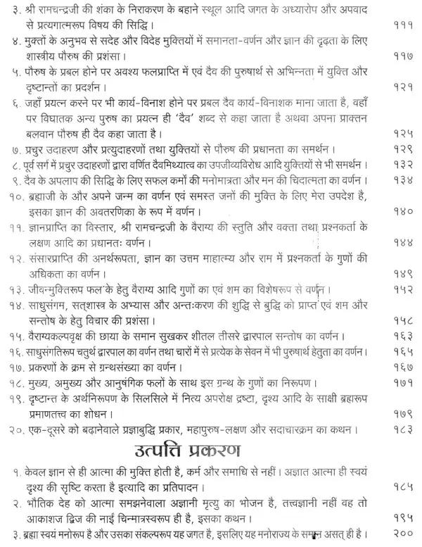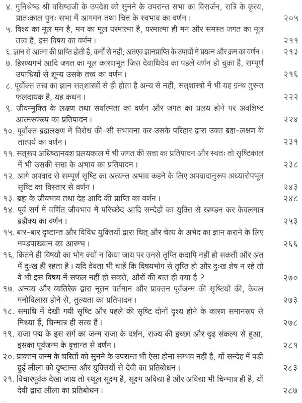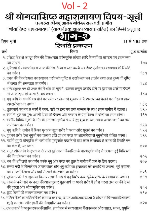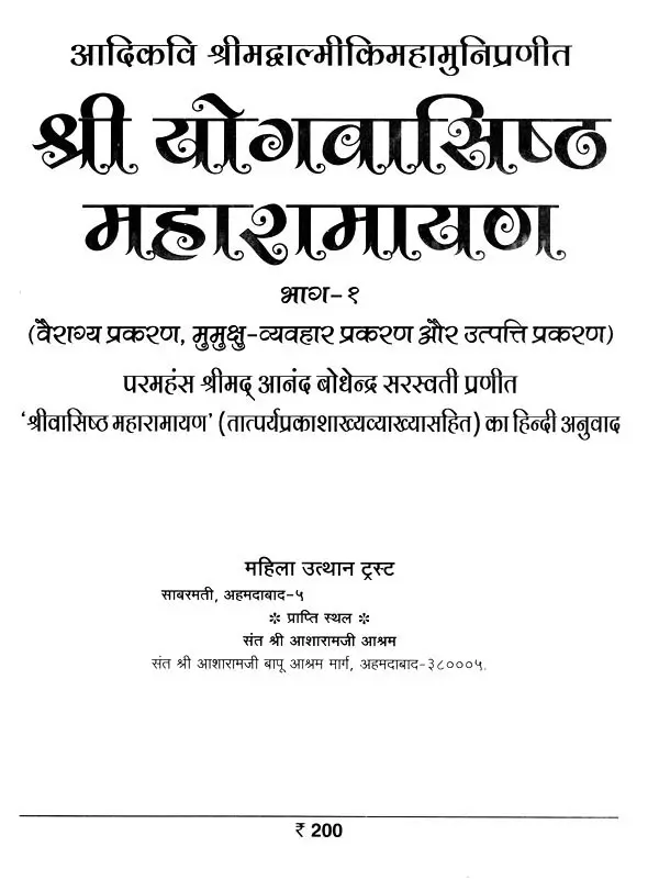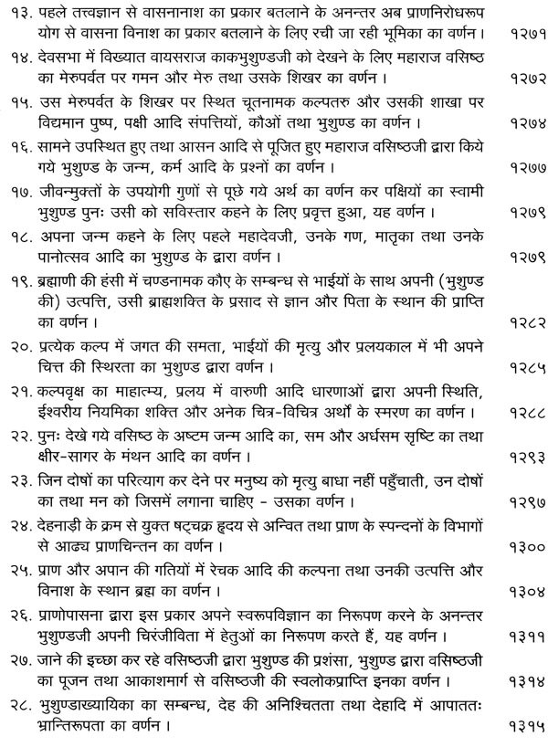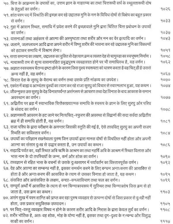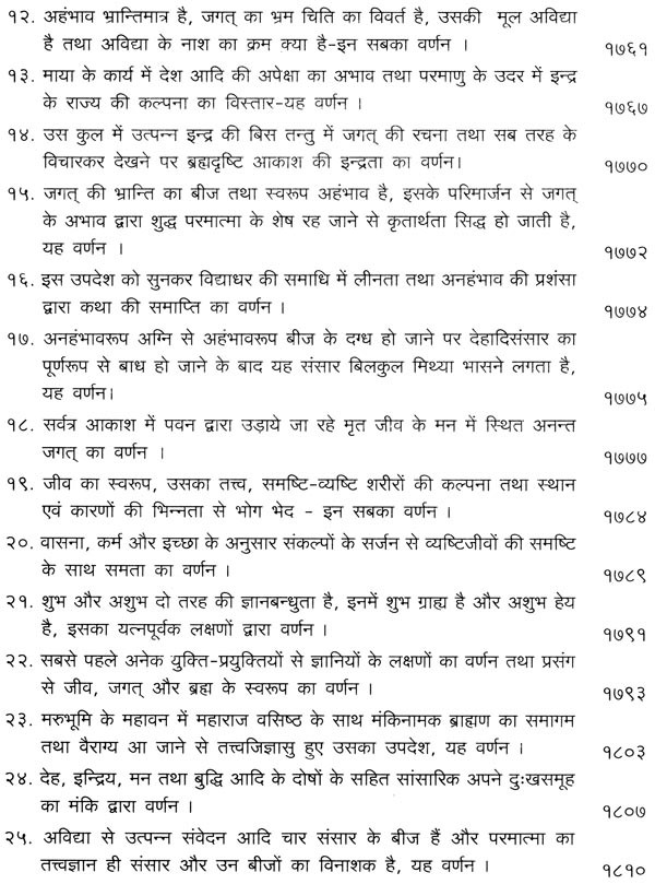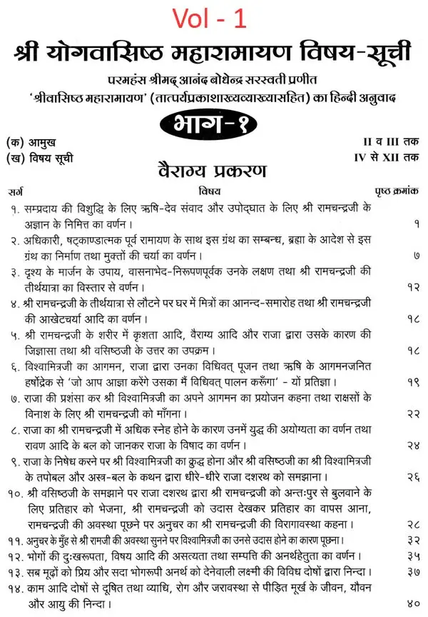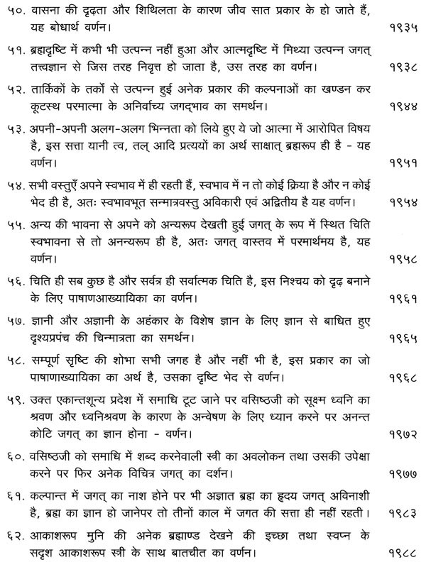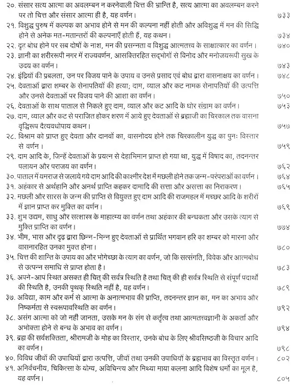 भगवान श्रीरामजी को आदर के साथ राजसभा में लाया गया और वहीं उन्होंने अपने हृदय के विचार प्रकट किये। इन्हीं विचारों का वर्णन 'श्री योगवासिष्ठ महारामायण' के पहले प्रकरण वैराग्य प्रकरण' में किया गया है। फिर वसिष्ठजी और विश्वामित्रजी ने श्रीरामजी के वैराग्य की सराहना की और जैसे बीज बोकर सिंचाई की जाती है, वैसे उनको उपदेश देकर उनमें संस्कार सींचे। इन उपदेशों का ॐ वर्णन दूसरे प्रकरण 'मुमुक्षु व्यवहार प्रकरण में किया गया है। फिर 'सृष्टि का मूल क्या है और जगल की उत्पत्ति कैसे हुई ?' इसका उपदेश दिया गया, जिसका वर्णन तीसरे प्रकरण 'उत्पत्ति प्रकरण में किया गया है। फिर अनात्मा से उपराम होकर आत्मा में स्थिति करने का उपदेश दिया गया, जिसका वर्णन चौथे प्रकरण 'स्थिति प्रकरण' में किया गया है। फिर उपदेश का सिलसिला बढ़ता गया और सुख दुःख में समता का अभ्यास करने और परमात्मा में विश्रांति पाने का उपदेश दिया गया, जिसका वर्णन पाँचवें प्रकरण 'उपशम प्रकरण' में किया गया है। जैसे तेल खत्म हो जाने पर दीया बुझ जाता है, निर्वाण हो जाता है, वैसे ही मन को हमारी सत्ता न मिलने से उसकी दौड़, मटकान खत्म हो जाती है अर्थात् मन का निर्वाण हो जाता है। इसीका उपदेश आखिरी छठे प्रकरण 'निर्वाण प्रकरण' में दिया गया है।