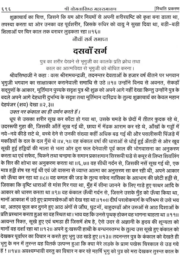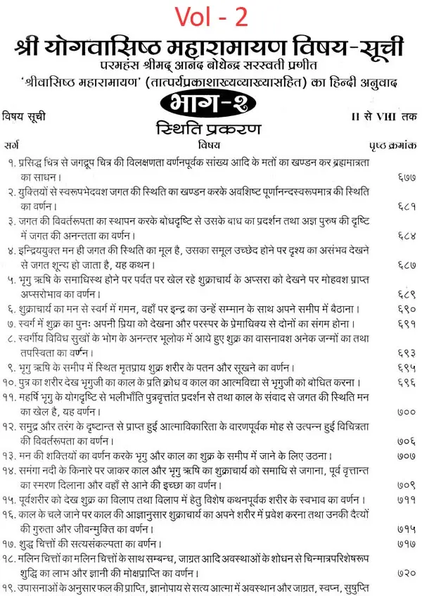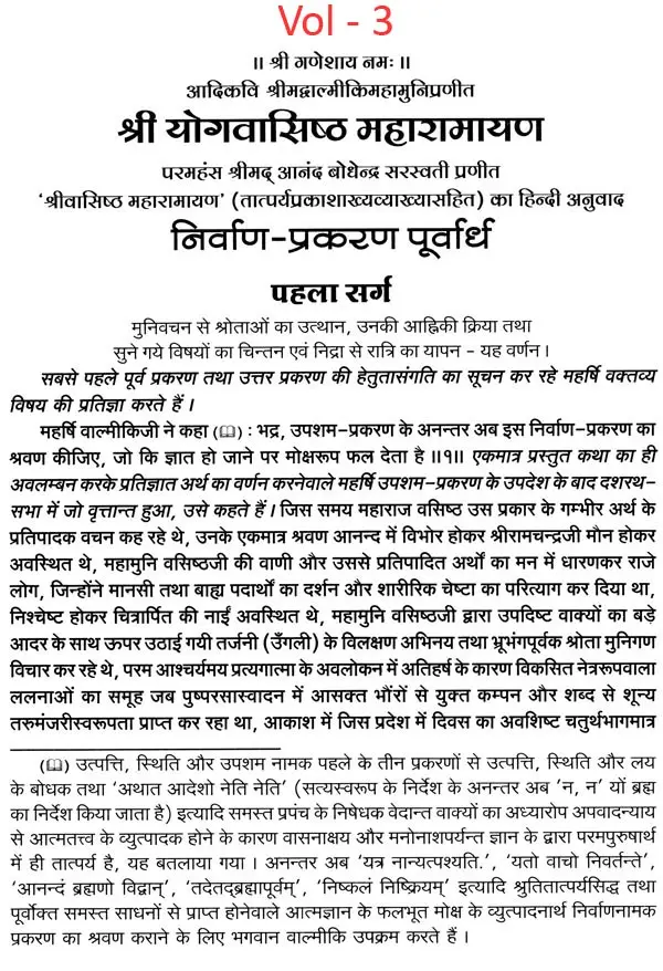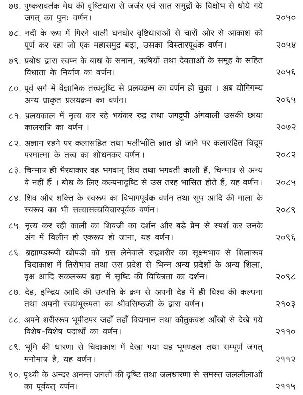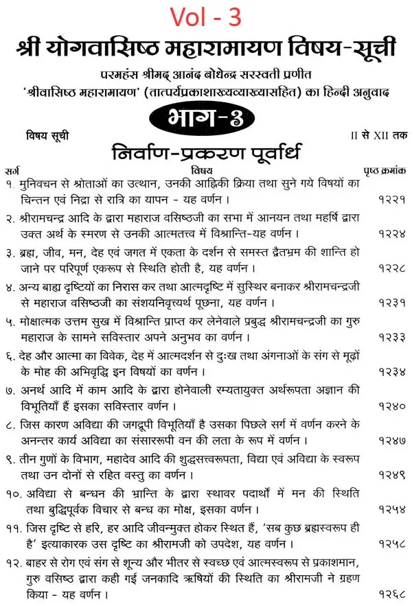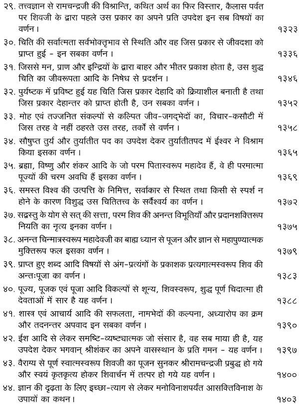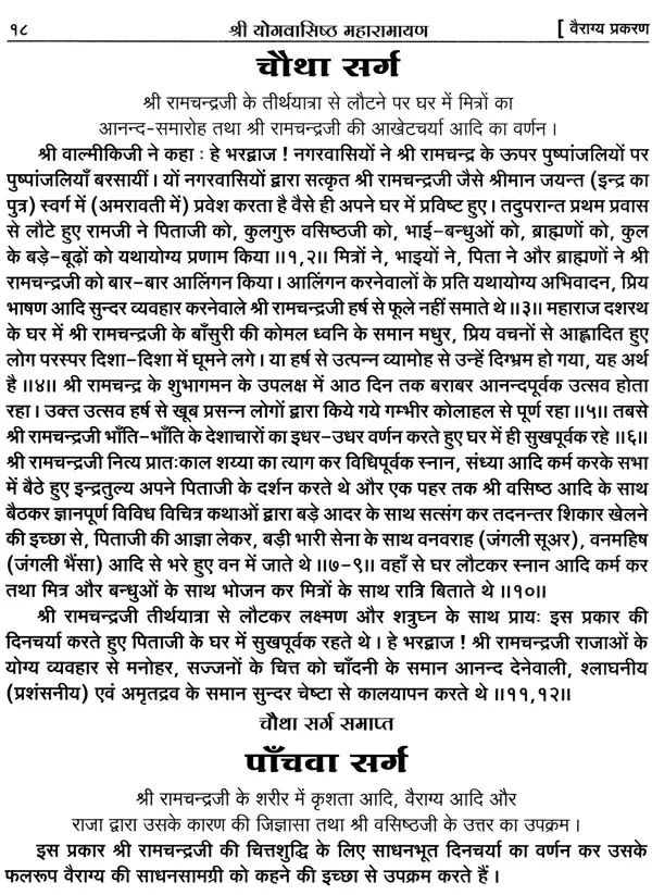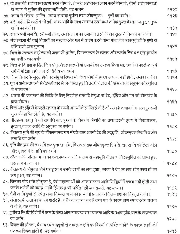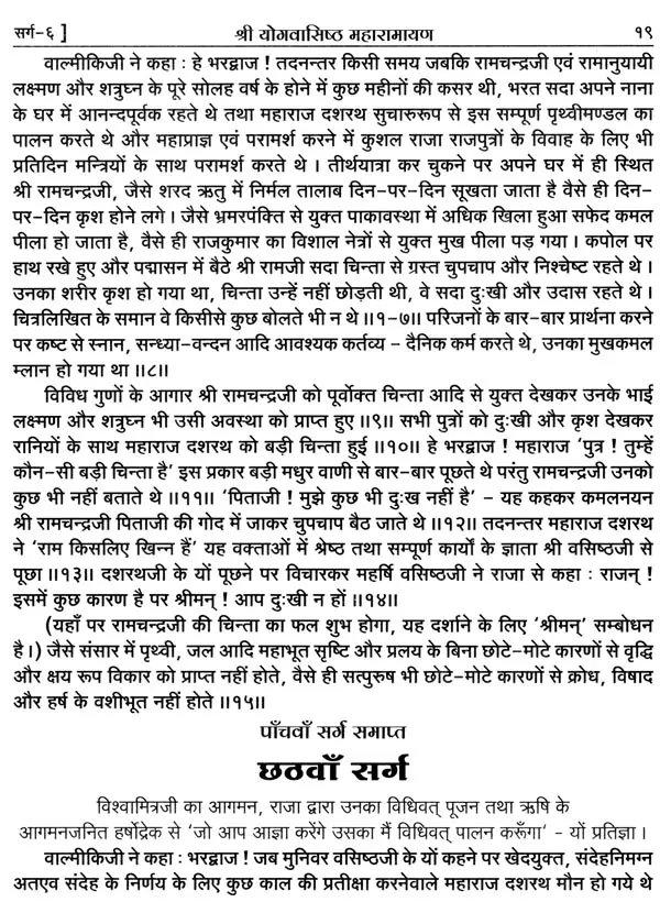 भगवान श्रीरामजी को आदर के साथ राजसभा में लाया गया और वहीं उन्होंने अपने हृदय के विचार प्रकट किये। इन्हीं विचारों का वर्णन 'श्री योगवासिष्ठ महारामायण' के पहले प्रकरण वैराग्य प्रकरण' में किया गया है। फिर वसिष्ठजी और विश्वामित्रजी ने श्रीरामजी के वैराग्य की सराहना की और जैसे बीज बोकर सिंचाई की जाती है, वैसे उनको उपदेश देकर उनमें संस्कार सींचे। इन उपदेशों का ॐ वर्णन दूसरे प्रकरण 'मुमुक्षु व्यवहार प्रकरण में किया गया है। फिर 'सृष्टि का मूल क्या है और जगल की उत्पत्ति कैसे हुई ?' इसका उपदेश दिया गया, जिसका वर्णन तीसरे प्रकरण 'उत्पत्ति प्रकरण में किया गया है। फिर अनात्मा से उपराम होकर आत्मा में स्थिति करने का उपदेश दिया गया, जिसका वर्णन चौथे प्रकरण 'स्थिति प्रकरण' में किया गया है। फिर उपदेश का सिलसिला बढ़ता गया और सुख दुःख में समता का अभ्यास करने और परमात्मा में विश्रांति पाने का उपदेश दिया गया, जिसका वर्णन पाँचवें प्रकरण 'उपशम प्रकरण' में किया गया है। जैसे तेल खत्म हो जाने पर दीया बुझ जाता है, निर्वाण हो जाता है, वैसे ही मन को हमारी सत्ता न मिलने से उसकी दौड़, मटकान खत्म हो जाती है अर्थात् मन का निर्वाण हो जाता है। इसीका उपदेश आखिरी छठे प्रकरण 'निर्वाण प्रकरण' में दिया गया है।