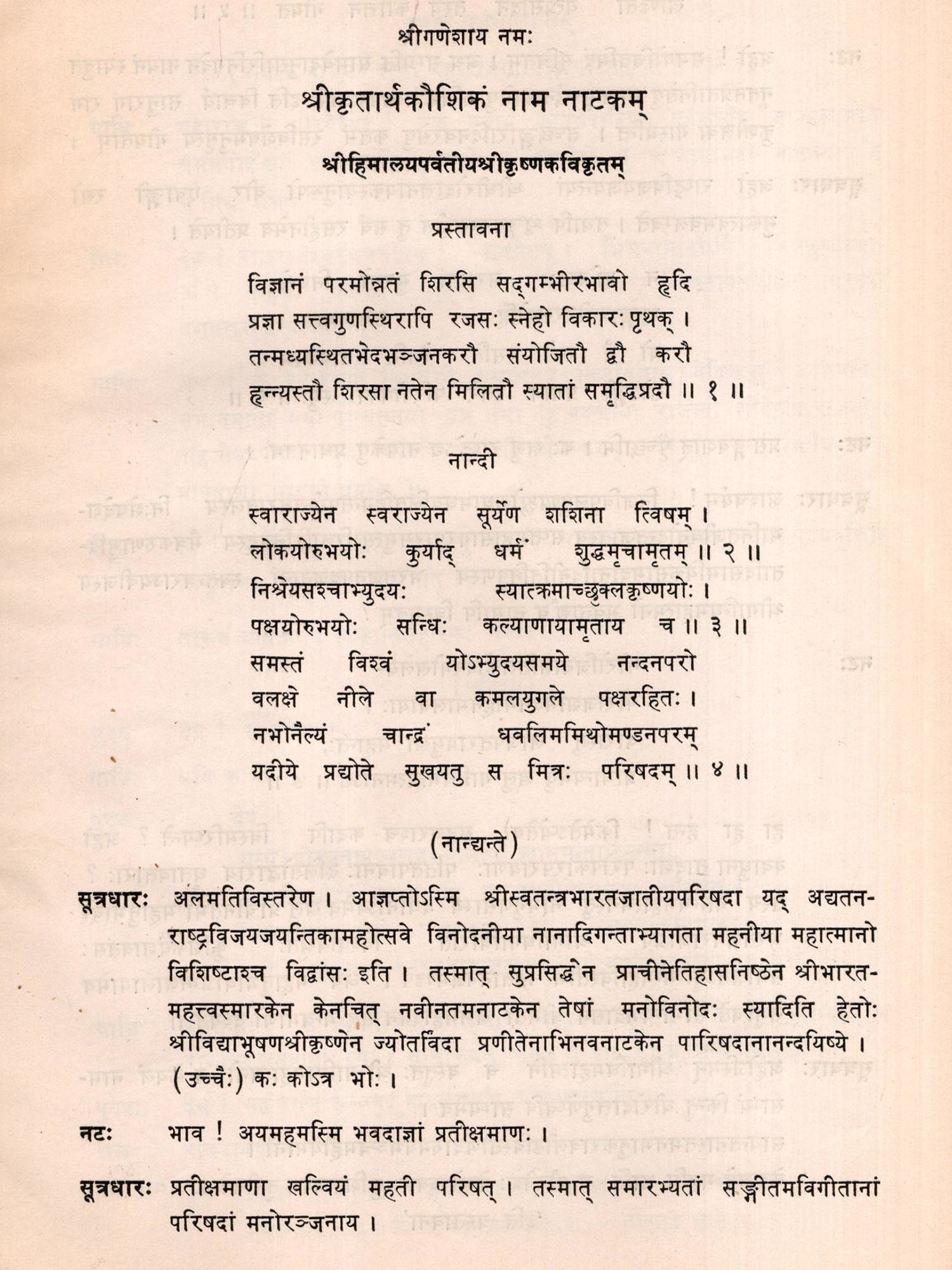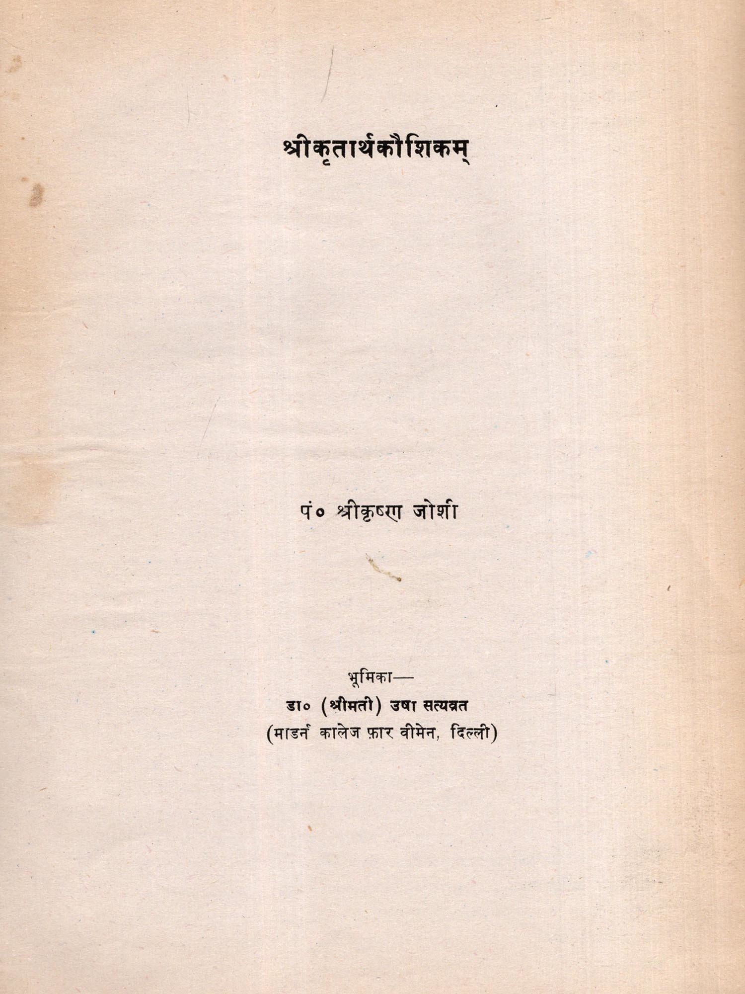 संस्कृत-साहित्य-प्रेमियों के लिए यह सौभाग्य तथा आनन्द का विषय है कि अखिल भारतीय संस्कृत-परिषद्, लखनऊ पण्डितप्रवर श्रीकृष्ण जोशी जी के विलक्षण नाटक 'श्रीकृतार्थकौशिकम्' को प्रकाशित कर के सहृदयों के रसास्वादन के लिए प्रस्तुत कर रही है। इसके लिए परिषद् धन्यवाद की पात्र है।