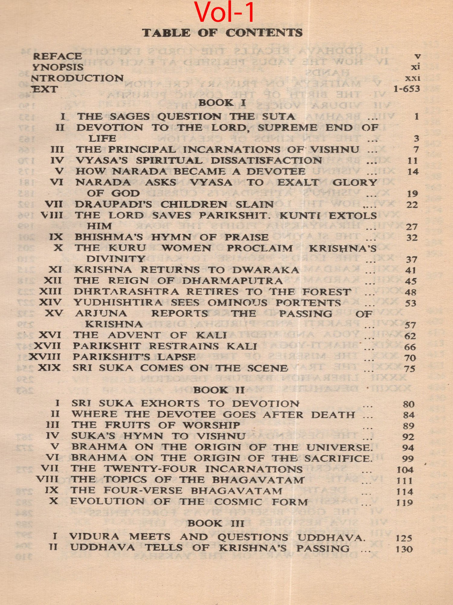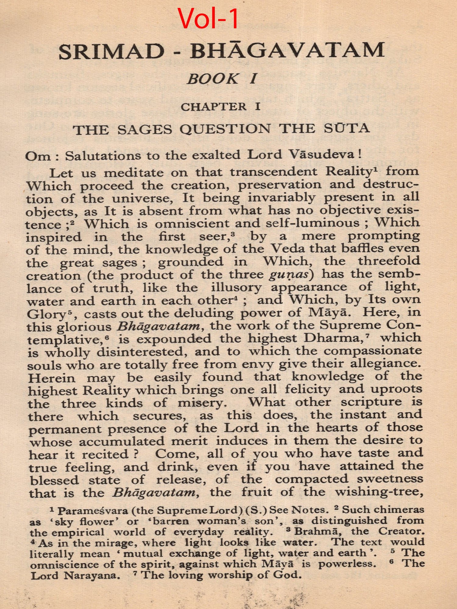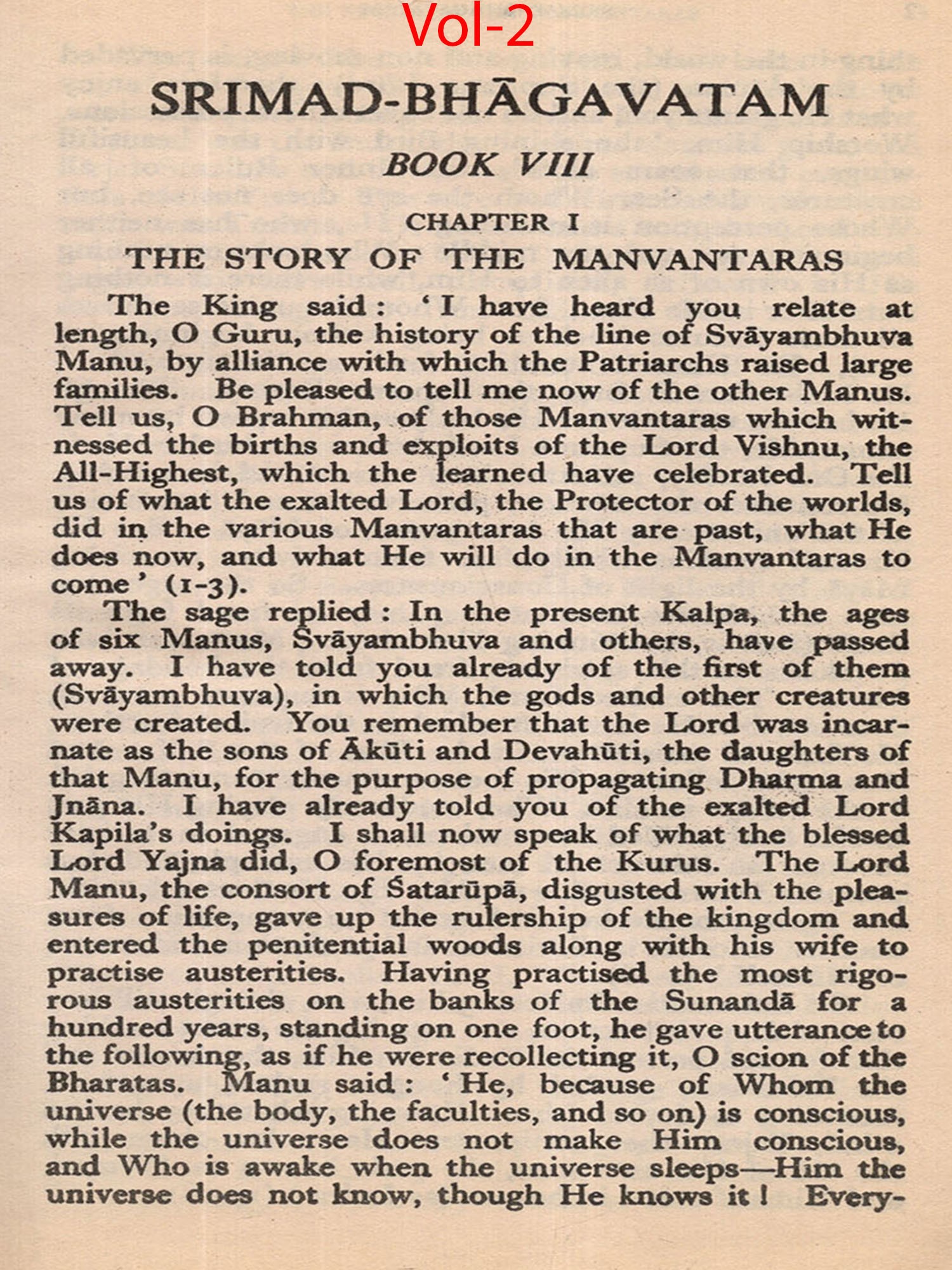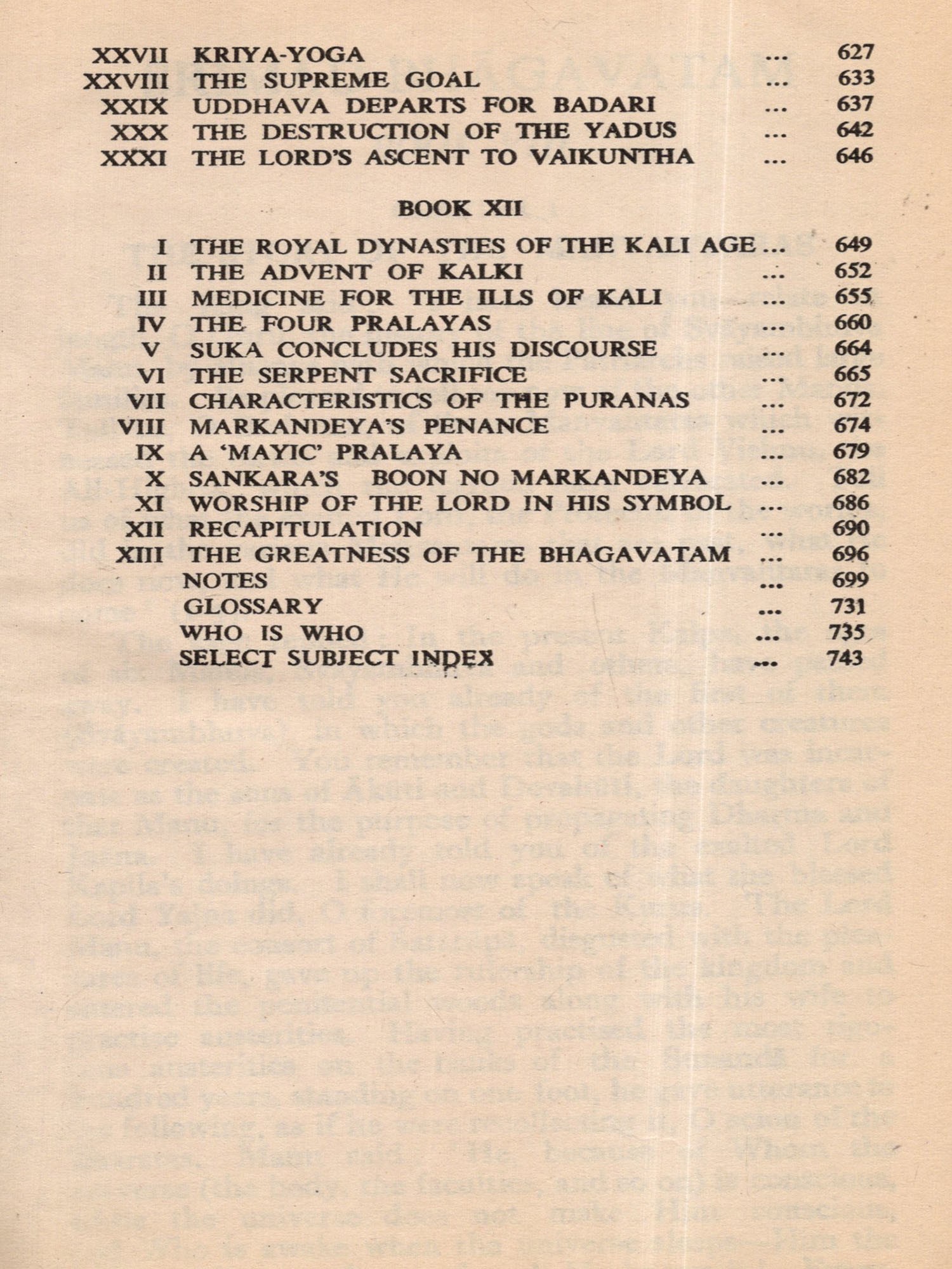 Much of the difficulty in interpreting the Bhagavatam is due to the unsettled state of the text. The Oriental Institute, Baroda, has undertaken the production of a critical edition, but it may take years before the project is completed. The present translation, based on a comparison of the texts relied upon by the principal commentaries, aims at providing an authentic rendering in euphonious, lucid prose. a version which shall be idiomatic, faithful and exact without being too literal (or word for word). The foot-notes, kept to a minimum, give important variant readings; and since the text is often elliptical, they also offer brief elucidations of important passages and suggest connecting links. With the text itself no liberty is taken. The supply within brackets of the more familiar for the less familiar name of a god or hero should be of help to the non-Sanskritist. The Bhagavatam is almost unique in the number of commentaries and dissertations it has inspired down the ages (see. p. 654, infra). No translator can afford to neglect them. Almost every commentary attempts the elucidation of the text in the light of a particular school of philosophy. While this translation has tried to follow the plain meaning of the text uninfluenced by the bias of any particular commentator, it endeavours, where it has to follow one particular interpretation as being the most plausible, to give in summary in the Notes at the end the interpretations of others. But in this respect these Notes do not claim to be either comprehensive or exhaustive. The Notes have also been utilized to give brief summaries of the extensive additions to the text that are found, notably in the Madhva version, and to indicate the rather fewer omissions from what may, for convenience, be termed the Vulgate, that used by Sridharaswamin. The synopsis provided for Vol. I (Vol. II hardly needs one), the select subject index, the glossary of Samskrit words (which are kept at a minimum in the text and printed with a minimum number of diacritical marks) and the brief notes on important characters and events, should help the reader to find his way through the labyrinth of Puranic mythology, and the difficulties caused by the sea-saw technique of narration and the employment of more than one narrator. The translation aims to serve the generalreader, without neglecting the needs of the student. The unique popularity of the Bhagavatam is due to the fact that the mysticism of loving devotion, which goes back to the Veda, finds its consummation in the extraordinarily vivid portrayal of the Divine Personality of Sri Krishna, the Spirit of Delight, the Ananda of the Upanishads. It is hoped that the translation may succeed in communicating to the reader something of its haunting beauty and compelling charm.