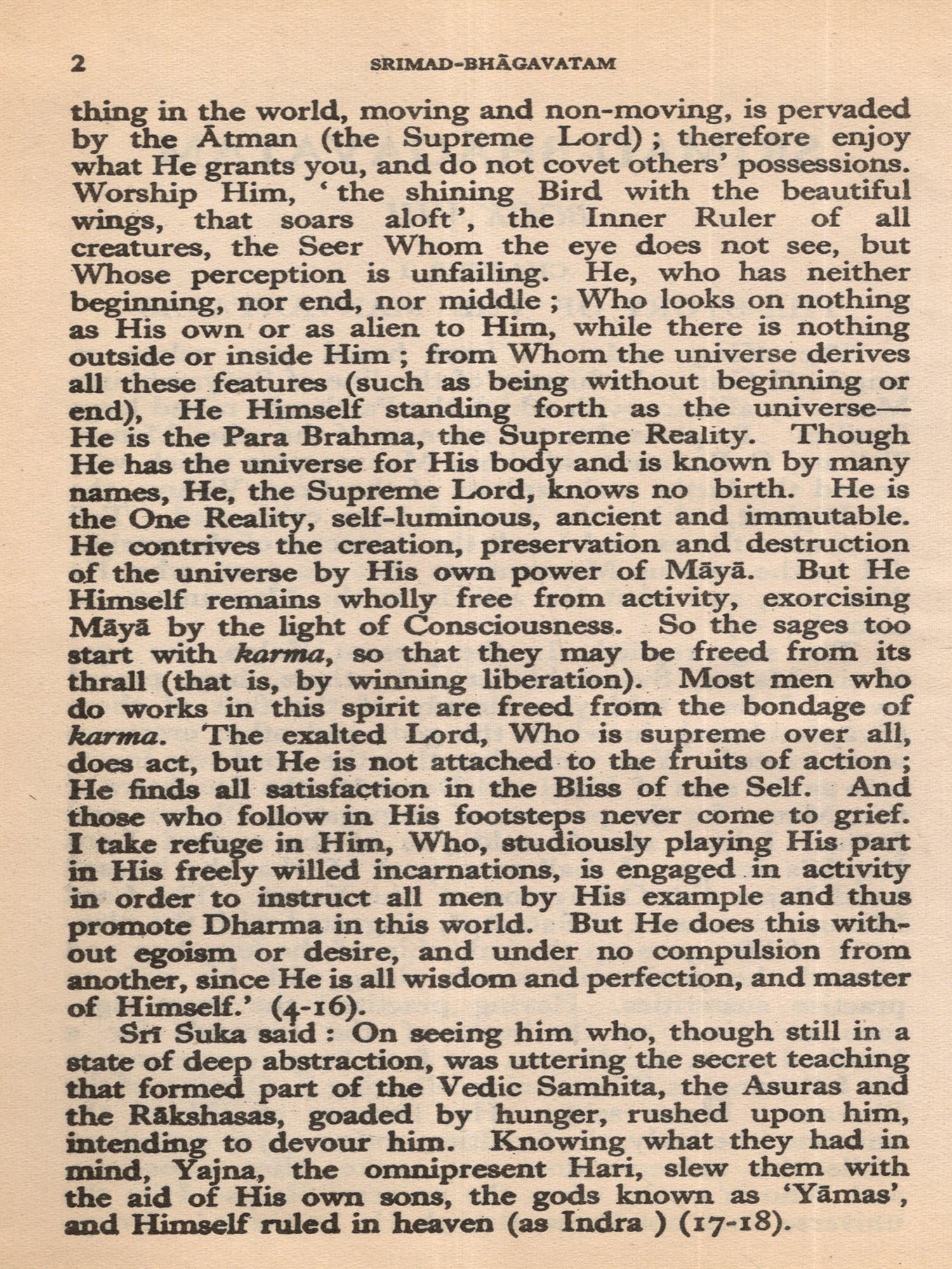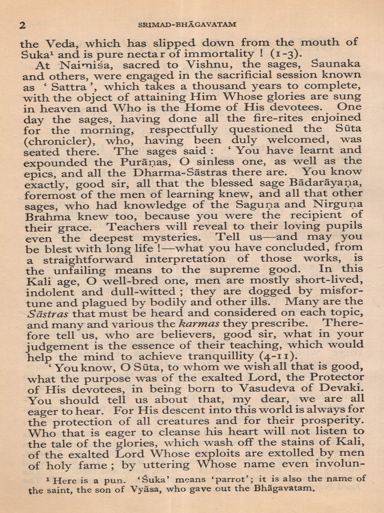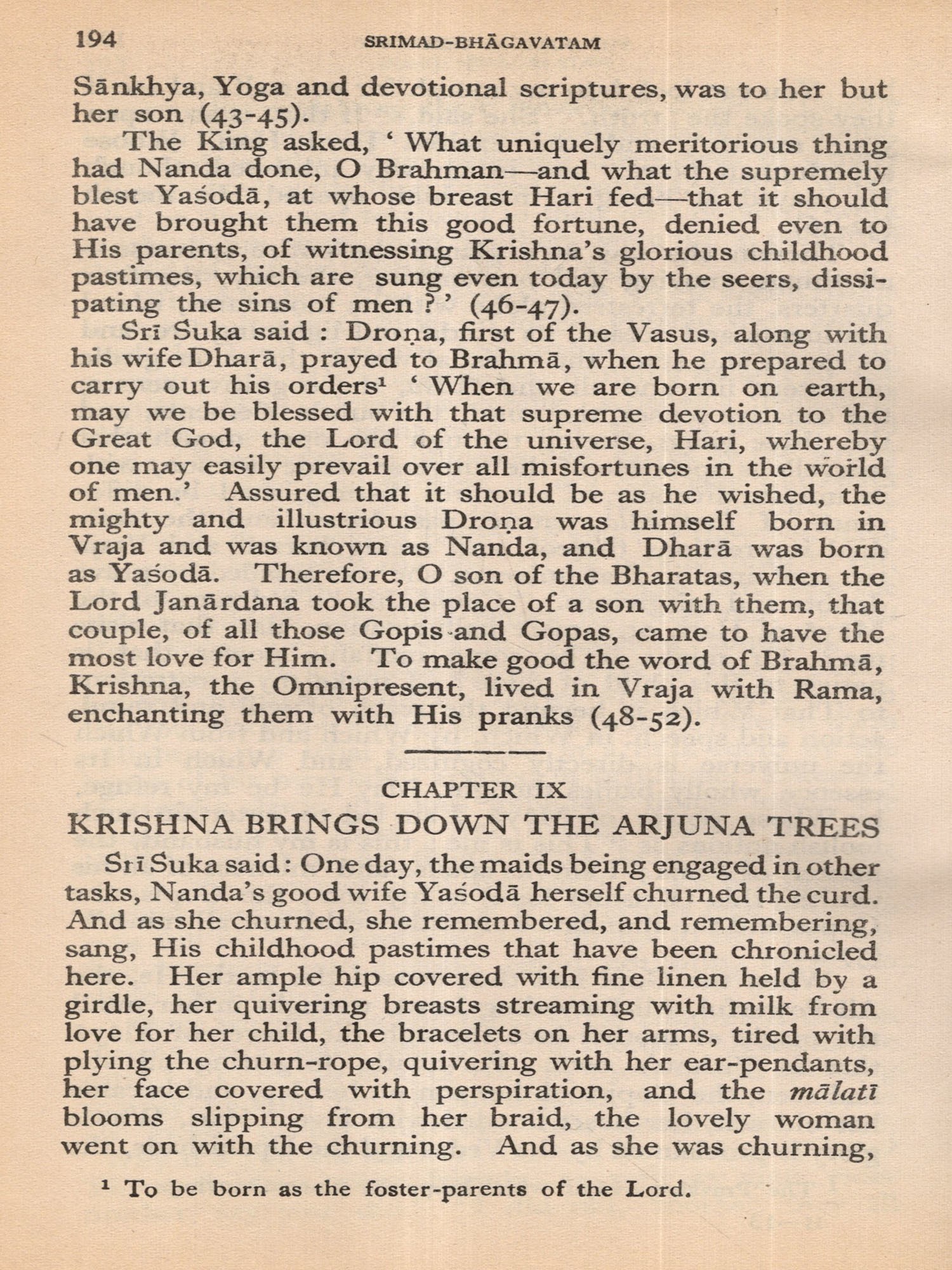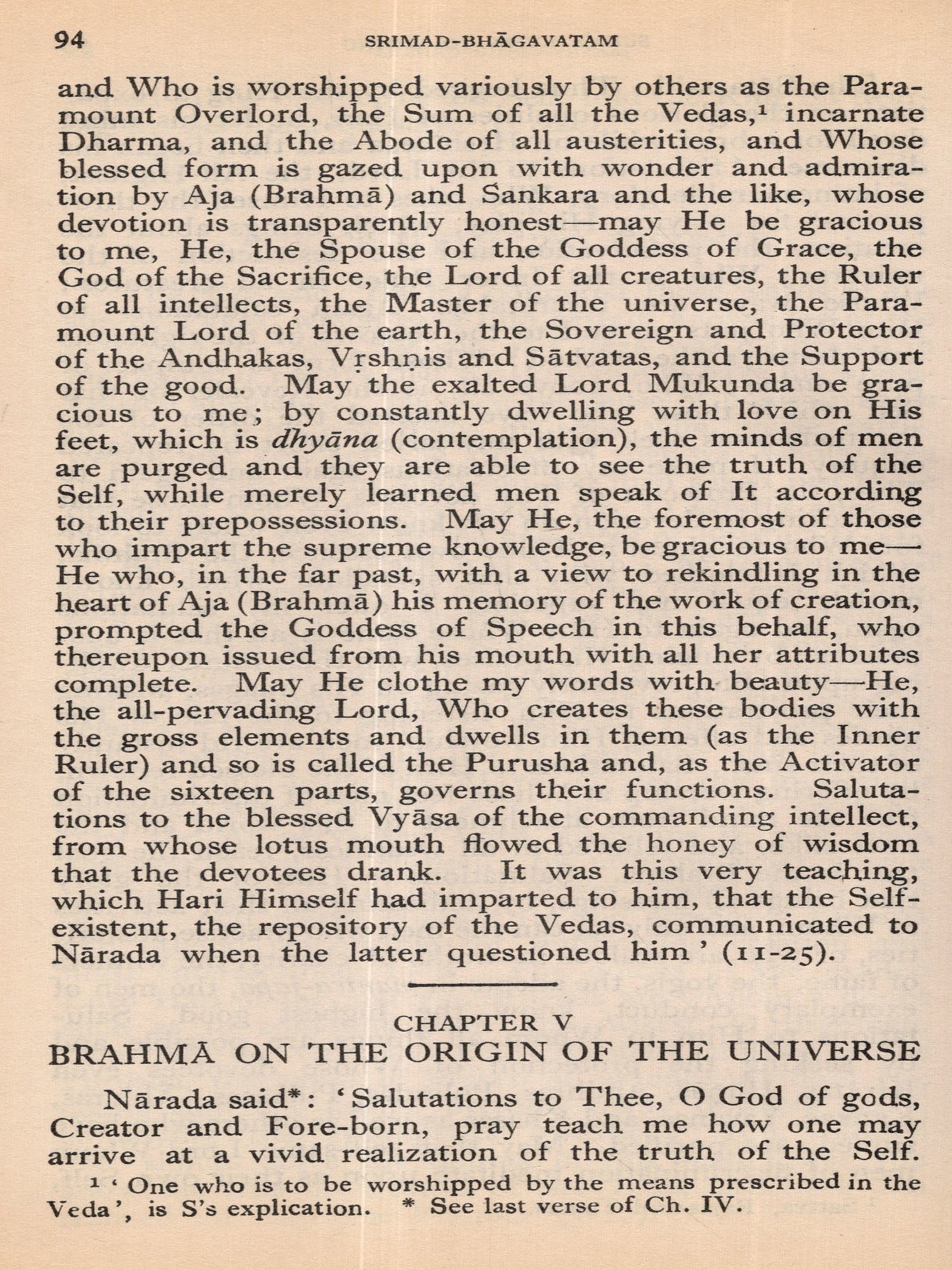 Much of the difficulty in interpreting the Bhagavatam is due to the unsettled state of the text. The Oriental Institute, Baroda, has undertaken the production of a critical edition, but it may take years before the project is completed. The present translation, based on a comparison of the texts relied upon by the principal commentaries, aims at providing an authentic rendering in euphonious, lucid prose. a version which shall be idiomatic, faithful and exact without being too literal (or word for word). The foot-notes, kept to a minimum, give important variant readings; and since the text is often elliptical, they also offer brief elucidations of important passages and suggest connecting links. With the text itself no liberty is taken. The supply within brackets of the more familiar for the less familiar name of a god or hero should be of help to the non-Sanskritist. The Bhagavatam is almost unique in the number of commentaries and dissertations it has inspired down the ages (see. p. 654, infra). No translator can afford to neglect them. Almost every commentary attempts the elucidation of the text in the light of a particular school of philosophy. While this translation has tried to follow the plain meaning of the text uninfluenced by the bias of any particular commentator, it endeavours, where it has to follow one particular interpretation as being the most plausible, to give in summary in the Notes at the end the interpretations of others. But in this respect these Notes do not claim to be either comprehensive or exhaustive. The Notes have also been utilized to give brief summaries of the extensive additions to the text that are found, notably in the Madhva version, and to indicate the rather fewer omissions from what may, for convenience, be termed the Vulgate, that used by Sridharaswamin. The synopsis provided for Vol. I (Vol. II hardly needs one), the select subject index, the glossary of Samskrit words (which are kept at a minimum in the text and printed with a minimum number of diacritical marks) and the brief notes on important characters and events, should help the reader to find his way through the labyrinth of Puranic mythology, and the difficulties caused by the sea-saw technique of narration and the employment of more than one narrator. The translation aims to serve the generalreader, without neglecting the needs of the student. The unique popularity of the Bhagavatam is due to the fact that the mysticism of loving devotion, which goes back to the Veda, finds its consummation in the extraordinarily vivid portrayal of the Divine Personality of Sri Krishna, the Spirit of Delight, the Ananda of the Upanishads. It is hoped that the translation may succeed in communicating to the reader something of its haunting beauty and compelling charm.