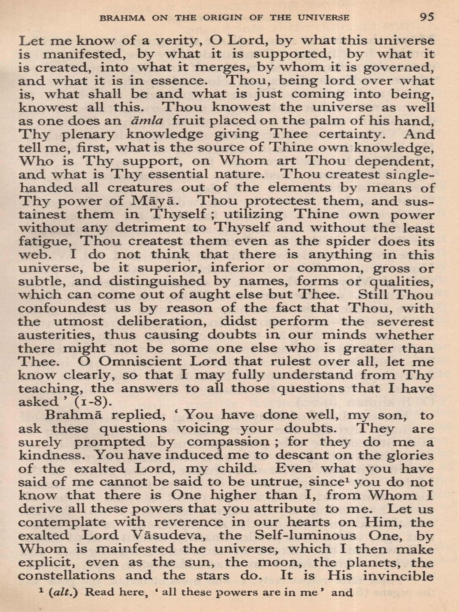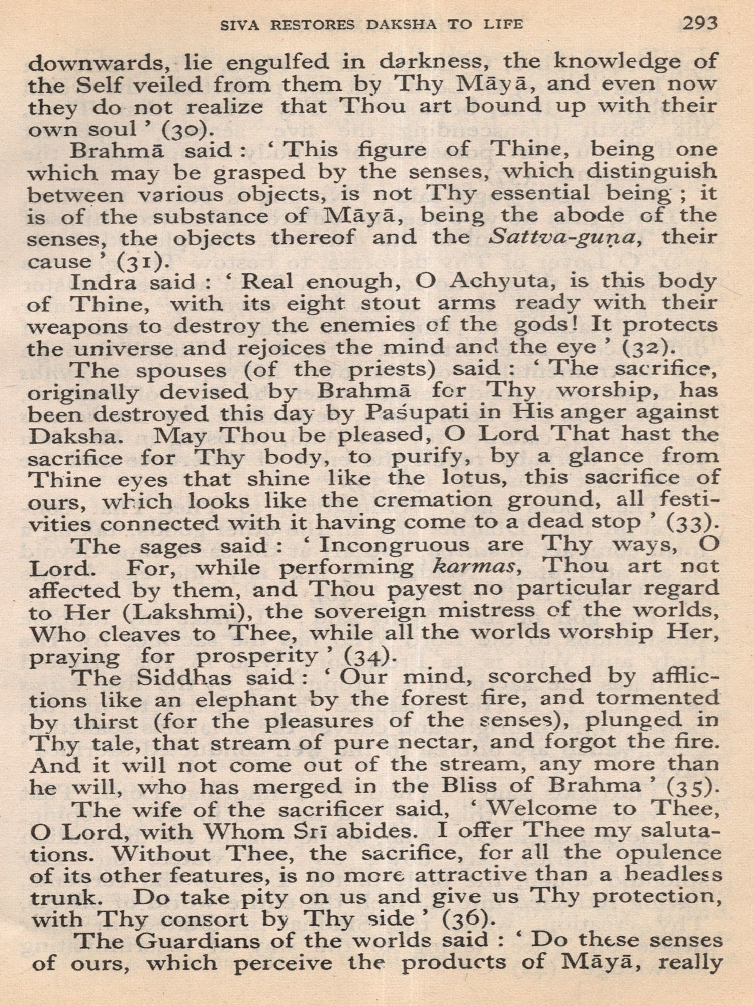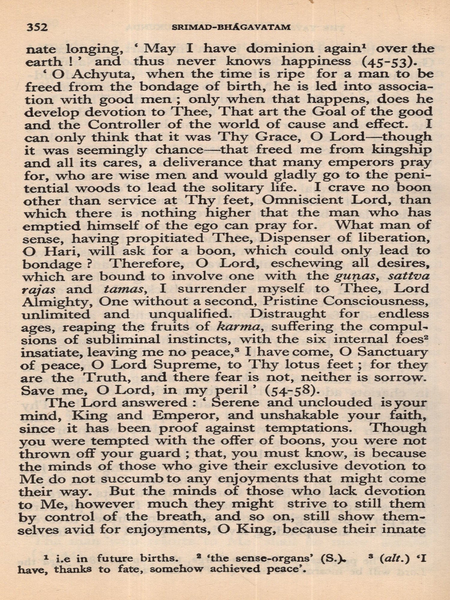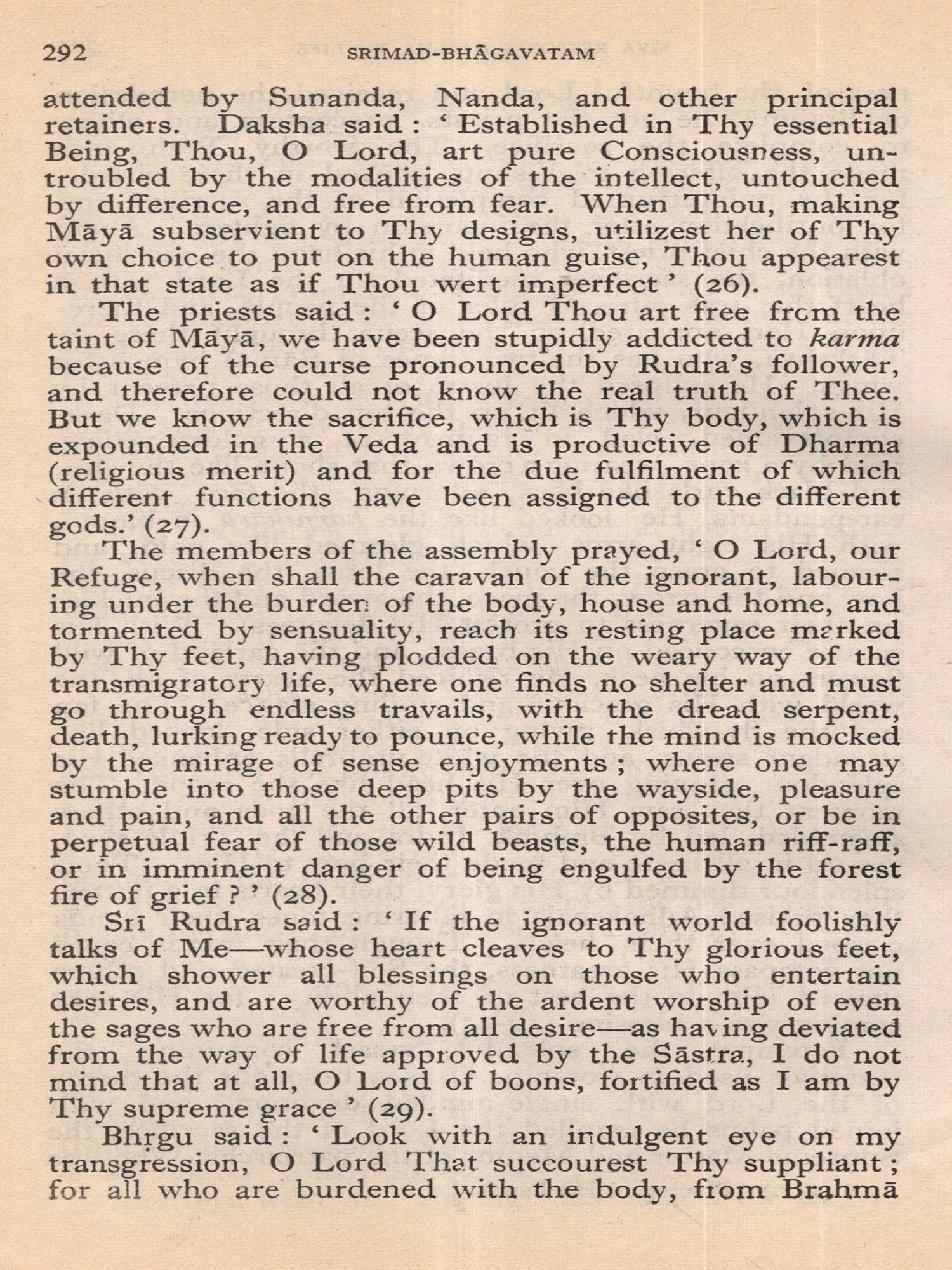 Much of the difficulty in interpreting the Bhagavatam is due to the unsettled state of the text. The Oriental Institute, Baroda, has undertaken the production of a critical edition, but it may take years before the project is completed. The present translation, based on a comparison of the texts relied upon by the principal commentaries, aims at providing an authentic rendering in euphonious, lucid prose. a version which shall be idiomatic, faithful and exact without being too literal (or word for word). The foot-notes, kept to a minimum, give important variant readings; and since the text is often elliptical, they also offer brief elucidations of important passages and suggest connecting links. With the text itself no liberty is taken. The supply within brackets of the more familiar for the less familiar name of a god or hero should be of help to the non-Sanskritist. The Bhagavatam is almost unique in the number of commentaries and dissertations it has inspired down the ages (see. p. 654, infra). No translator can afford to neglect them. Almost every commentary attempts the elucidation of the text in the light of a particular school of philosophy. While this translation has tried to follow the plain meaning of the text uninfluenced by the bias of any particular commentator, it endeavours, where it has to follow one particular interpretation as being the most plausible, to give in summary in the Notes at the end the interpretations of others. But in this respect these Notes do not claim to be either comprehensive or exhaustive. The Notes have also been utilized to give brief summaries of the extensive additions to the text that are found, notably in the Madhva version, and to indicate the rather fewer omissions from what may, for convenience, be termed the Vulgate, that used by Sridharaswamin. The synopsis provided for Vol. I (Vol. II hardly needs one), the select subject index, the glossary of Samskrit words (which are kept at a minimum in the text and printed with a minimum number of diacritical marks) and the brief notes on important characters and events, should help the reader to find his way through the labyrinth of Puranic mythology, and the difficulties caused by the sea-saw technique of narration and the employment of more than one narrator. The translation aims to serve the generalreader, without neglecting the needs of the student. The unique popularity of the Bhagavatam is due to the fact that the mysticism of loving devotion, which goes back to the Veda, finds its consummation in the extraordinarily vivid portrayal of the Divine Personality of Sri Krishna, the Spirit of Delight, the Ananda of the Upanishads. It is hoped that the translation may succeed in communicating to the reader something of its haunting beauty and compelling charm.
