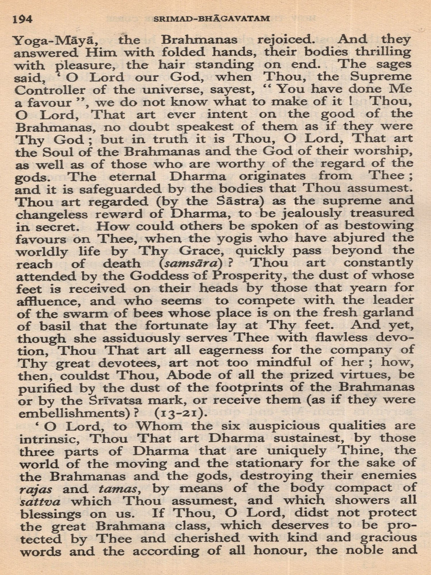 Srimad Bhagavatam enjoys universal popularity as the Bhakti scripture par excellence. It has inspired the growth of extensive devotional literature not only in Samskrit but also in many other Indian languages; and it is revered by important religious movements like those connected with the names of Chaitanya Mahaprabhu and Sri Vallabhacharya as one of the corner-stones of their faith. Though it has been translated into practically every Indian language, European scholars, with the notable exception of the French scholar Burnouf, who translated parts of it over a hundred years ago, have not turned their attention to it. Prof. Juan Roger Reviere, Prof. of Indology in the University of Madrid, writes in Purana, The Puranas are forgotten and neglected in European Indology', and complains that there is no adequate translation of the Bhagavatam.