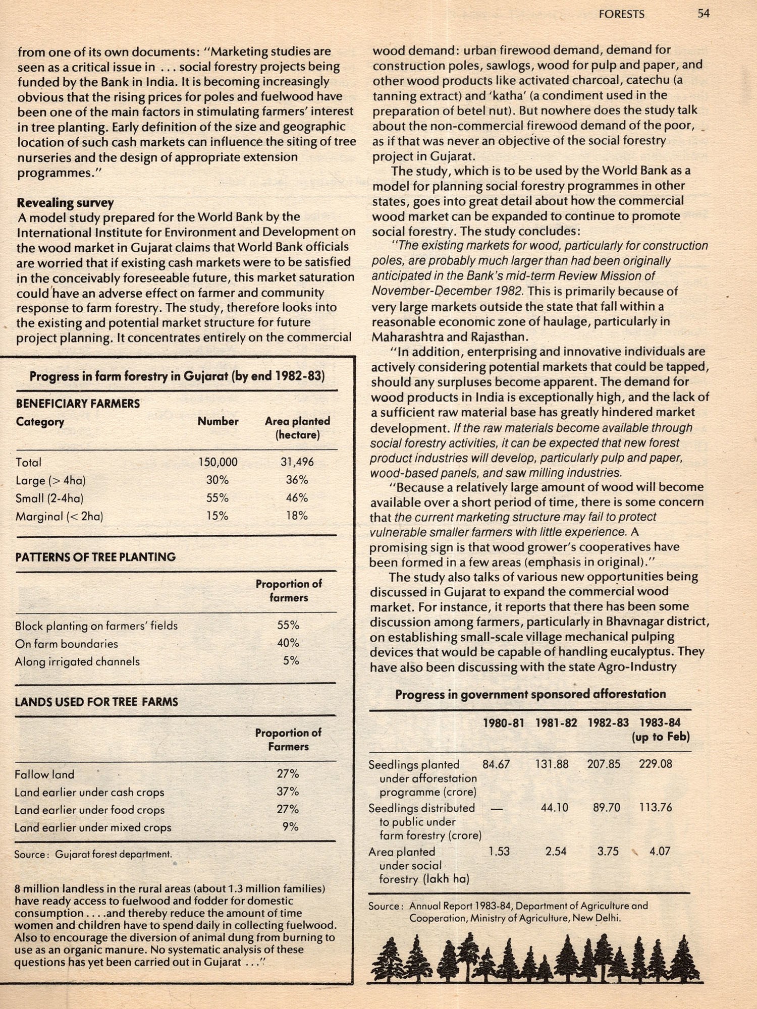Our first print run was 3500 and it was sold out in about a year. That is, at a rate of about ten copies per day, including Sundays. Since then we have sold over half of our second print run of 2500. Numerous people have helped us in making these sales, notably Kamla Chowdhry of the Society for Promotion of Wastelands Development, Bittu Sahgal of Sanctuary Magazine, Chandi Prasad Bhatt of Dasholi Gram Swaraj Mandal, Dilnavaz Variava of the Bombay Natural History Society (BNHS), Kartikeya Sarabhai of Viksat, Cyrus Guzder of the Save Bombay Committee, Vijay Paranjpye and Ravi Bhagwat of Parisar, and Shekhar Singh of the Indian Institute of Public Administration. Several hundred copies have been distributed by us free, especially to poor voluntary agencies based in rural areas. Agencies like World Wildlife Fund (India), Society for Promotion of Wastelands Development, Consortium on Rural Technology, UNICEF, Oxfam and Bread for the World purchased nearly a thousand copies for free distribution. This helped us to get the book free to a range of worthwhile voluntary organisations and women's groups in the country.