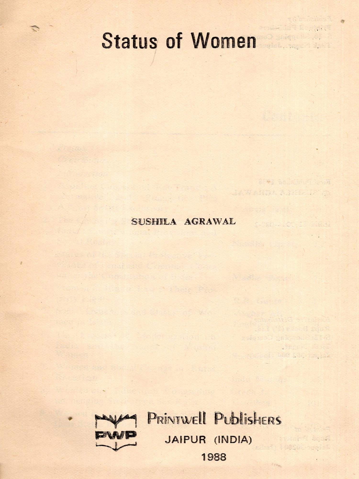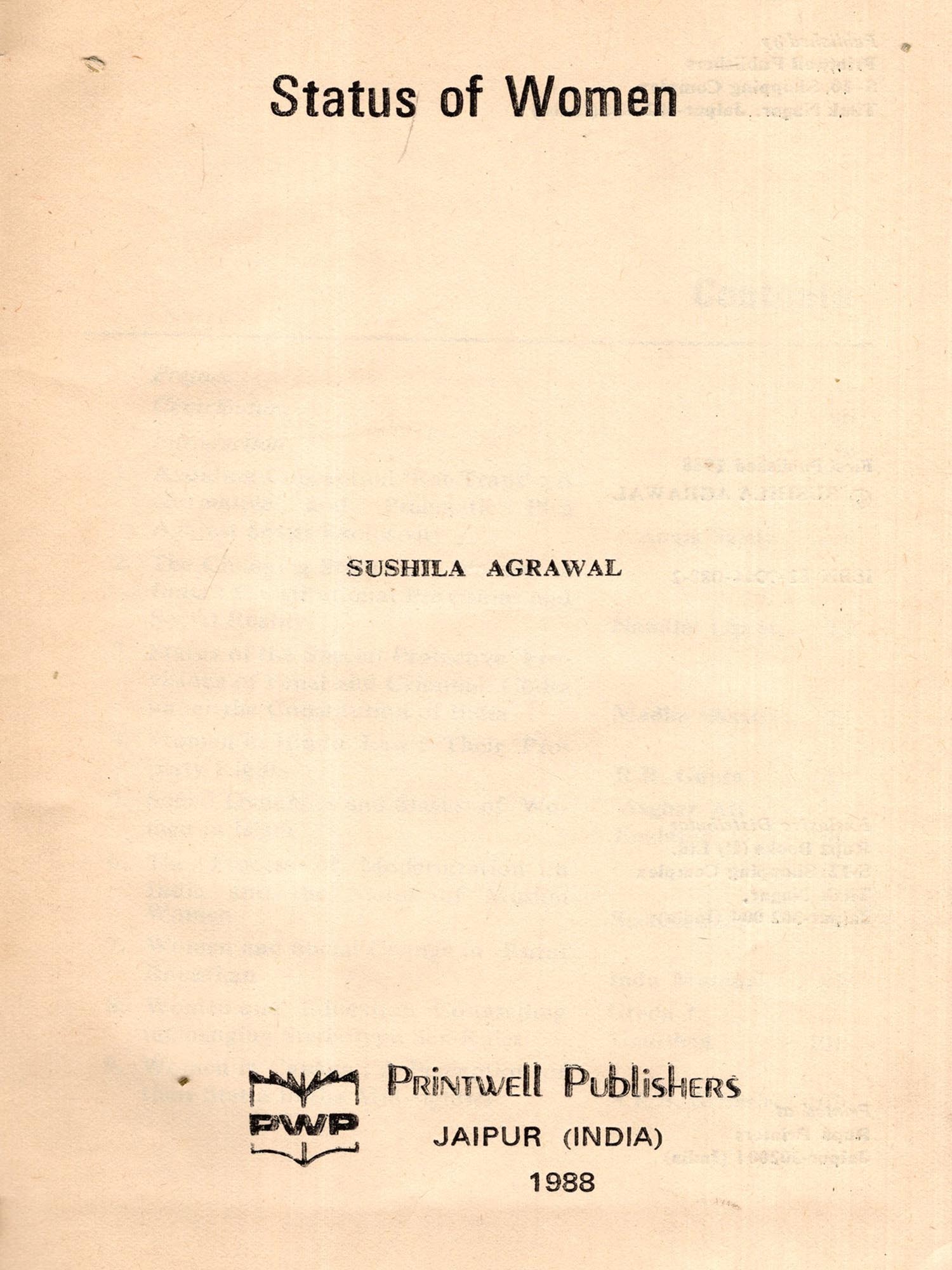 In this book, the changing status of women has been discuss-ed from various aspects. It deals with the conceptual frame-work, constitutional and legal provisions, socio-economic factors and educational aspects in changing scenario. The problems of the Hindu women as well as the Muslim women have been analysed, in order to understand a difference between the socio-legal position of the two inspite of similar constitutional and political rights. In the book, one chapter on the Canadian woman has been added in order to have comparative understanding of the status of Canadian and Indian women. Unless and until we have a comparative study of the women of different cultures, it is not possible to understand their problems. We find, most of the problems of Canadian and Indian women are similar inspite of cultural differences. The women in both the countries do not enjoy equality with men..