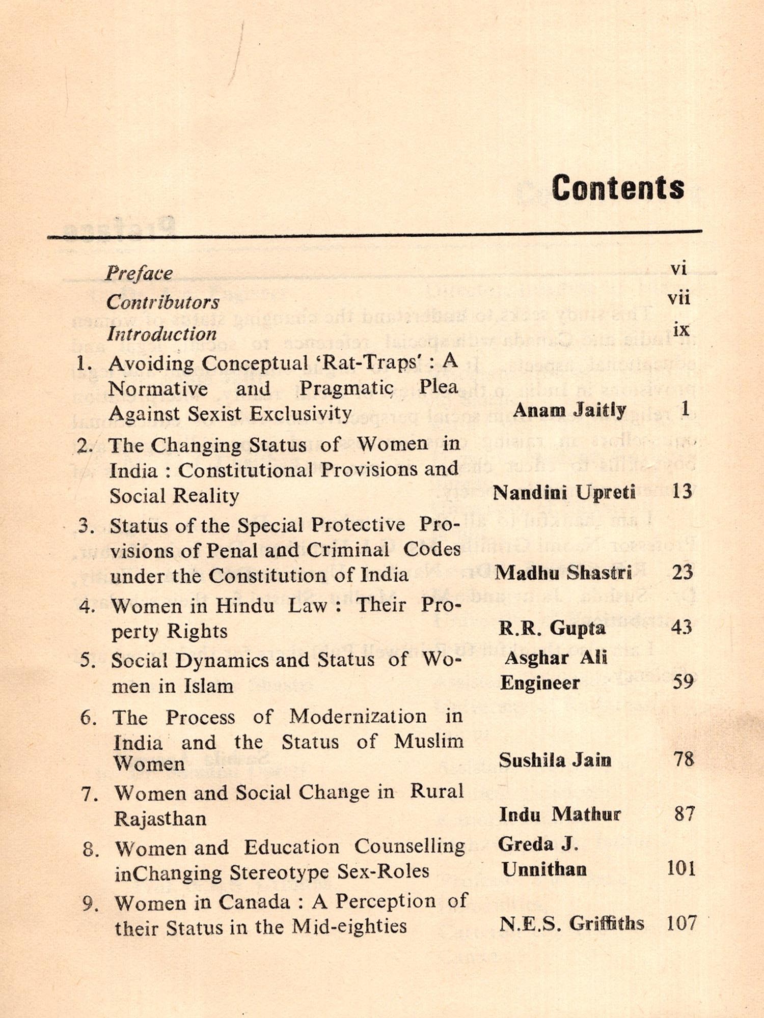I am thankful to all the contributors, Dr. A.A. Engineer, Professor Naomi Griffiths, Ms. G.J. Unnithan, Dr. Indu Mathur, Dr. R.R. Gupta, Dr. Nandini Upreti, Dr. Anam Jaitly, Dr. Sushila Jain and Ms. Madhu Shastri for their scholarly contributions.