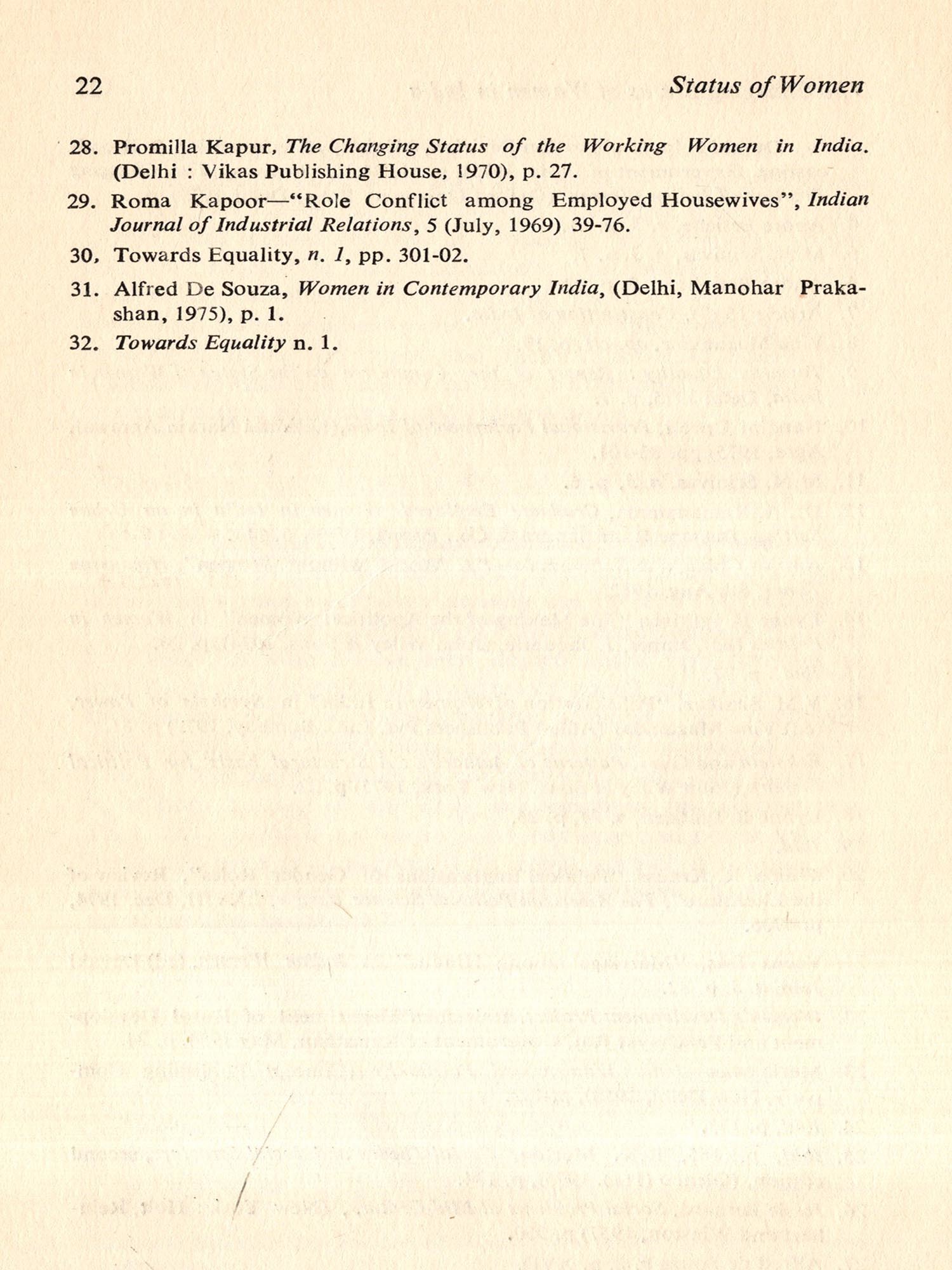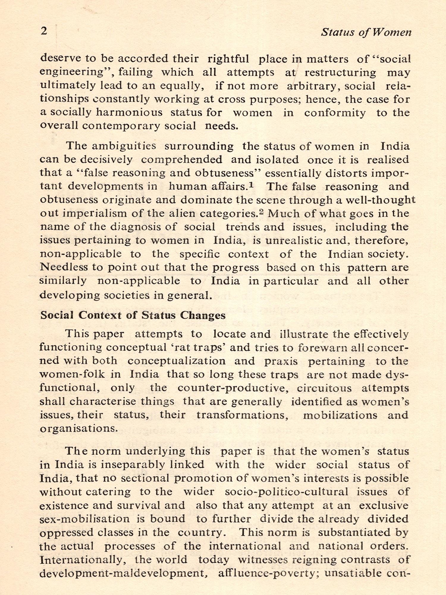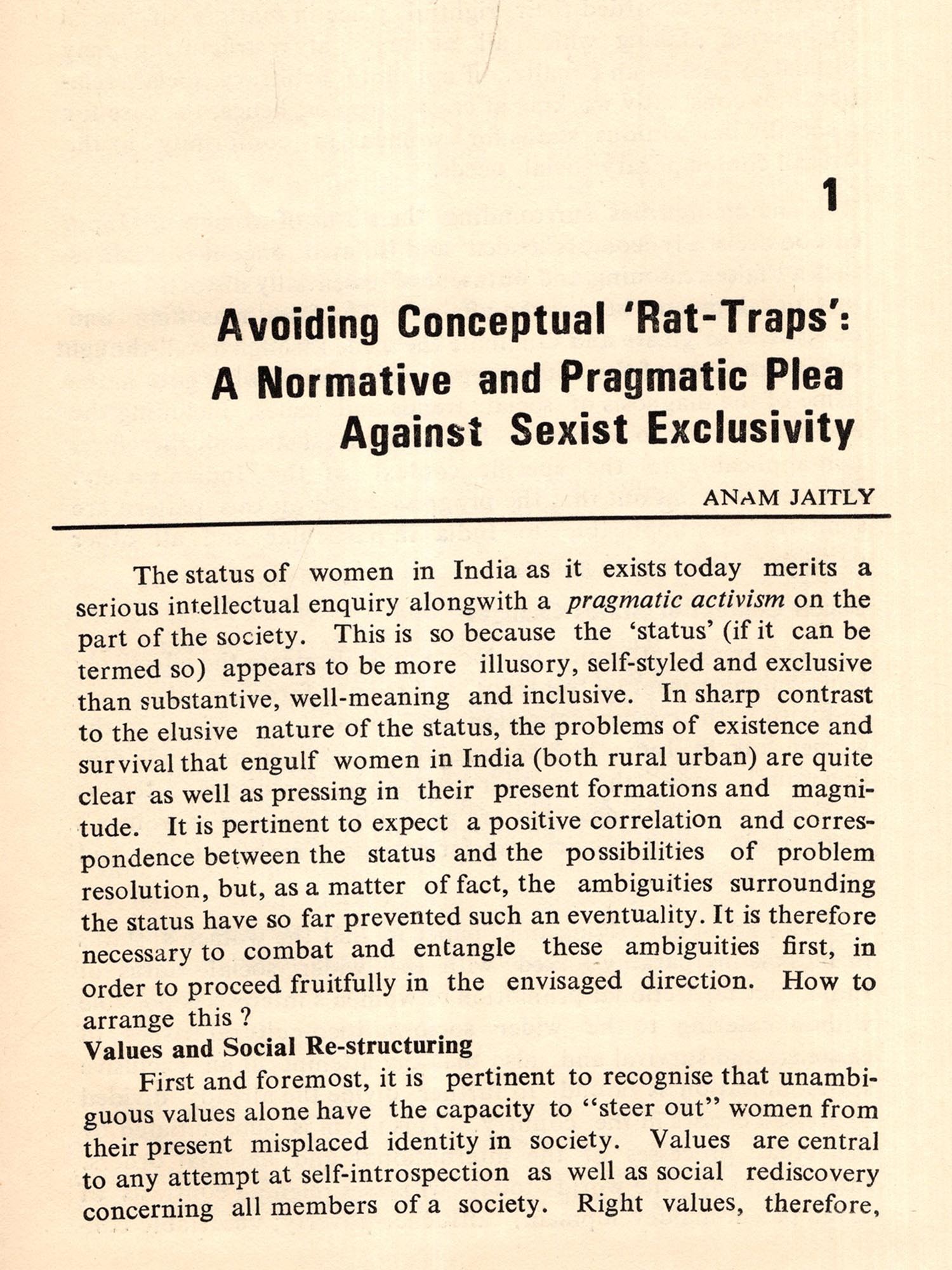Dr. Anam Jaitly in "Avoiding Conceptual 'Rat Traps': A Normative Exercise Towards an Enduring Status for Women in India" views the status of women against the background of international order and national scene. He says, "Internationally, the world today witnesses reigning contrasts of development-maldevelopment, affluence-poverty, unsatiable consumerism abject hunger and malnutrition. The national scene likewise depicts. the fact of progress and achievement on the one hand and the face of poverty and bare survival on the other... Thus the twin realities of international and nationol orders clearly bring out the central place of injustice, oppression and dominance in human affairs, which does not distinguish between male and female. Therefore, he thinks "every issue is a woman's issue". And "the woman's status in India is inseparably linked with the wider social status of India, that no sectional promotion of women's interests is possible without catering to the wider sociopolitics cultural issues of existence and survival...." But Dr. Jaitly does not realise that in every class, in all the levels of oppression women are more oppressed than men-there is greater injustice against women and women's sufferings are more than men's. In the end, however, Dr. Jaitly accepts equal power sharing and resource sharing between men and women and gives some concrete policy proposal which are worth consideration.