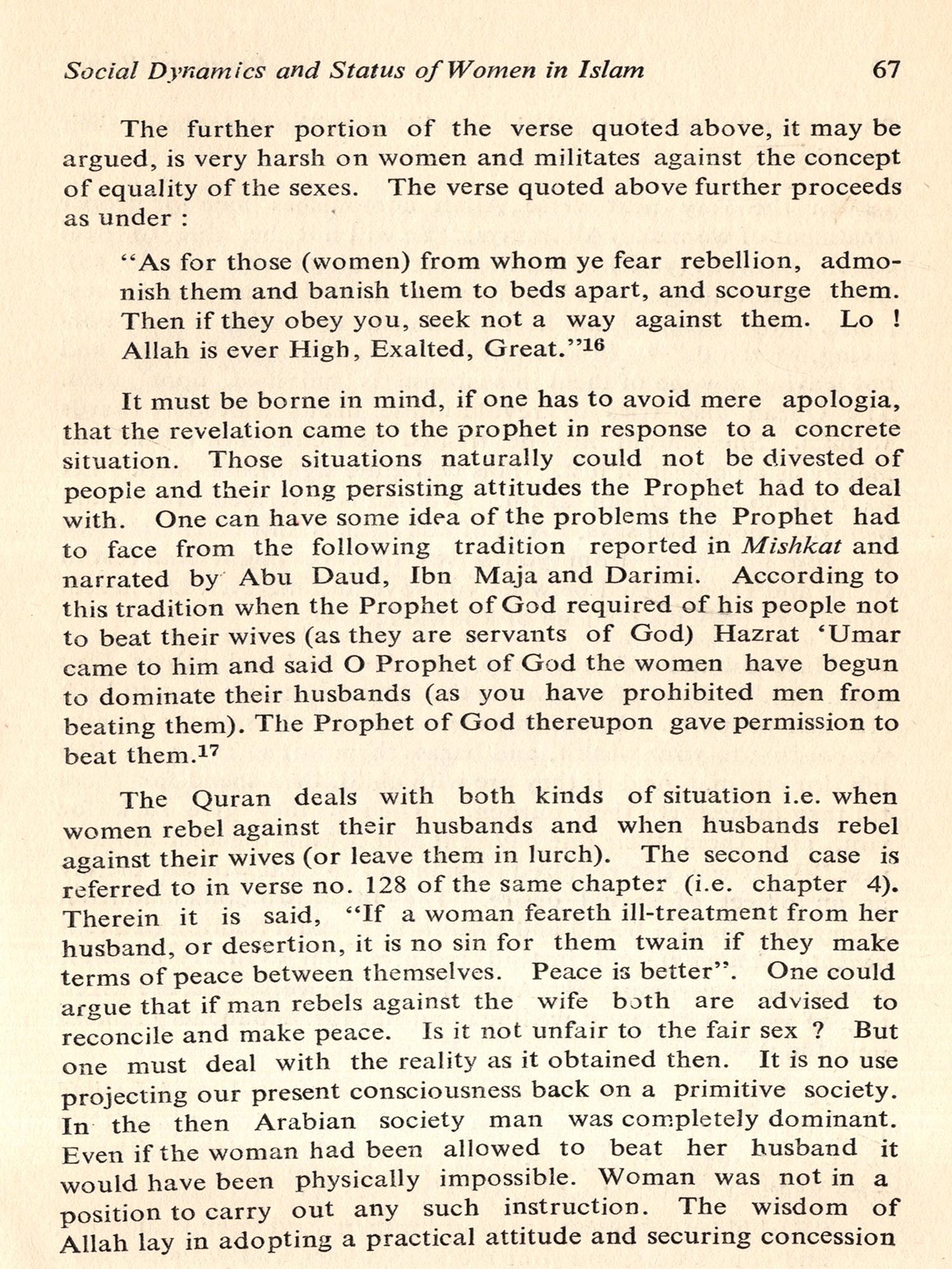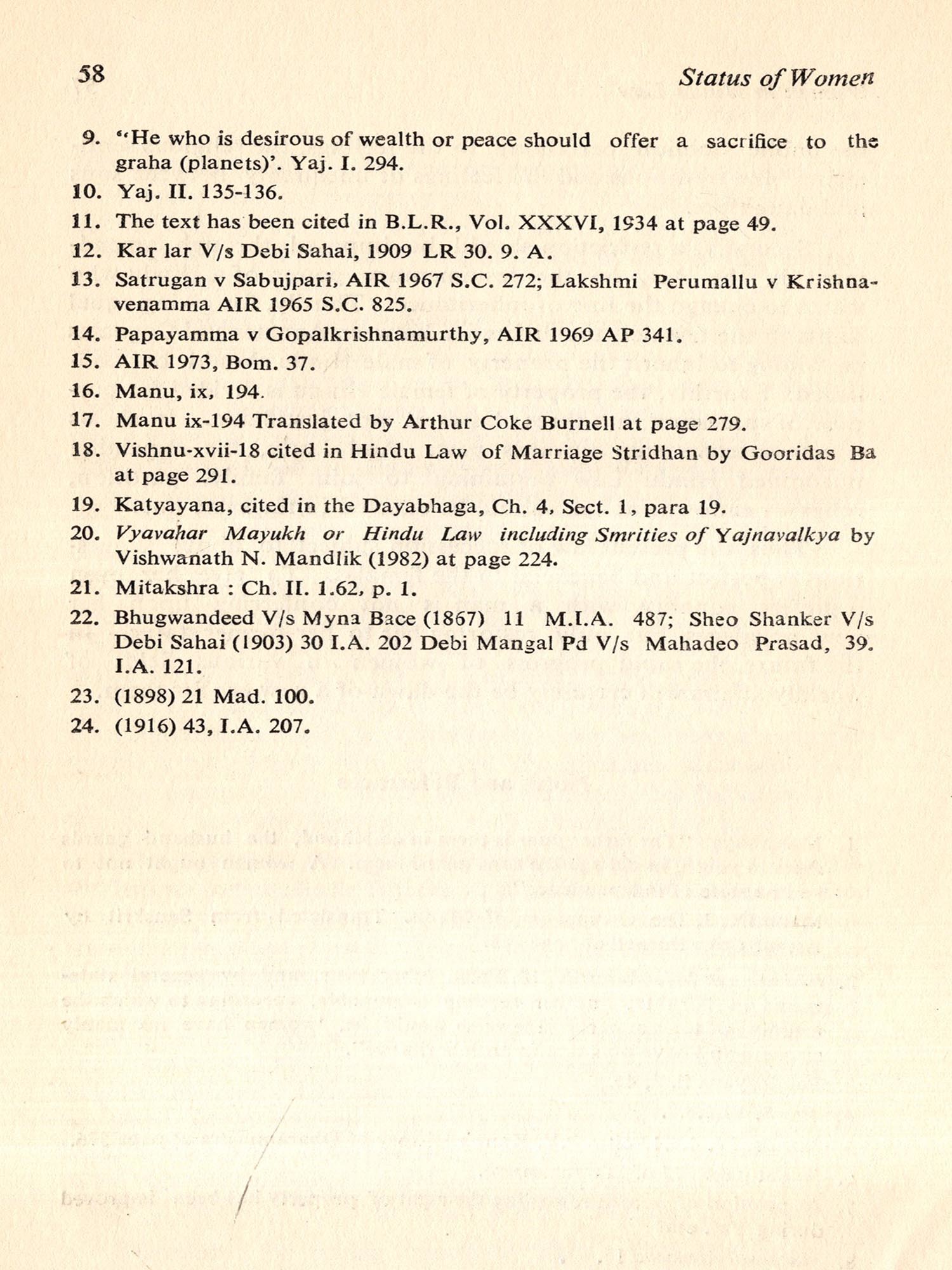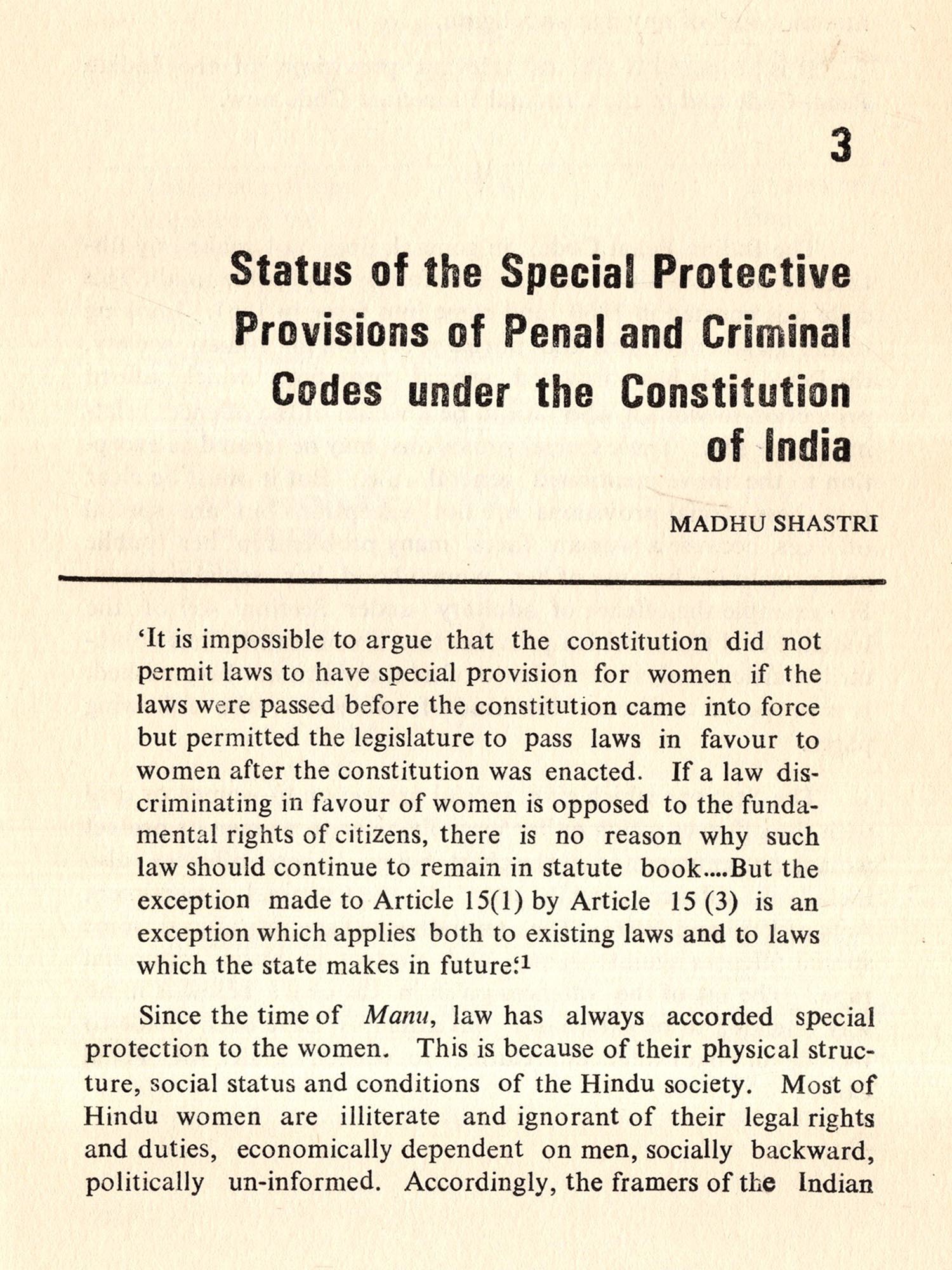 Dr. Anam Jaitly in "Avoiding Conceptual 'Rat Traps': A Normative Exercise Towards an Enduring Status for Women in India" views the status of women against the background of international order and national scene. He says, "Internationally, the world today witnesses reigning contrasts of development-maldevelopment, affluence-poverty, unsatiable consumerism abject hunger and malnutrition. The national scene likewise depicts. the fact of progress and achievement on the one hand and the face of poverty and bare survival on the other... Thus the twin realities of international and nationol orders clearly bring out the central place of injustice, oppression and dominance in human affairs, which does not distinguish between male and female. Therefore, he thinks "every issue is a woman's issue". And "the woman's status in India is inseparably linked with the wider social status of India, that no sectional promotion of women's interests is possible without catering to the wider sociopolitics cultural issues of existence and survival...." But Dr. Jaitly does not realise that in every class, in all the levels of oppression women are more oppressed than men-there is greater injustice against women and women's sufferings are more than men's. In the end, however, Dr. Jaitly accepts equal power sharing and resource sharing between men and women and gives some concrete policy proposal which are worth consideration.
