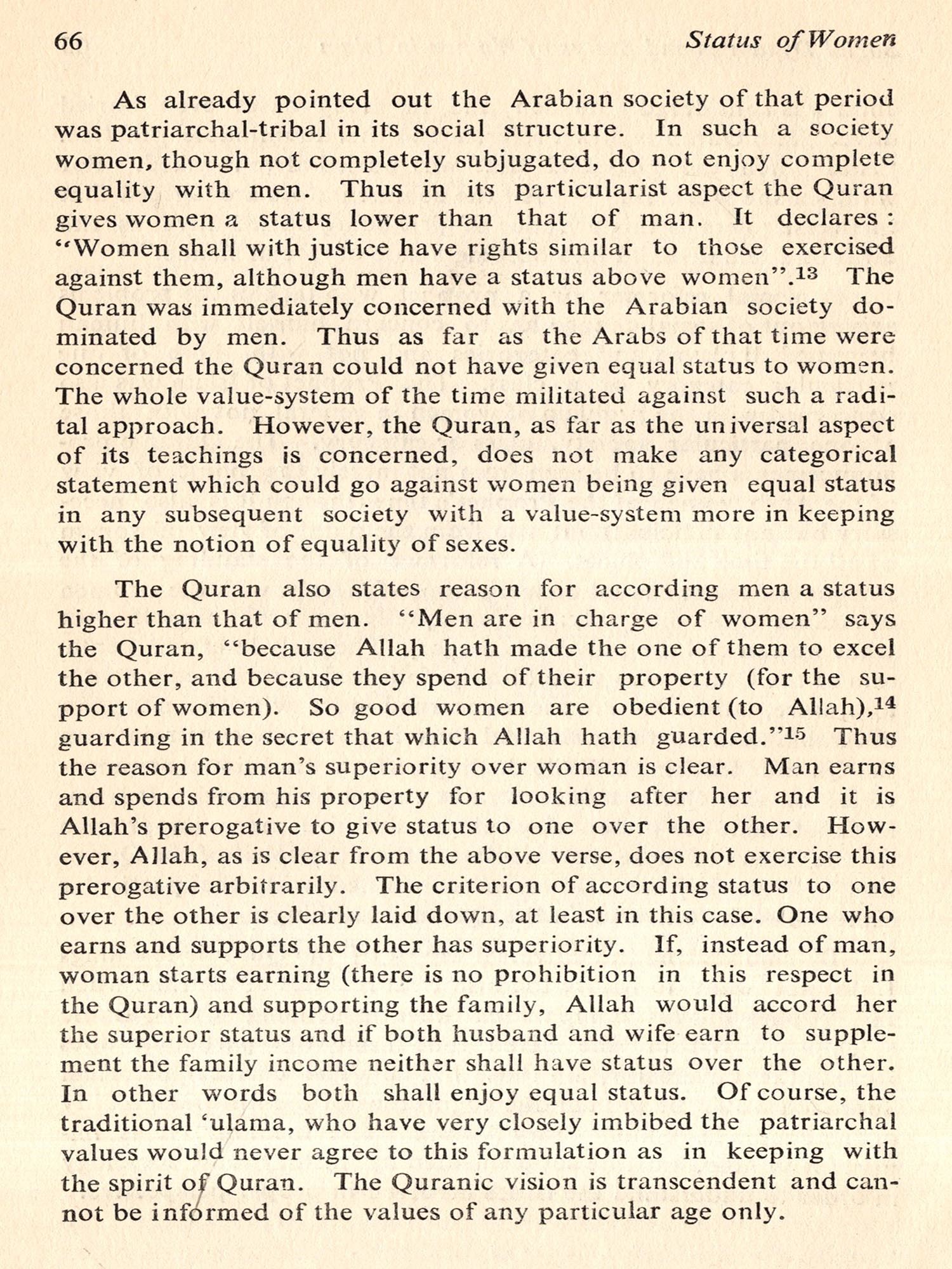 The problem of the status of women involves equality between men and women. The women, throughout the world have been considered the second sex-the inferior sex. Equality and status are closely associated with power. Changing status involves the sharing of power on equal footing with men in decision making and its implementation at informal and formal sector. The societal value frame work plays an important role in determining the changing status of power equations, and, hence, the status of women involves the distribution and redistribution of power.