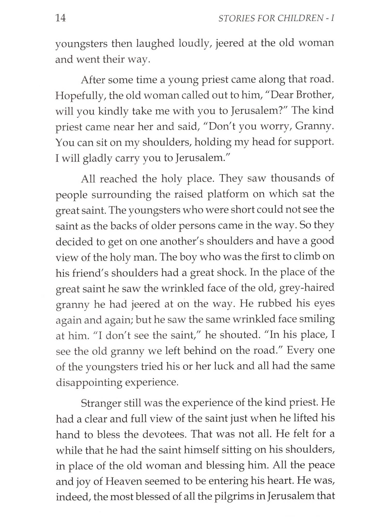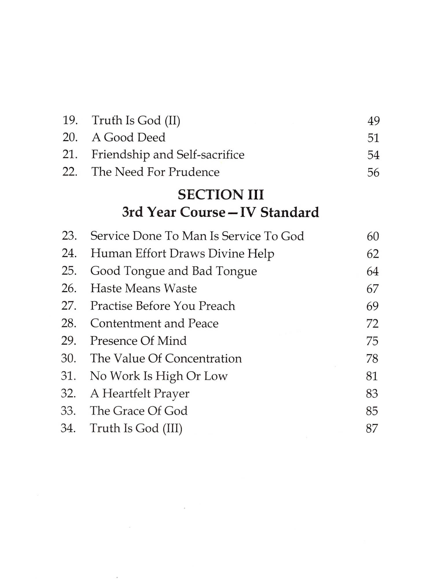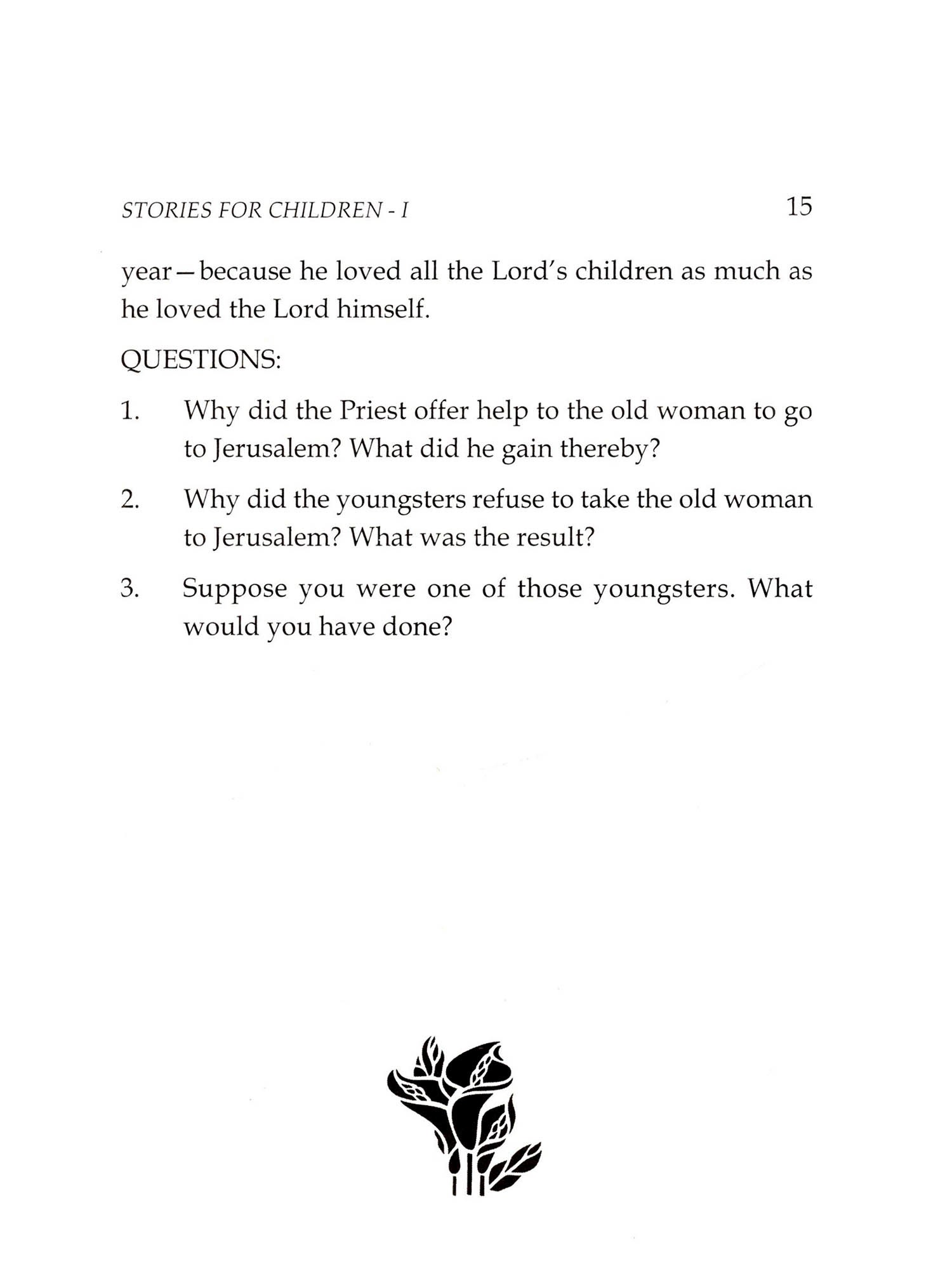 Stories for Children - I is a handbook for children to inculcate values in their life. Incidents illustrating lofty values from the lives of Abraham Lincoln, Rajendra Prasad, the first President of India, Saint Ramana Maharishi, Shivaji, Michael Faraday, Mahatma Gandhi, etc will help children to emulate the morals in their lives. There are three ways or processes of conceptualisation and they have to be made according to the context in order to enable children to absorb the lessons contained in these stories vividly: Dramatisation (Role Play), Picturisation (Sense Perception) and Verbalisation. Teachers can themselves be a participant in the role play and while picturising a story, the teacher should get the assistance of an artist, if necessary. These inspiring stories are categorised as stories which are easy to understand and the ones which are difficult to understand. The stories in the book are grouped in the order of difficulty and graded for three years of study (II, III and IV Standards) accordingly.