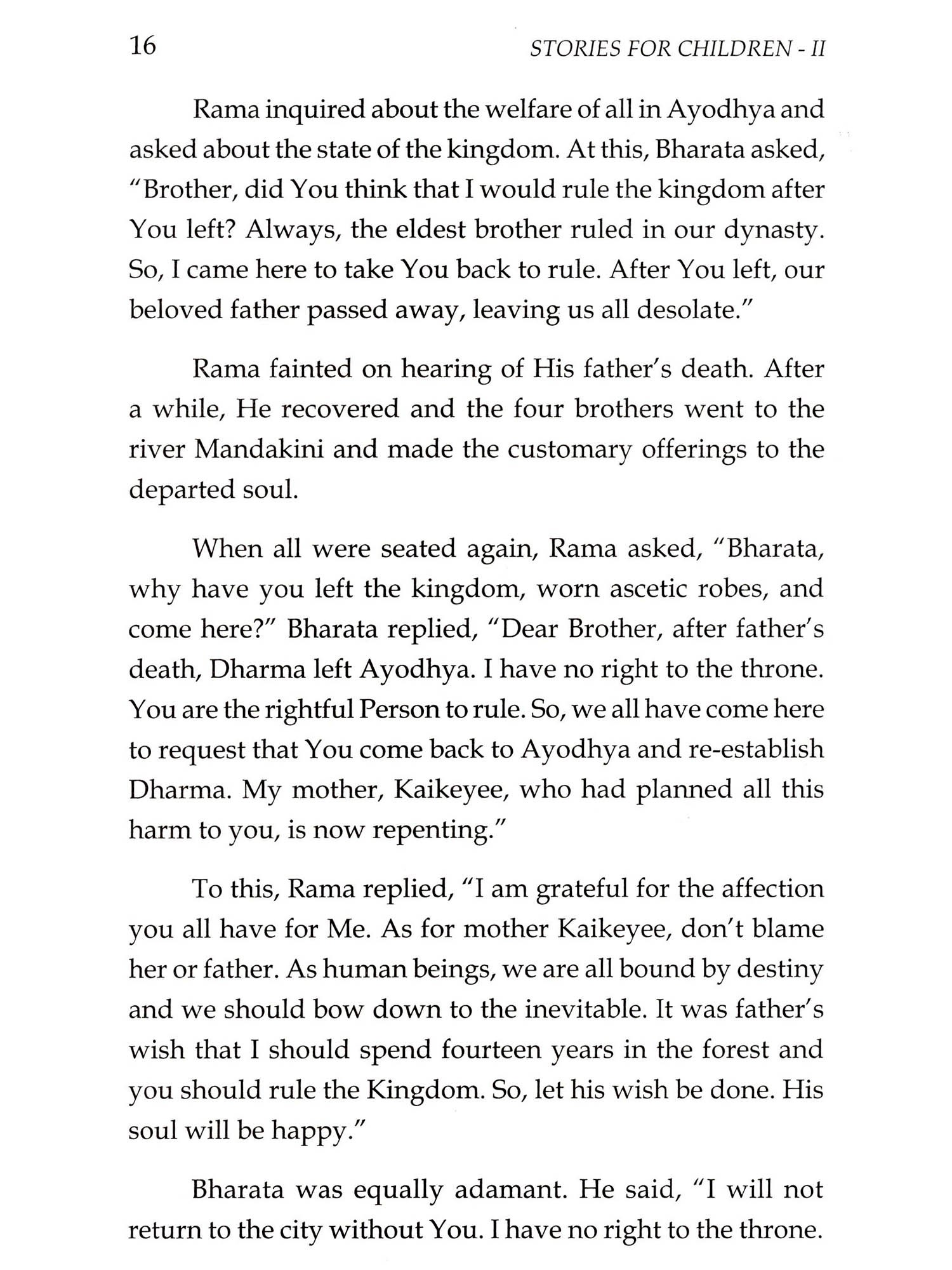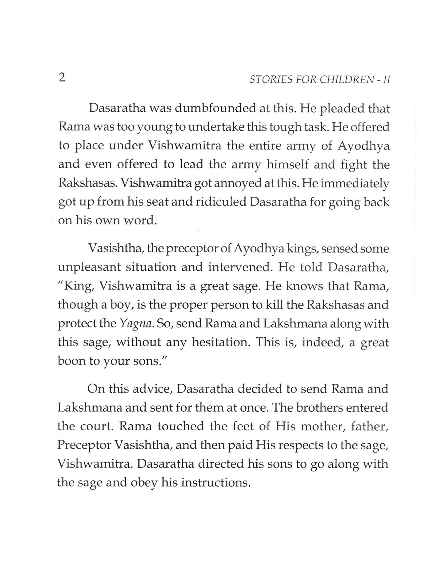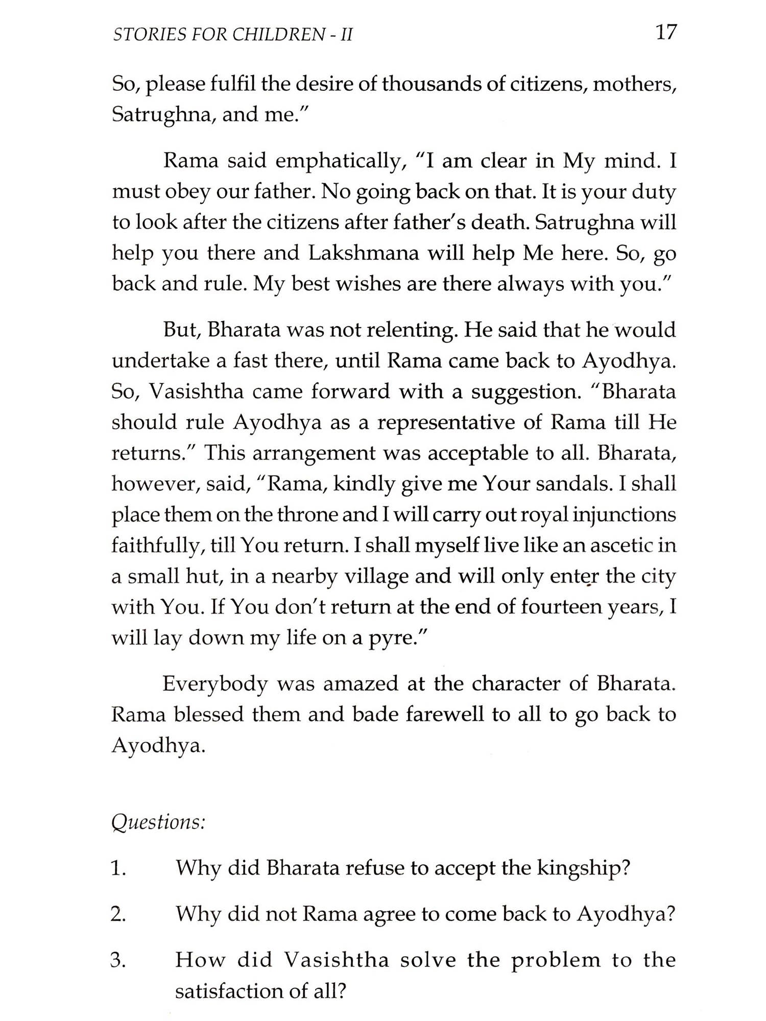 Bhagawan Sri Sathya Sai Baba has taken up on Himself, as part of His divine mission, the nurturing and grooming of the youngones to bring about a moral revolution that can ensure a peaceful world. Children are the future nation-builders and when their hearts are soaked in human values and the culture of the land, peace and order in the world are bound to happen. Towards achieving this end He has graciously started the Bal Vikas for fostering of the human values even as they grew in their own faith and culture. His divine discourses invariably abound in parables and stories drawn from the epics and the life history of great men and saints who valued the cardinal human values as their very life breath. This book namely, Stories for Children Part II, is primarily meant for the age group of 9 to 12 years. It contains stories from the Ramayana and the Mahabharatha, besides others based on human values, and stories told by Jesus Christ. There is also an introduction giving guidance to Bal Vikas Gurus.