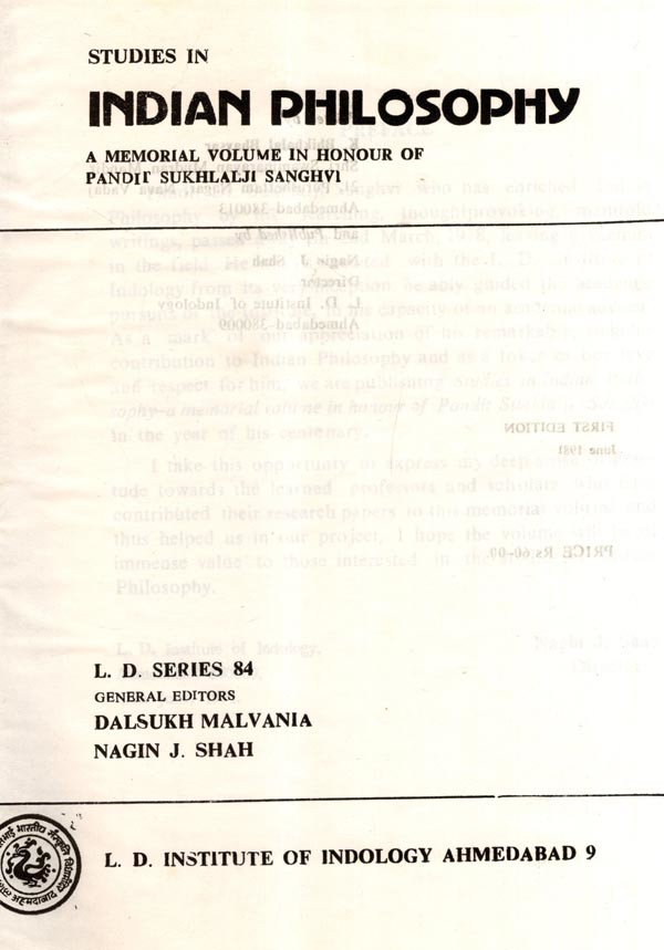 Pandit Dr. Sukhlalji Sanghvi who has enriched Indian Philosophy by his searching, thought-provoking, manifold writings, passed away on 2nd March, 1978, leaving a vacuum in the field. He was associated with the L. D. Institute of Indology from i's very inception; he ably guided the academic pursuits of the Institute, in his capacity of an academic adviser. As a mark of our appreciation of his remarkable, singular contribution to Indian Philosophy and as a token of our love and respect for him, we are publishing Studies in Indian Philo sophy-a memorial volume in honour of Pandit Sukhlalji Sanghvi in the year of his centenary.