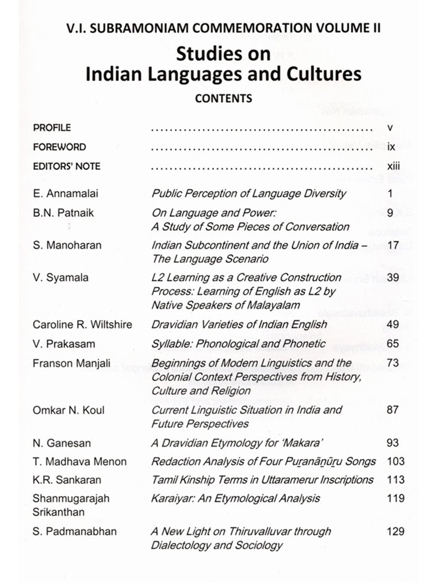 It is with great pride and pleasure that we publish the V.I.S. Commemoration Volume I and volume II in honour of the late Prof. V.I. Subramoniam. The contributions of Prof. V.I. Subramoniam to Dravidian studies in general and to Dravidian linguistics in particular are invaluable. Being a versatile scholar and innovative researcher, he had a clear vision on the neglected areas of research in linguistics and interrelated disciplines such as cultural studies, folkloristics, anthropology etc.