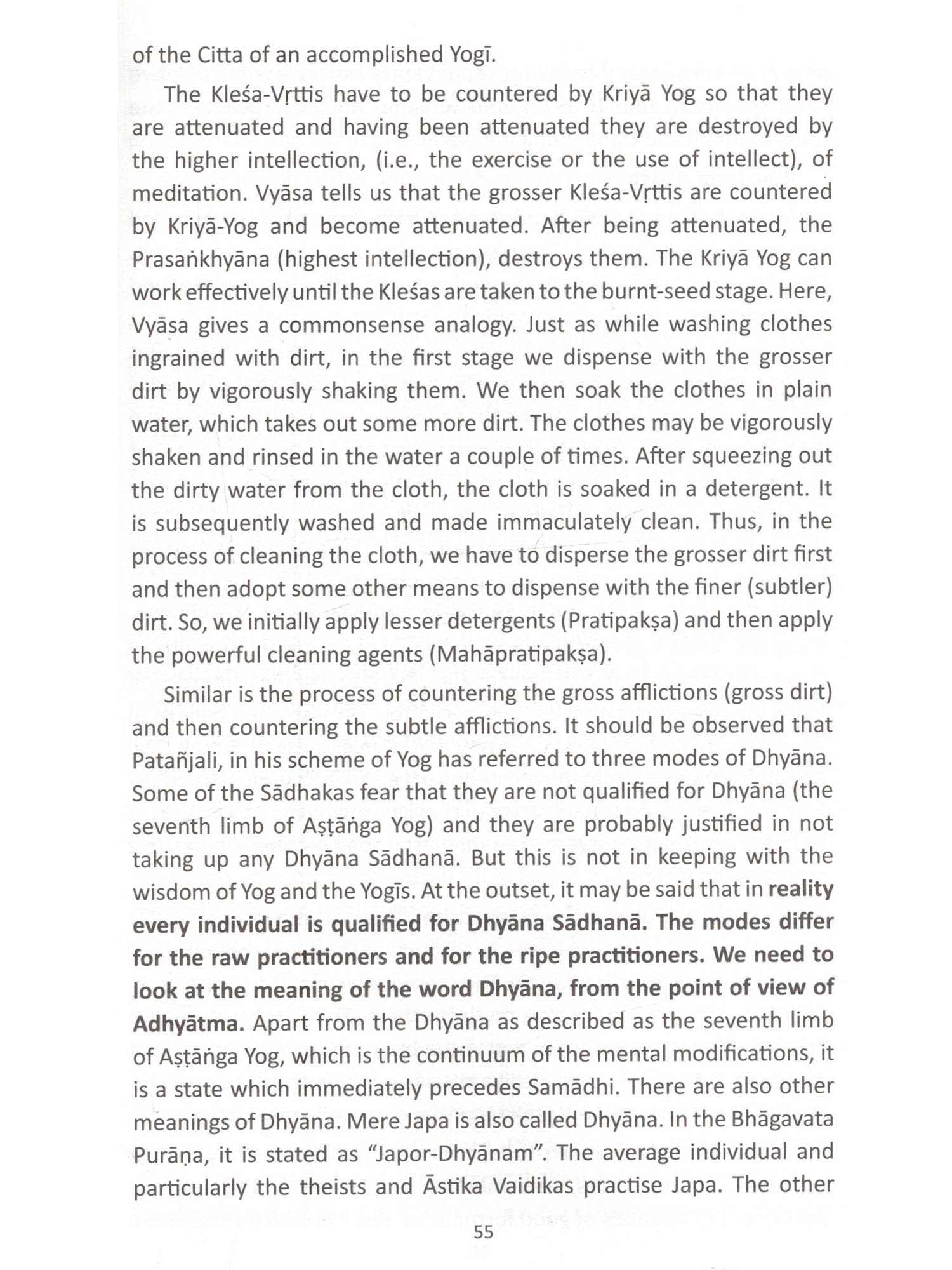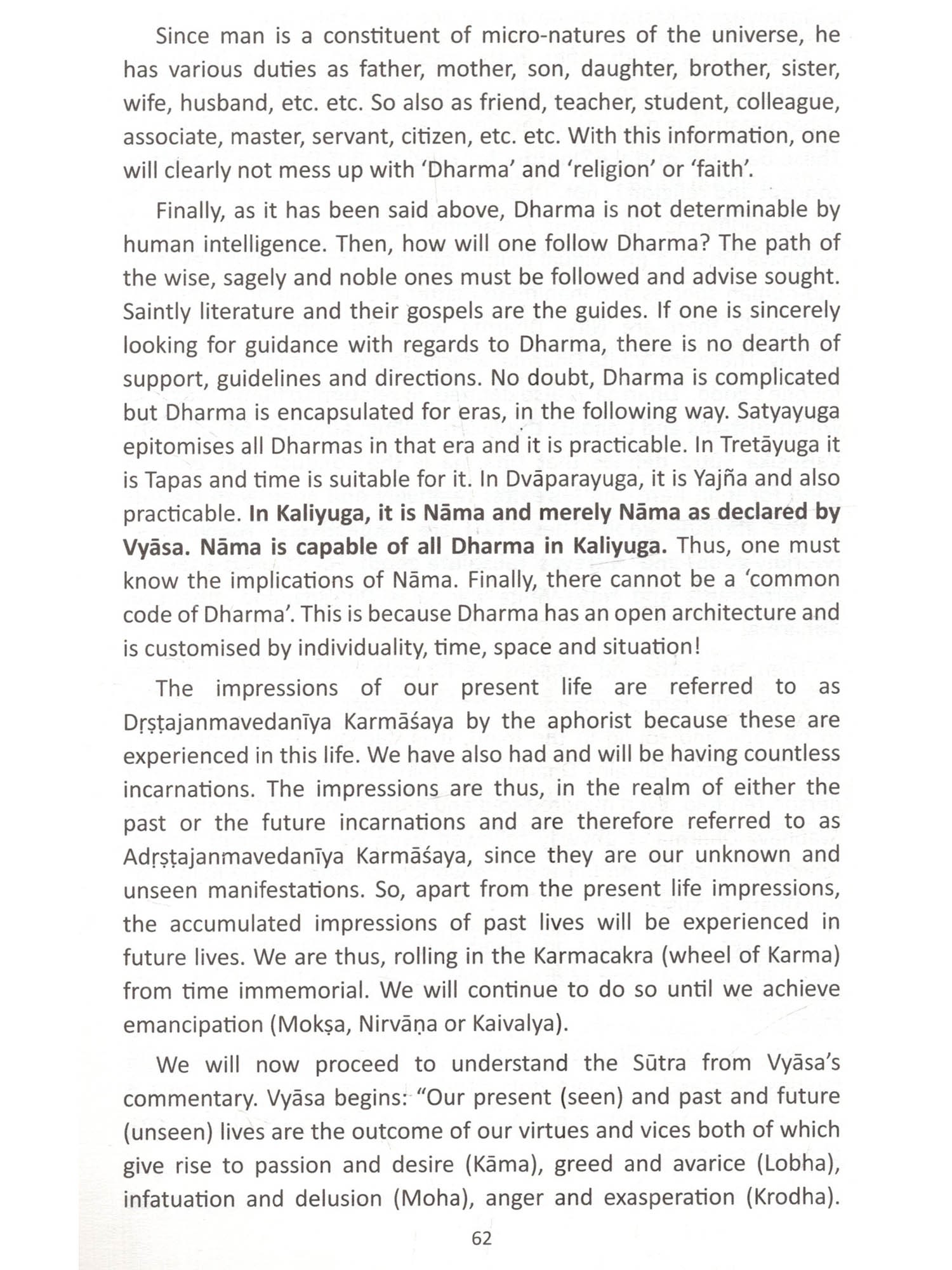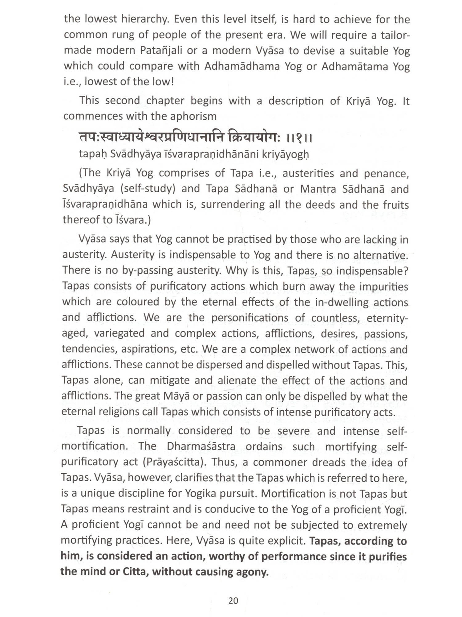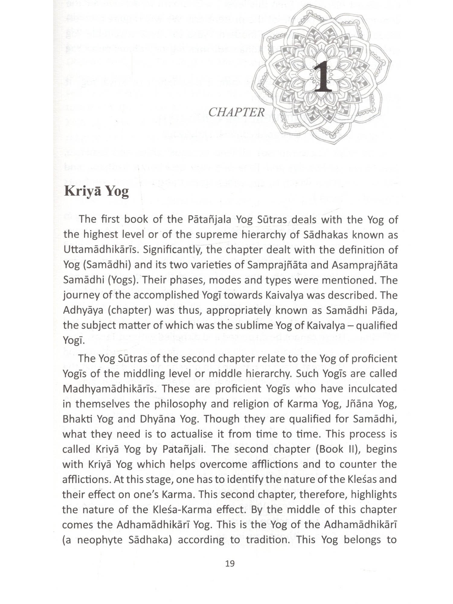 The first volume of the study of Yog Sütras consists of the first quarter of the Sütras titled Samadhi Päda. It began by defining Yog and then went on to mentioning quintessential Yog of accomplished Yogis, the Uttama-Adhikari, which is the class of supremely qualified Yogis. Thus, for the Yog seeker there was a huge volume of basic, fundamental and foundational information, vital for learning Yog. The Samadhi Pada, therefore, is a mine of information for the seekers of Yog who are not of the level of the supremely qualified. There is hardly any instructional, tutorial or 'practise' matter in it. The Uttama-Adhikārīs do not need any such instructional material since they belong to the accomplished and exclusive class of Yogis. The Samadhi Pada mentions how brimming Yog actualises in such Yogis by way of Samādhis. Samādhis are of two kinds viz., Samprajñāta and Asamprajñāta Samādhi. Then, the supreme class of Yogis gravitate towards the final spiritual summum bonum, which is Kaivalya or emancipation. For the keen spiritual seeker, who is well-disposed in Samskāras, there is a fascinating over-view or bird's-eye view of the Yogi's final journey to ultimate spiritual endeavour. There is a heart-touching view and information of essential Yog and the essence of Yog. The means of this Yog is codified as 'Abhyasa' (the effort to be-steady the Citta). For the Uttamādhikārī, whose Citta is rich and resourceful and brimming with Nirodha Samskāras and Vairagya, Abhyāsa is the means for Vairagya from all objects of the universe. Gunas are infra and supra-infra matter or source matters for all and Paraloka. These objects bewitch and bind one to the self and bewitching objects of this world and the worlds hereafter, ie, Thaloka strongly binds one to life after life and death after death! The Yogi here gets insulated from such gravities. Therefore, the Yogis dart in the 'no-gravity' liberation zone. But what are the means of Yog for the others? Thus Patanjali begins the second chapter to divulge the means which need to be acquired. The already-mentioned means of 'Abhyasa' and 'Vairagya' are opened and decoded. Hence the second volume is captioned "Precepts on means of Yog called Sadhana Päda". This should not be mistaken as Sädhanā Pāda. Sādhanā means practices. Here Sädhana stands for means or tools. Hence it should be very clear that the second chapter of Yog Sütras is about the means of Yog. Yog, because of its magnanimity can start anywhere. This is because it has an open architecture and a huge gateway. Yog has, fortunately a 'non-Yogika gate'. This can lead to Yog. Non-Yog does not antagonise Yog. Un-Yog would do that. Thus precaution should be taken we do not slip into unyogika practices. Yog has a magnanimous run-up with continuous allowances leading the way in a graduated manner. That is to say that one can commence Yog for health and physical culture and fitness or for remedials for the body. Thus Yog can be the means for such purposes. It can create relaxed and eased out psycho-sensory conditions. On the journey, at some stage, our practices should turn out and augment Abhyäsa and Vairagya potentials apart from the benefits of consumer packages. Thus the test for the seeker that the practices are on the right track. Sooner or later one must ideally adhere to classical and traditional approach than the current process of Āsana+Prāāyāma+meditation which has become fashionable in our times. The age-old process is broad-based and fit for the grand super structure of Yog. This needs to be understood and pursued.