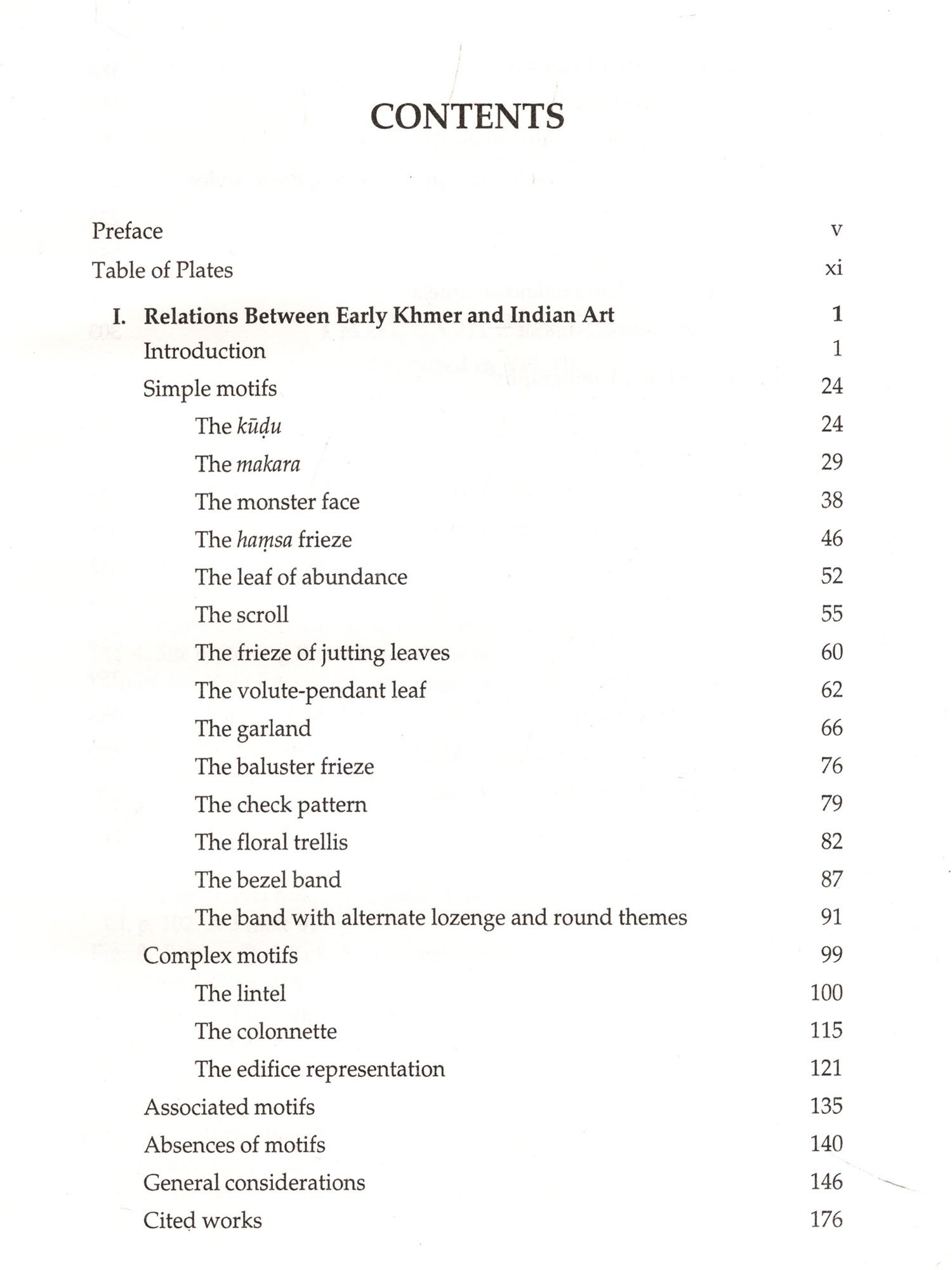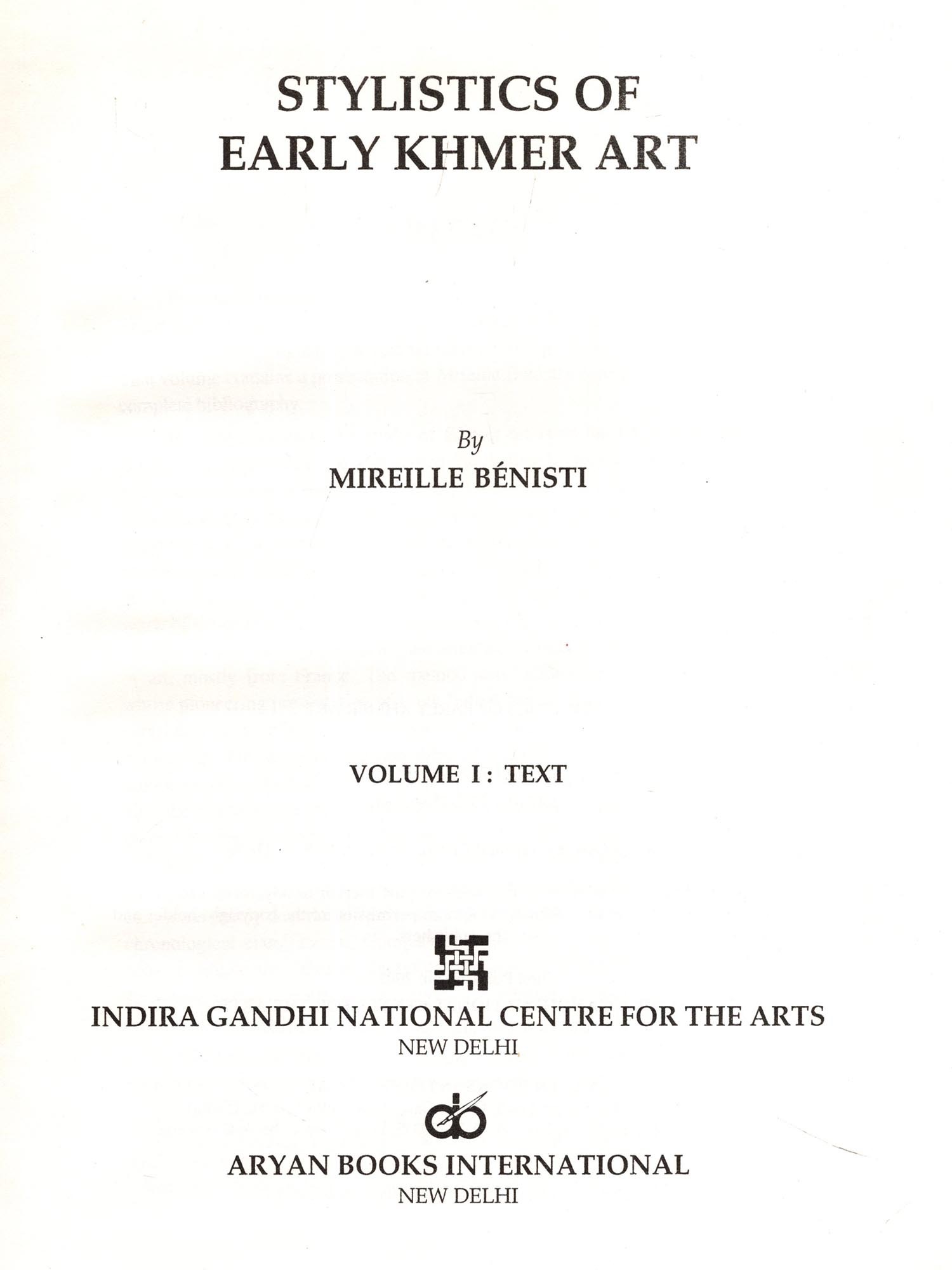Mrs. Fribourg has generously patronized the undertaking of the translation of Mireille Benisti's works on Khmer art, like the previous volume of her works on Buddhist art. We acknowledge her gesture as a precious contribution to the memory of her sister, Mireille Benisti, and also to the development of a promising field of research. Mrs. K. Thanikaimony has done the English translation, a painstaking task, considering the technical nature of the subject. As in the previous volume of translations, all the photographs reproduced in this volume are those published with the original text by Ecole Francaise d'Extreme-Orient and Arts Asiatiques. The photographic credit published in the original has been reprduced here. Most of the photographs were taken by Mireille Benisti herself and her collection is at present preserved by Ecole francaise d'Extreme-Orient. We extend our thanks to the Director of this French institution for authorizing the translation and publication by its Indian counterpart. We take pleasure in expressing our gratitude to Prof. N. R. Shetty, Member Secretary, for his readiness to accept this work in the prestigious series of Indira Gandhi National Centre for the Arts and Dr. Lalit Gujral for his zeal in directing the publication.