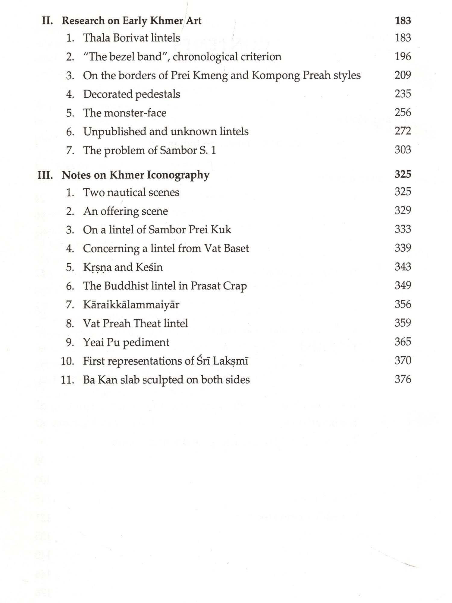 The present volume contains translations of Mireille Benisti major publications dealing with Khmer art, i.e. 7th and 8th centuries, the crucial period of the introduction of Indian religion and other components of Indian culture in the first well-organized kingdom of Khmer land. Considering numerous precise cases of relationship between Khmer and Indian motifs in that period, as well as the original rendering of Khmer artists, considering that no Khmer monument is a copy of an Indian monument, that it is a Khmer creation with an Indian source behind, in the absence of any document attesting the presence of Indian architects in Cambodia, nor of a visit of India by Khmer artists, Mireille Benisti proposed an hypothesis on the process of transfer of concepts and motifs: movable objects, such as statues, caskets, ritual objects etc. were transported from India to Khmer land and their decoration could have inspired local artists. In fact, Mireille Benisti's study is based mainly on material from immovable sources, temples etc. But she had at her disposal only a small number of movable objects found in excavations in both countries, and her field of investigation is only the early period of two centuries. Thus her hypothesis has to be put to the test of further exploration in more material. Her method of investigation has also to be extended to later periods. Contacts between Indian and south-east Asian countries have taken place at all times, as shown by M. Benisti herself, when she casually presents the exportation of the iconological theme of the Tamil saint, Karaikkalammayar, playing tala at the feet of Natesa to Khmer temples of 10th and 11th centuries. The approach thus initiated by her unveils an open field of future research.